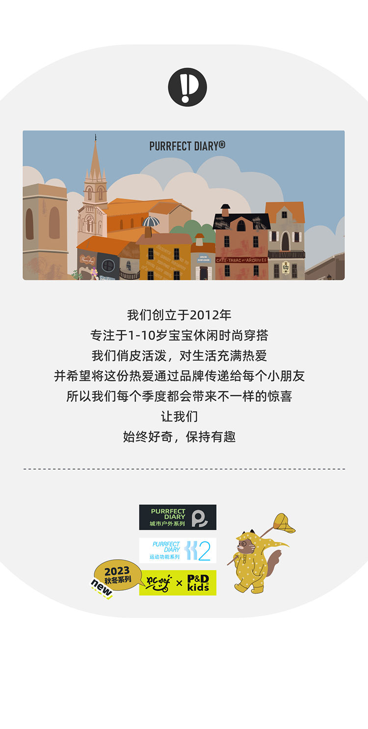 - Purrfect-Diary专注于贴近自然随性的穿着概念,轻奢平价的童装文化传播,在产品设计上更加注重婴童穿着的舒适性、安全性、更出众的国际化品牌,将欧美的育婴文化在中国进行深入的传播与推广。