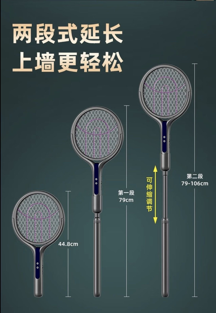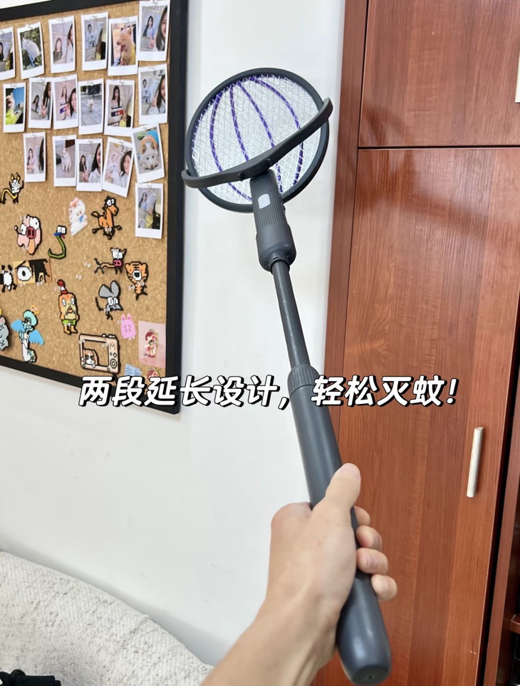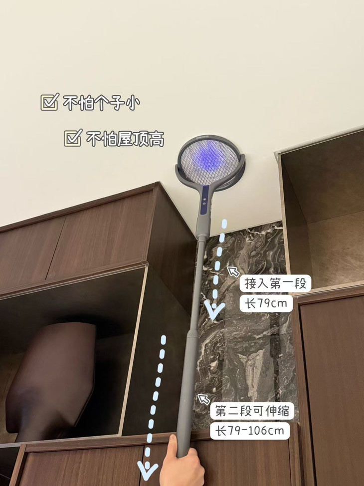 ✅ 可伸缩长杆 拉长够天花板、壁橱顶,高处蚊子一网打尽 ✅ 180°可折叠➕L形错位结构,网面无缝贴墙 贴合墙面死角,折叠后好收纳不占地方 ✅ 紫光诱蚊模式 夜里开诱蚊灯,自动抓蚊,不用手动追着打 ✅ 120MAh大容量电池长续航 充一次电可用30天 手持拍❗️立着诱蚊❗️伸缩够高❗️一物三用‼️
