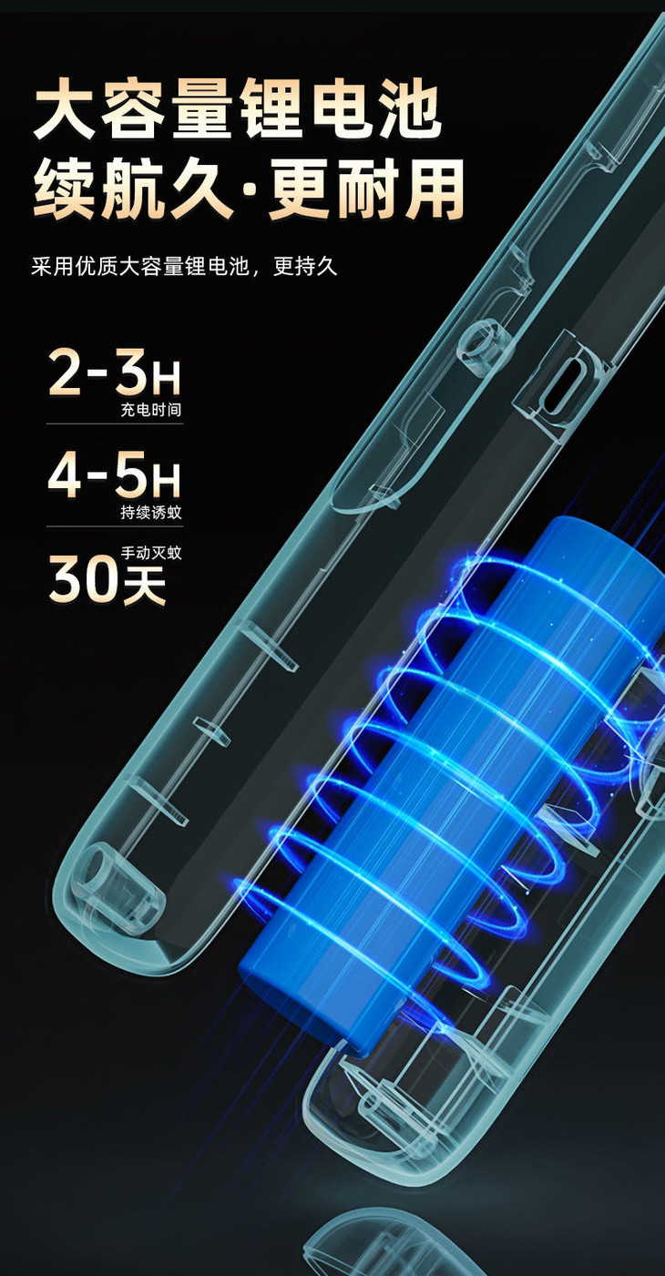 ✅ 1200mAh电池长续航,4h持续诱蚊,30天手动灭蚊 采用优质大容量锂电池,源源电量慢慢用 3-4h充电时间,4h持续诱蚊,30天手动灭蚊 内置1200mAh大容量优质电池 续航能力直接拉满 Type-C接口充电4小时左右 手动灭蚊模式能用上30天 持续诱蚊也能撑4小时 平时充一次电就能安心用大半个月 再也不用频繁找电源
