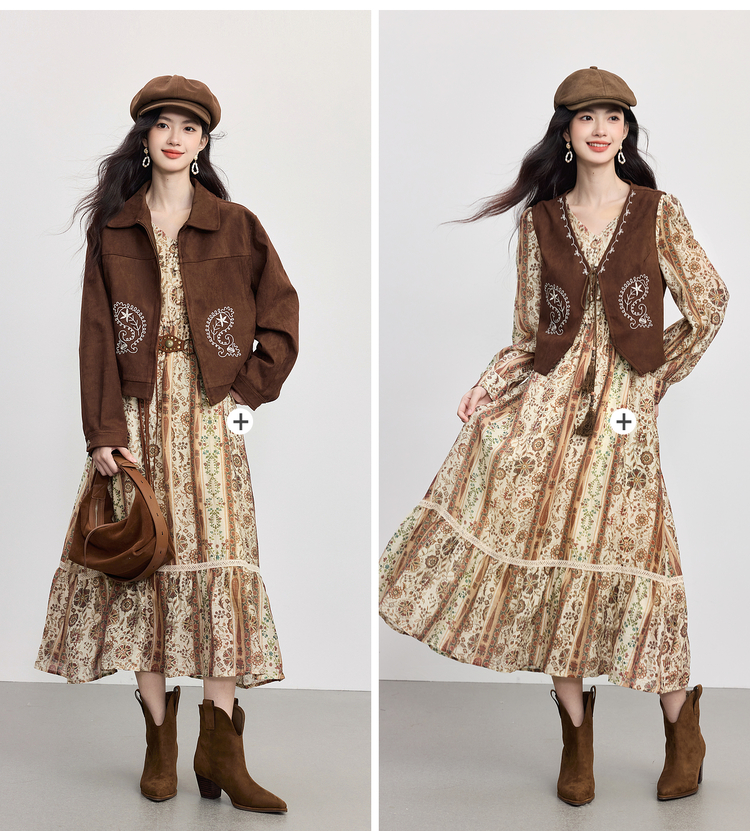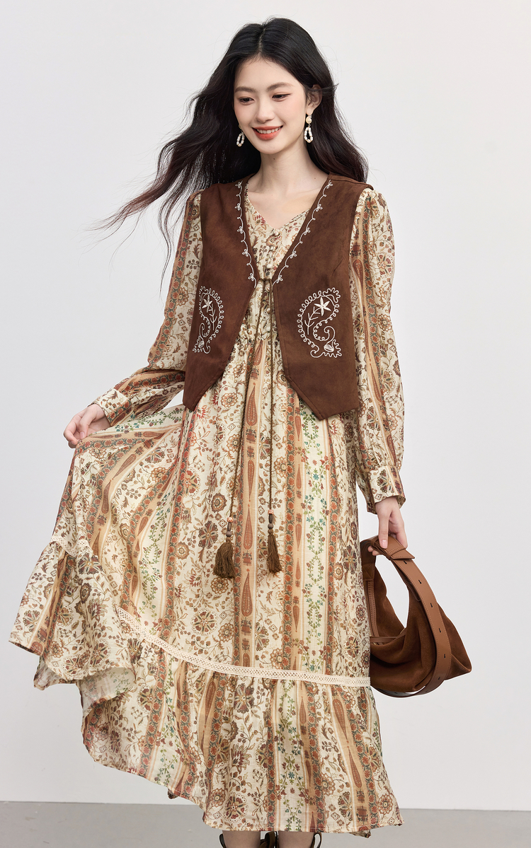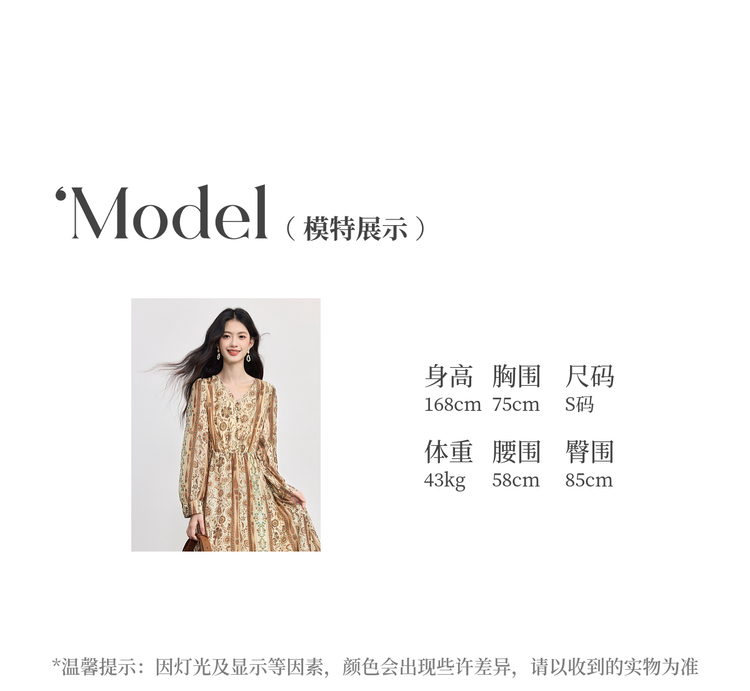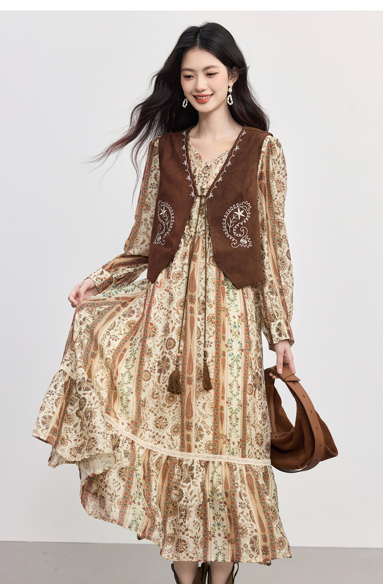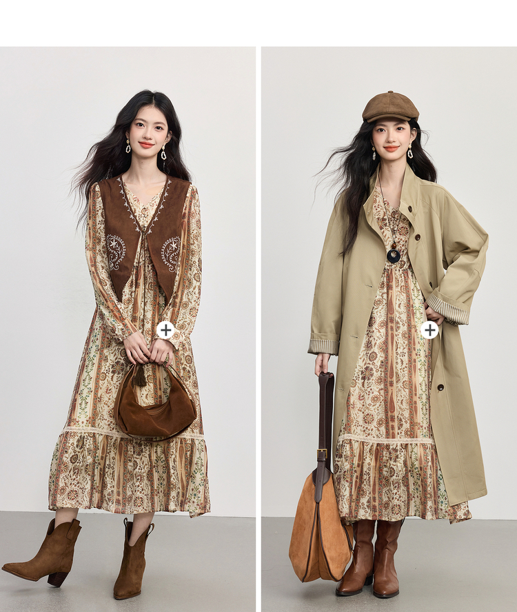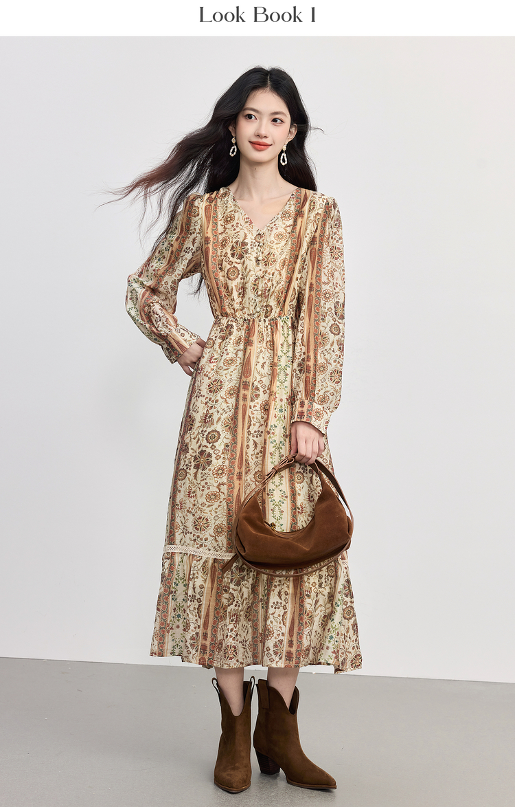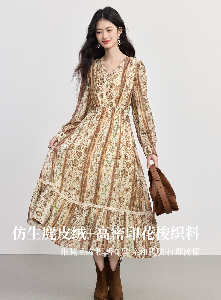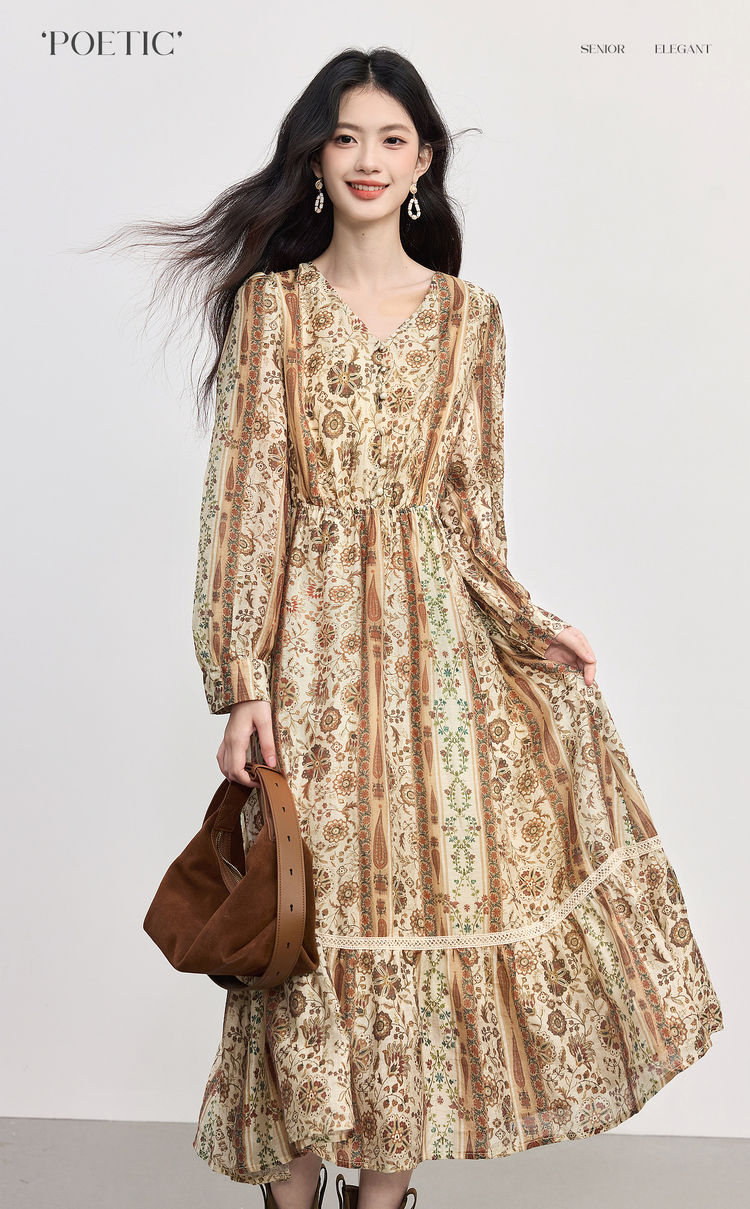 【09/26新品】熙世界「游牧曲线裙」波西米亚度假风复古印花V领连衣裙秋季女装