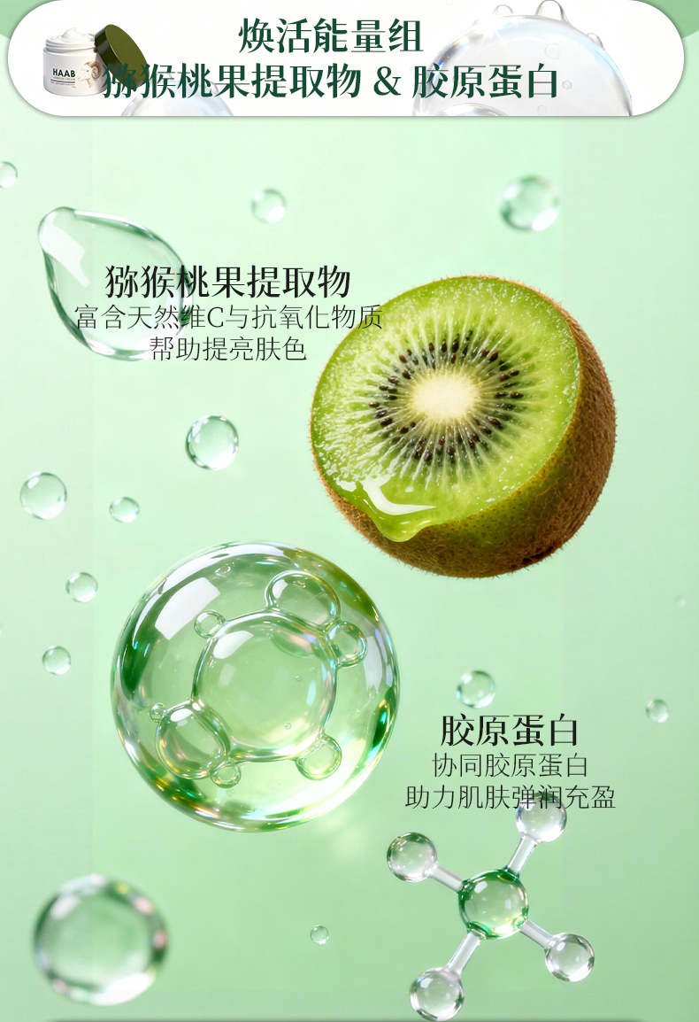 猕猴桃果提取物:富含天然维C与抗氧化物质,帮助提亮肤色,对抗氧化损伤。