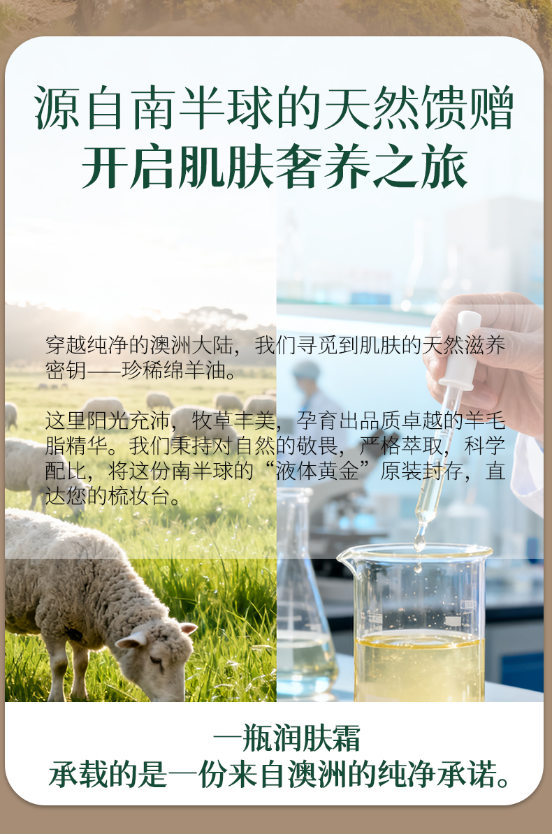 1. 灵魂核心「珍稀绵羊油」 天然亲肤,仿生修护:其成分与人体皮脂结构相近,能深度渗透,不仅在肌肤表面形成锁水膜,更能模拟健康皮脂膜,从根源强化屏障,实现「修护型保湿」。