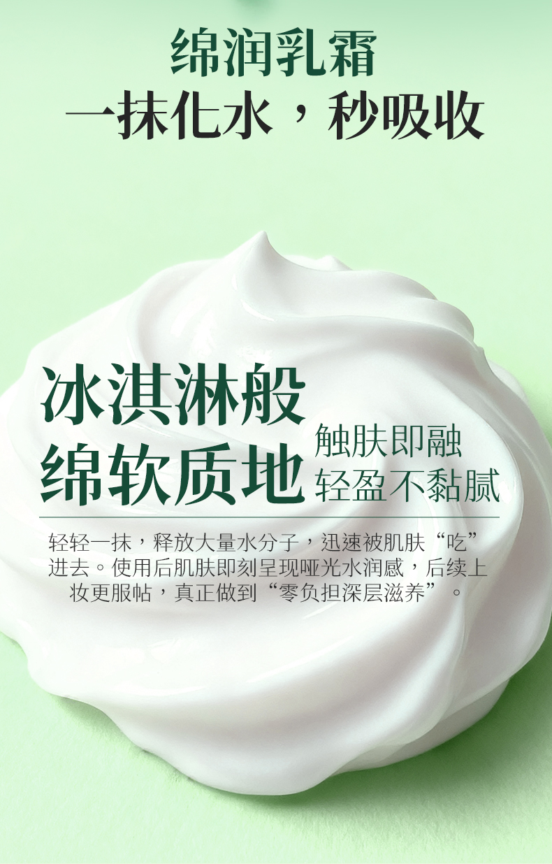 质地经特殊乳化工艺处理,呈现冰淇凌细腻绵密丝滑的乳霜状态,触肤即融且吸收迅捷,使用后肤感润泽不黏腻。适用于多种护理场景:作为日常面霜可强化屏障,作为周期护理可深度滋养,亦可用于妆前打底与身体干燥部位护理。