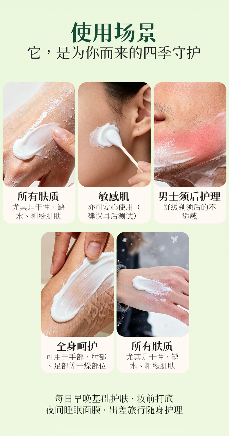 人群:所有肤质,尤其适合干性、极干性、敏感脆弱及屏障受损的肌肤。