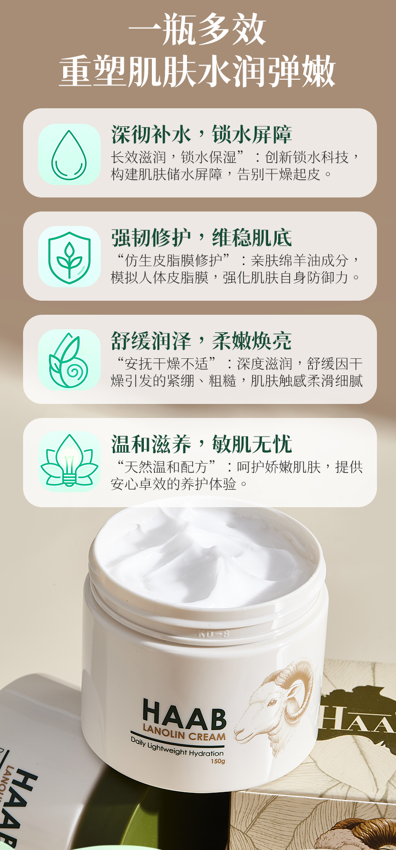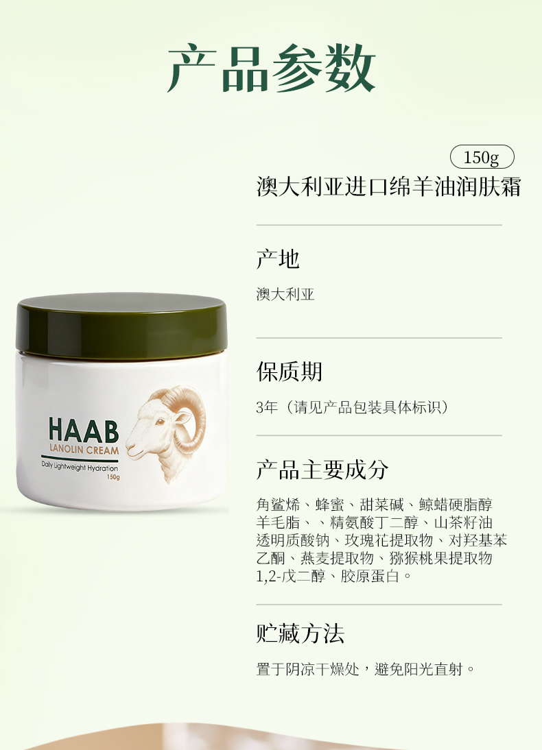 HAAB澳洲原装进口绵羊油润肤霜,"修护型保湿专家"。不同于普通保湿霜只做表面功夫,HAAB专注解决因屏障受损导致的根本性干燥问题。每瓶150g的容量经过精密测算,正好满足28天肌肤代谢周期的修护用量。绵羊油原料来自澳洲天然牧场,采用低温萃取工艺保留活性成分。确保羊毛脂纯度,真正做到敏肌可用。