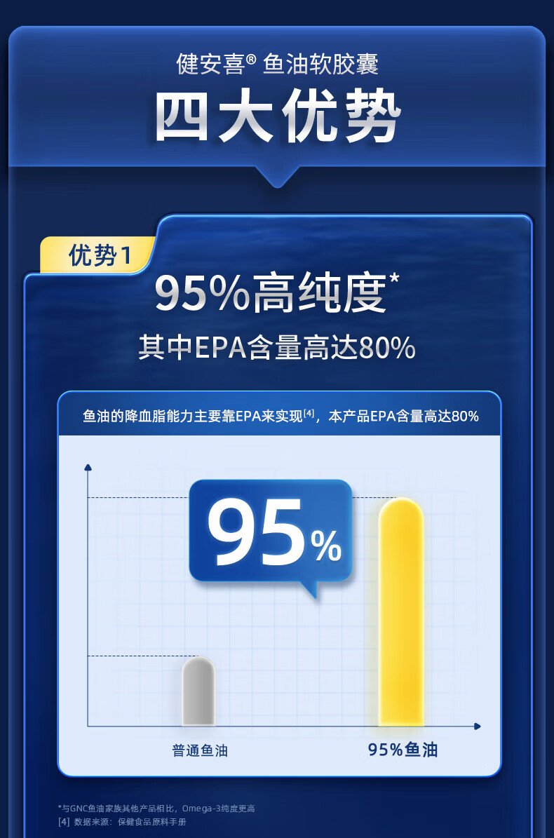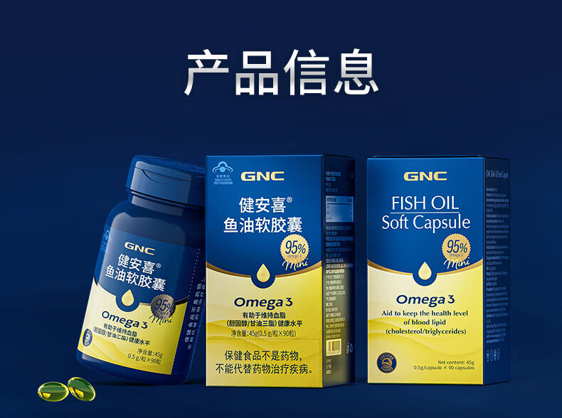 【国内版】GNC健安喜 鱼油软胶囊 90粒 95%纯度 呵护心脑眼