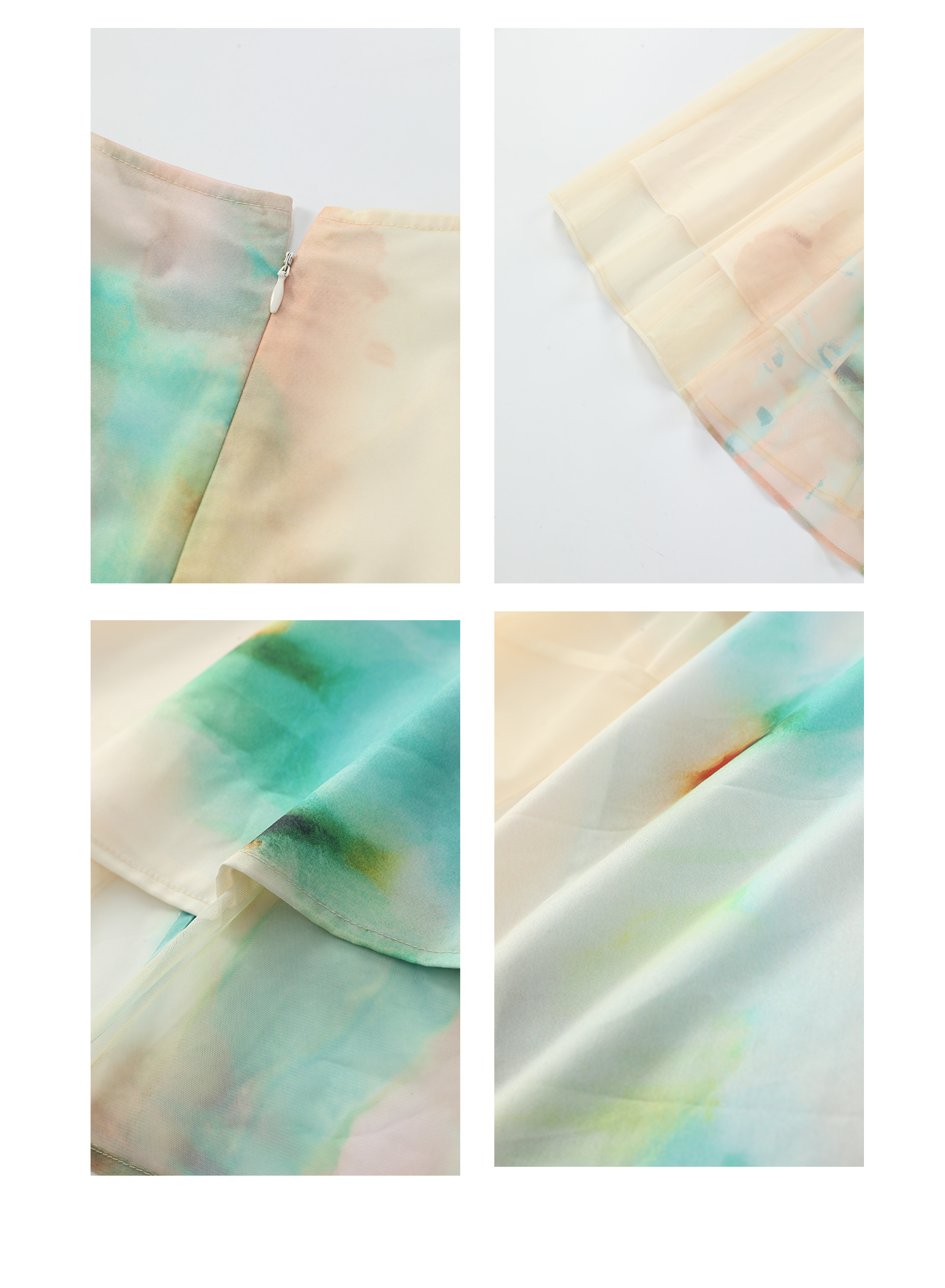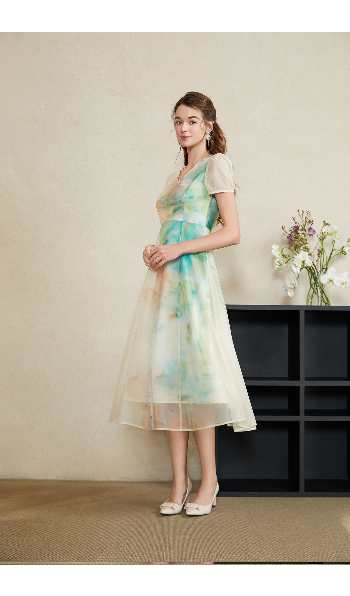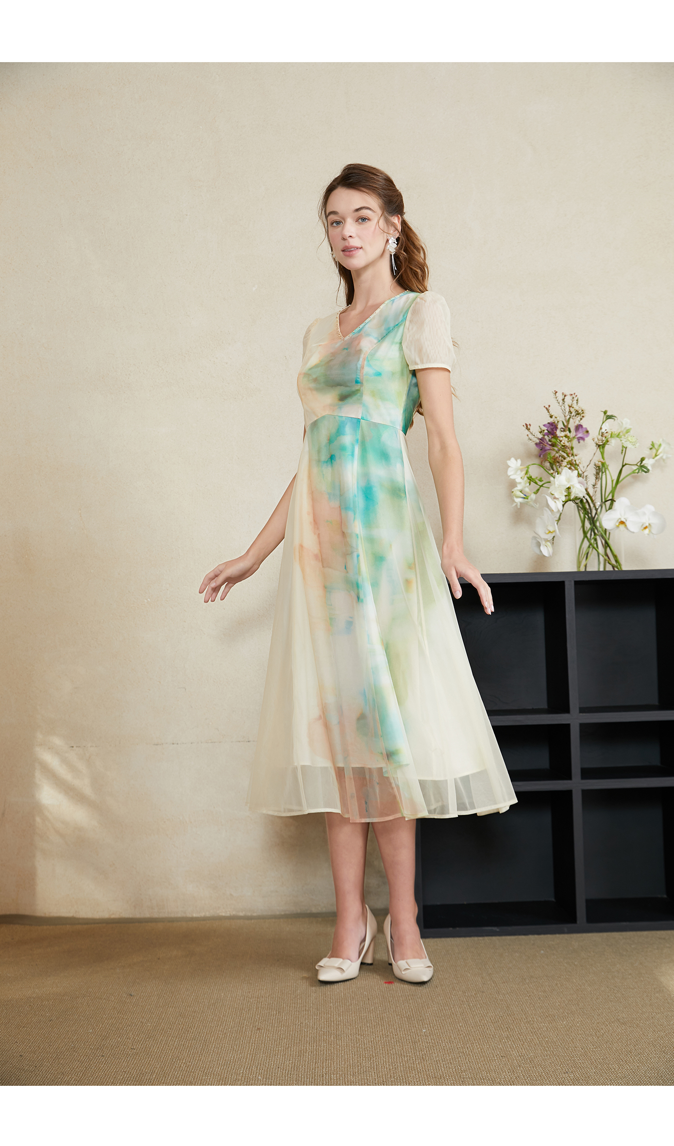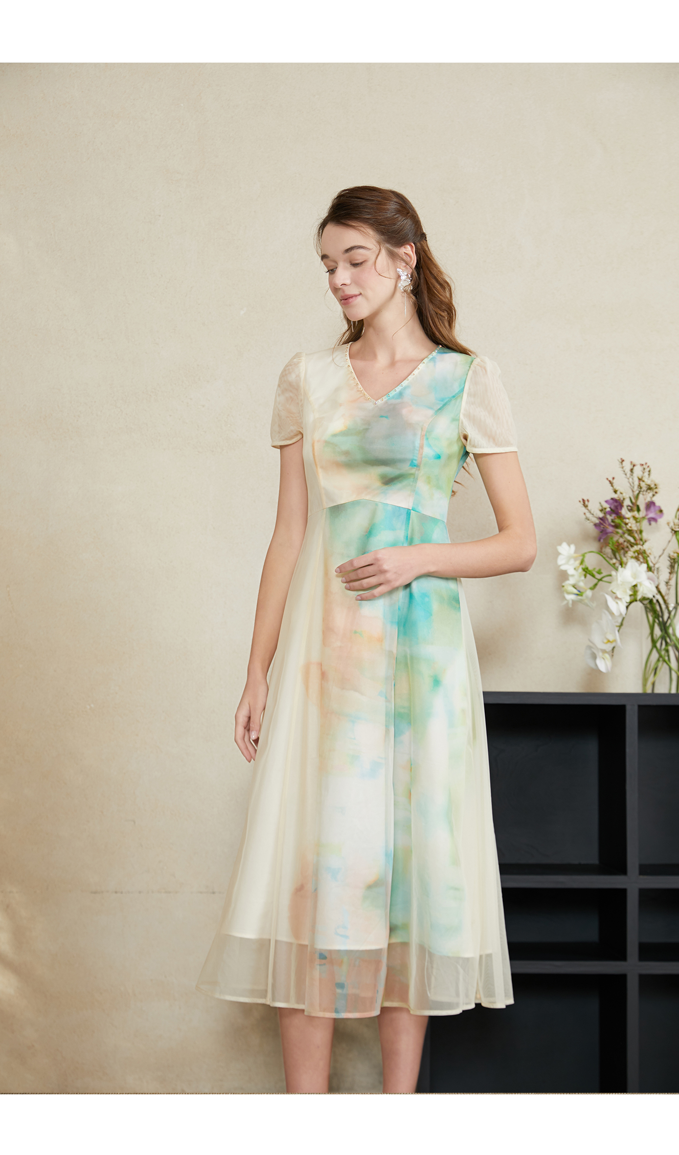 司歌水墨印花渐变网纱弹力短袖连衣裙A911250X