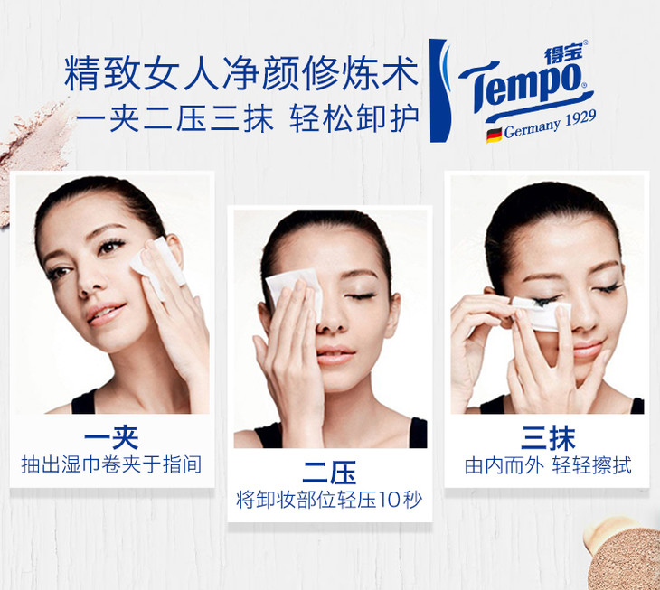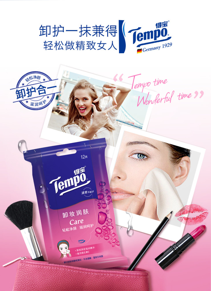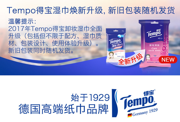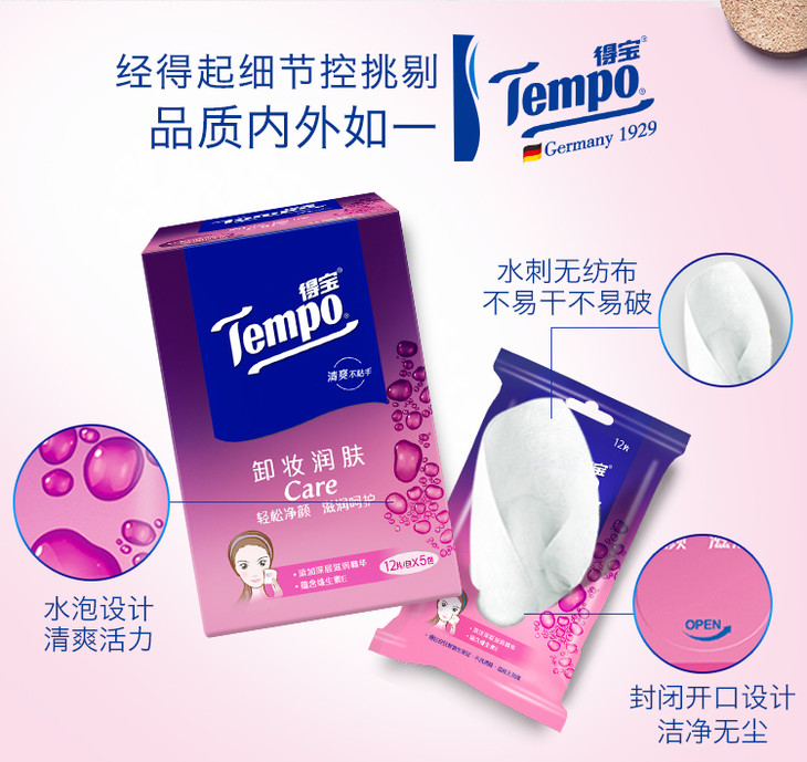 Tempo得宝卸妆湿巾12片/包x5包盒装深层洁净无酒精卸妆巾湿纸巾便携装