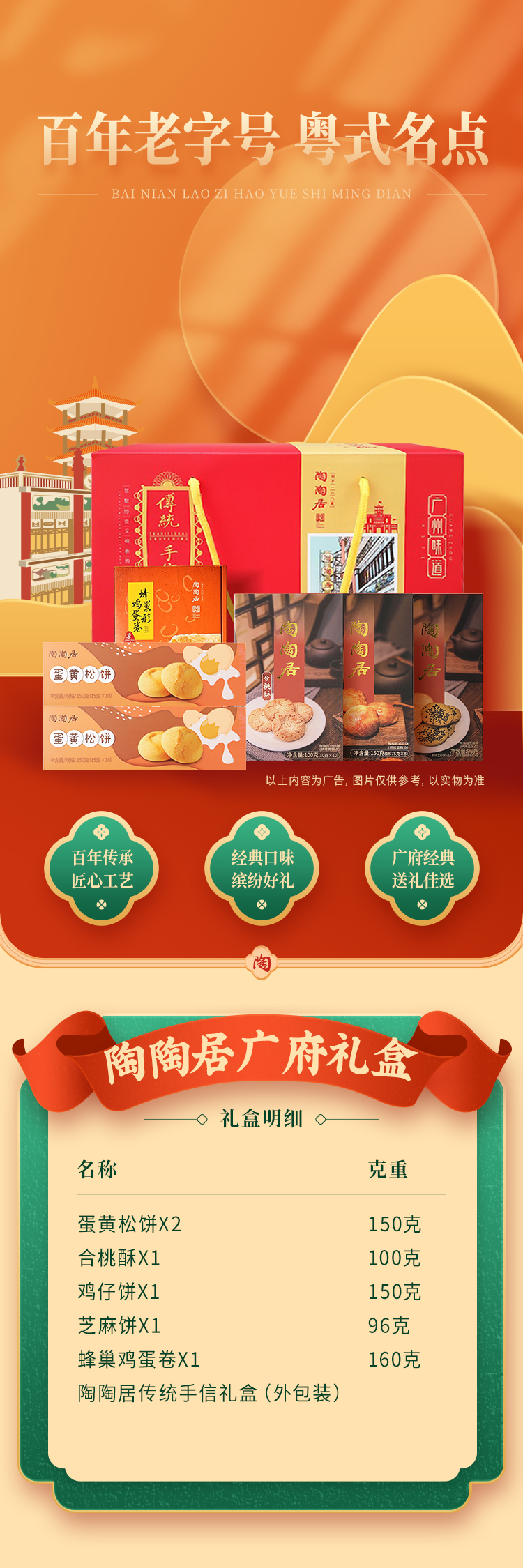 【老字号】陶陶居广府礼盒 蛋黄松饼、合桃酥、鸡仔饼、芝麻饼、蜂巢鸡蛋卷 806克/箱【包邮】