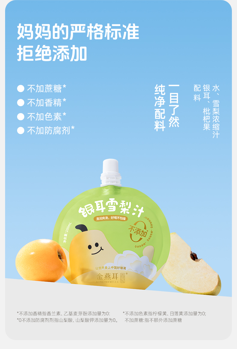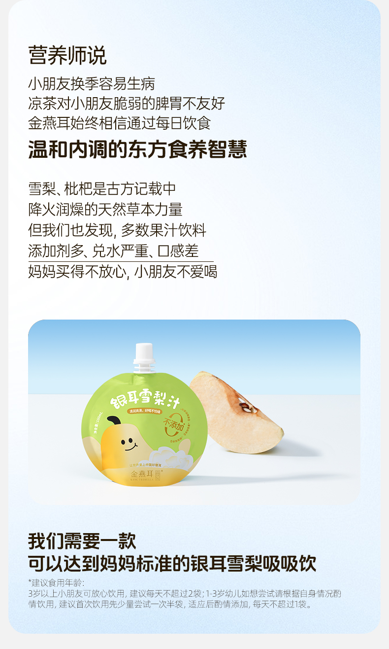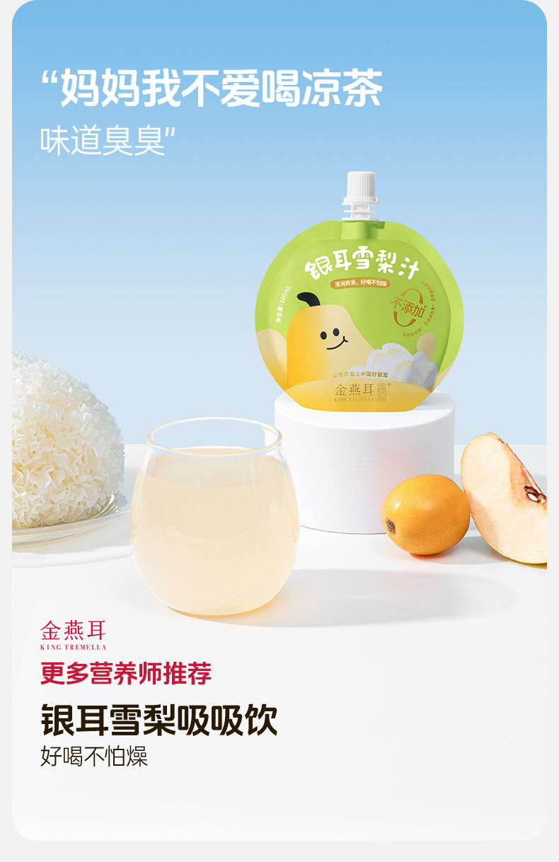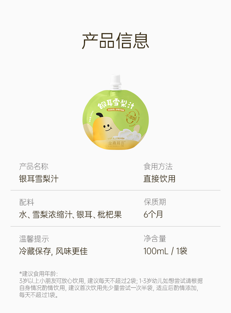 金燕耳银耳枇杷雪梨汁吸吸饮 ≥90%果汁含量 配方干净拒绝勾兑拒绝添加 甜酸口感宝宝更爱喝 (快递注意:单箱单箱发货,购买多箱的将分多个快递)