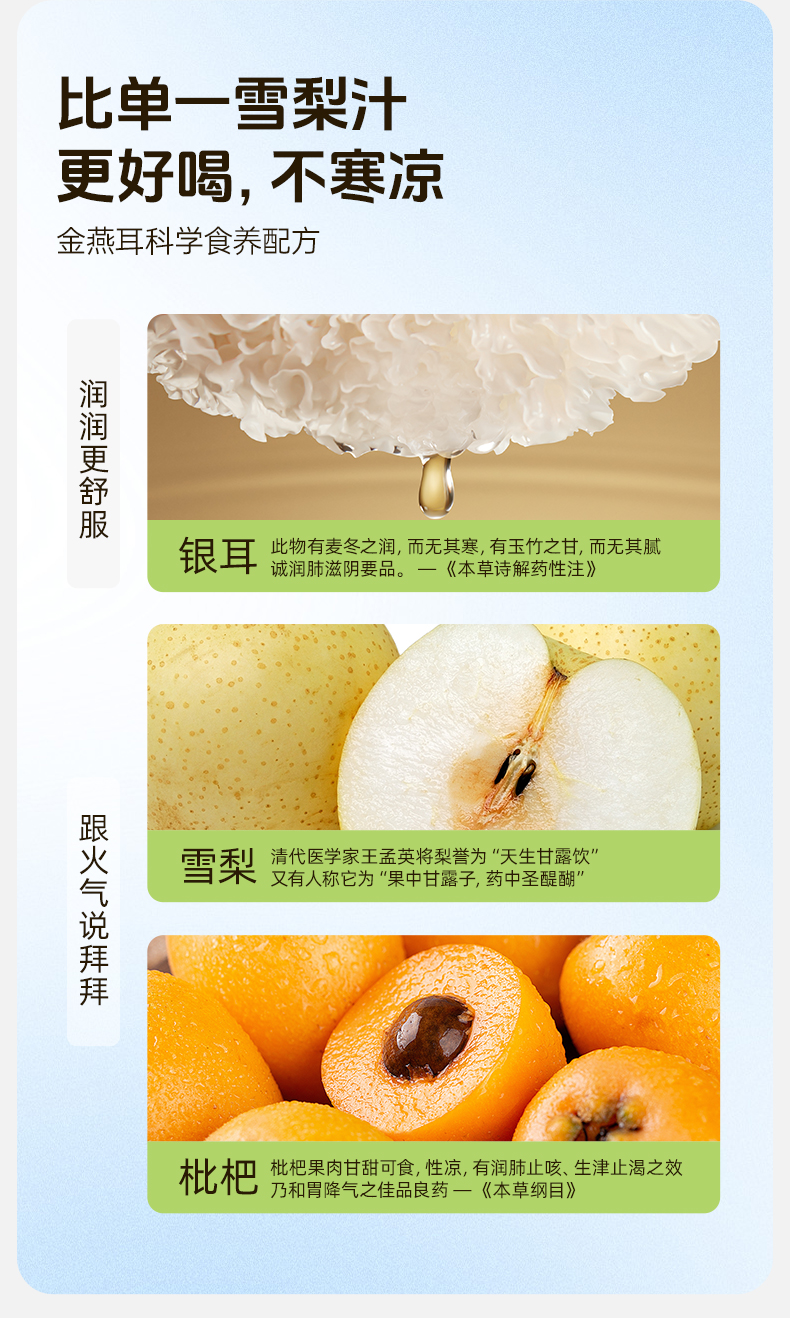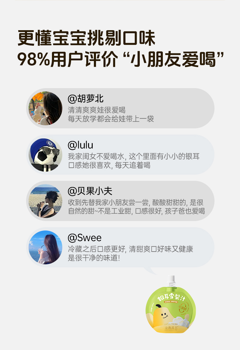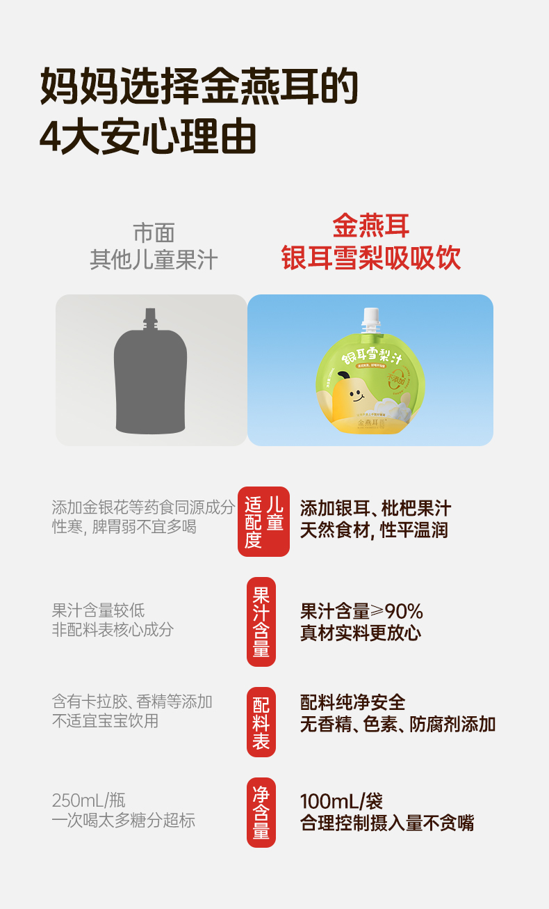 金燕耳银耳枇杷雪梨汁吸吸饮 ≥90%果汁含量 配方干净拒绝勾兑拒绝添加 甜酸口感宝宝更爱喝 (快递注意:单箱单箱发货,购买多箱的将分多个快递)