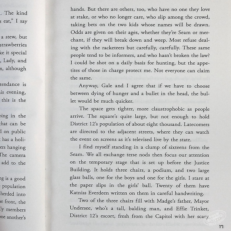 In the ruins of a place once known as North America lies the nation of Panem, a shining Capitol surrounded by twelve outlaying districts. The Capitol is harsh and cruel and keeps the districts in line by forcing them all to send one girl and one boy between the ages of twelve and eighteen to participate in the annual Hunger Games, a fight to the death on live TV. Sixteen-year-old Katniss Everdeen, who lives alone with her mother and younger sister, regards it as a death sentence when she is forced to represent her district in the Games. But Katniss has also resolved to outwit the creators of the games. To do that she will have to be the last person standing at the end of the deadly ordeal, and that will take every ounce of strength and cunning she has.