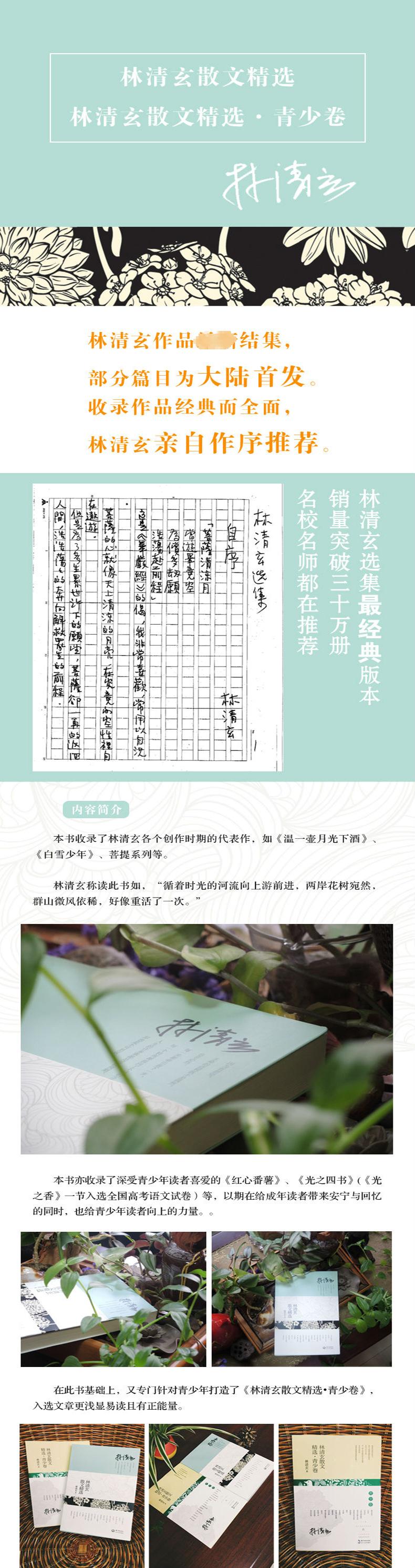 《林清玄散文精选》亦收录了深受青少年读者喜爱的《红心番薯》、《光之四书》(《光之香》一节入选全国高考语文试卷)等,以期在给成年读者带来安宁与回忆的同时,也给青少年读者向上的力量。