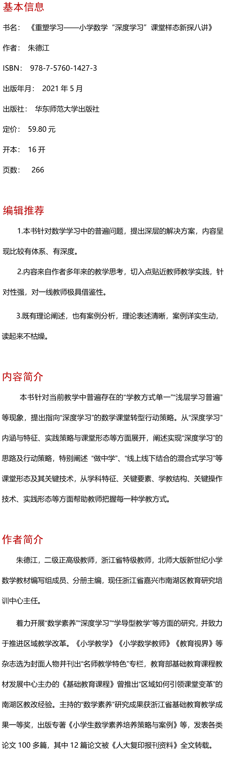 重塑学习 小学数学深度学习课堂样态新探八讲 大夏书系