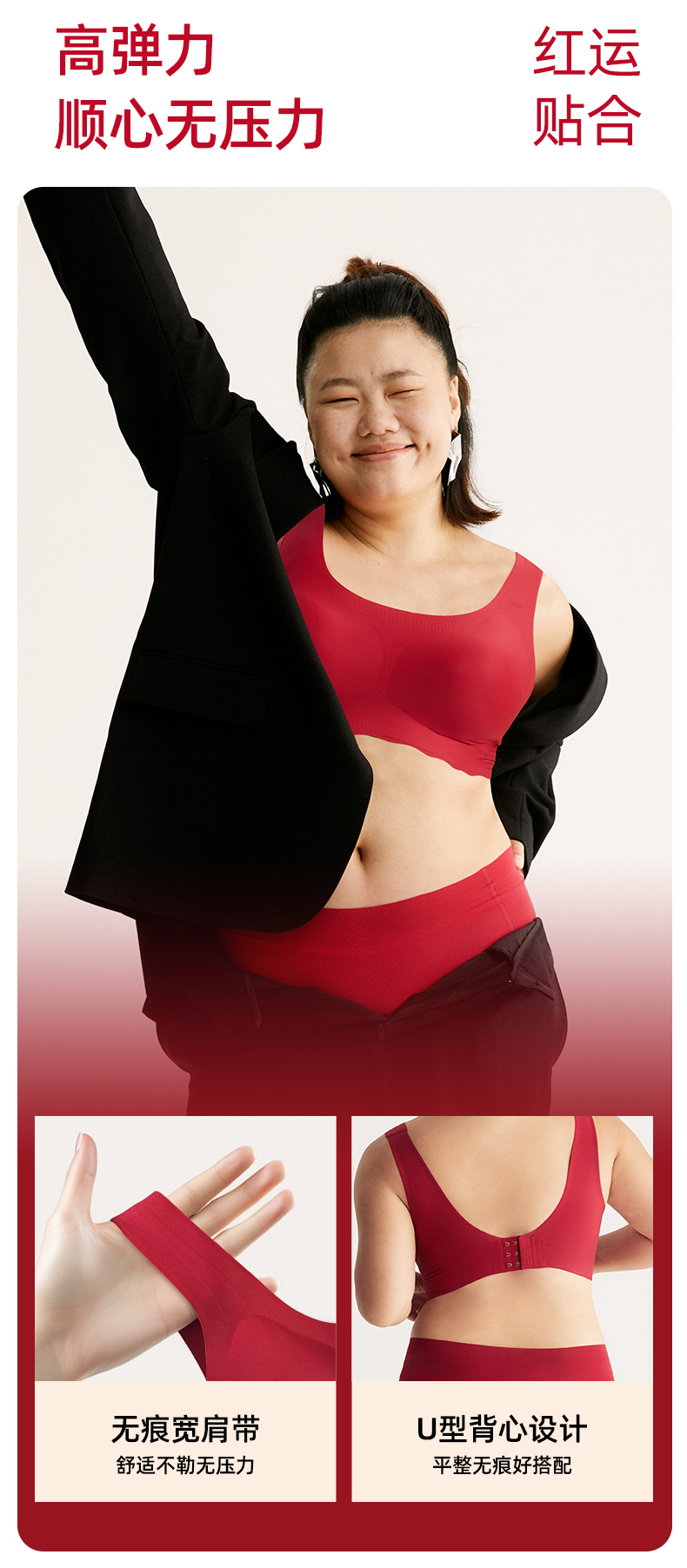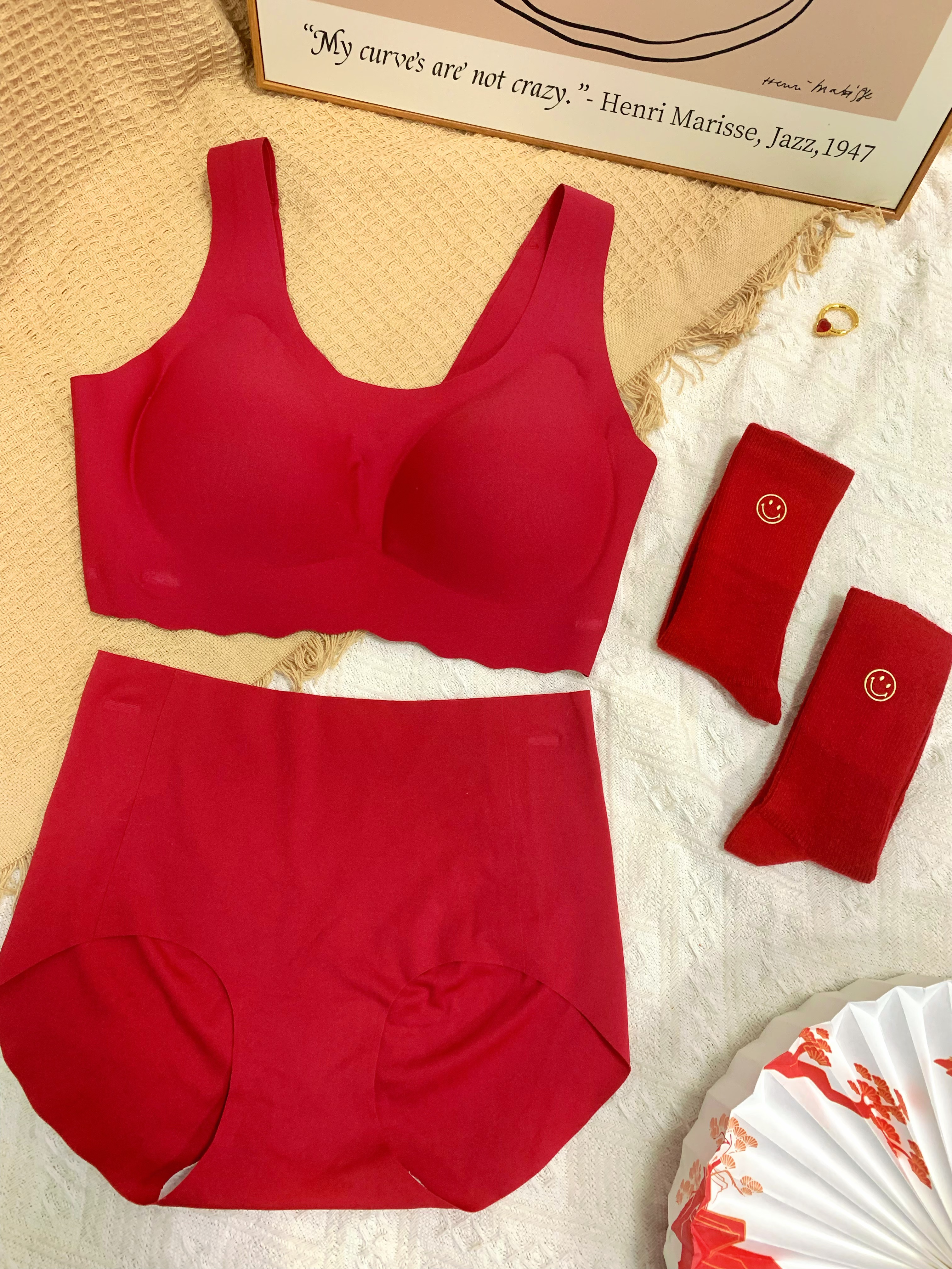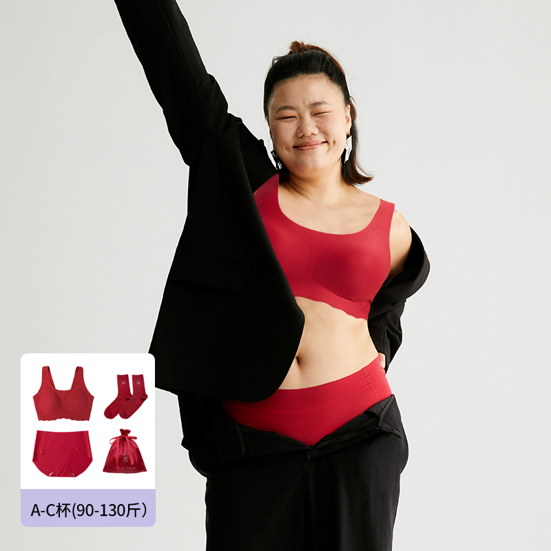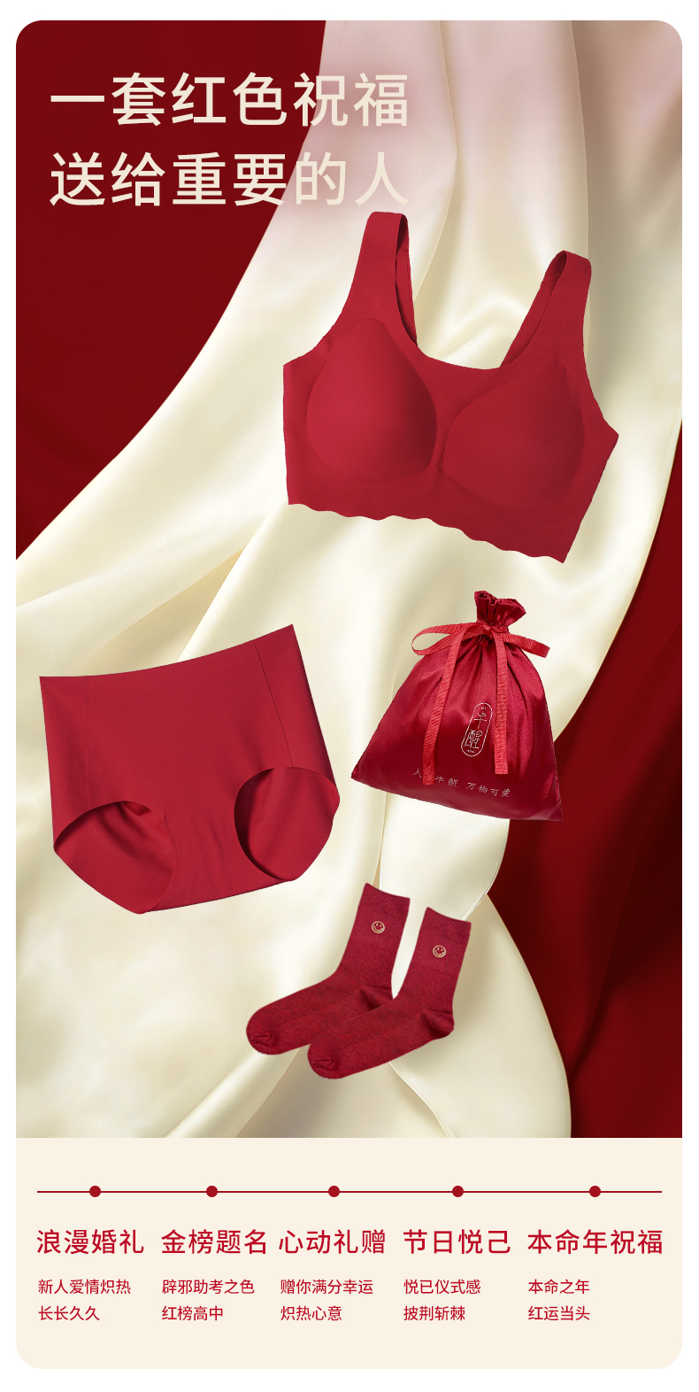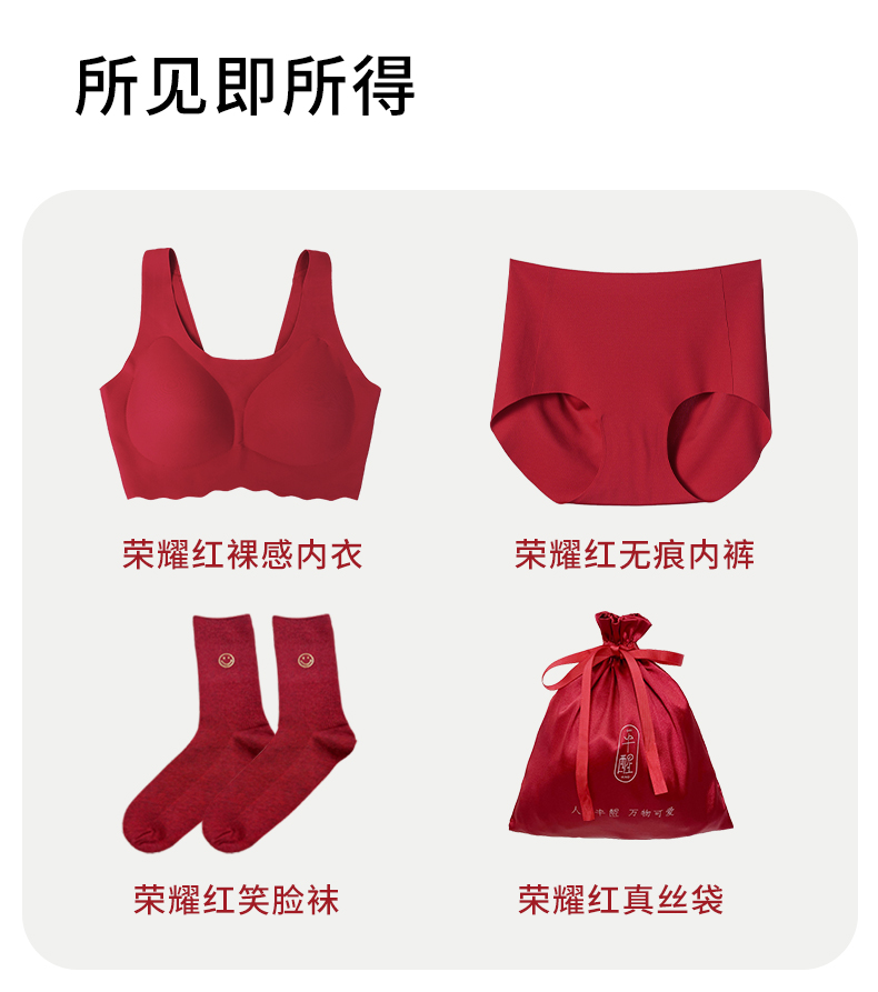 *【半醒】本命年内衣礼盒4件套荣耀红裸感宽肩带背钩款无痕内裤羊毛保暖袜可循环收纳袋
