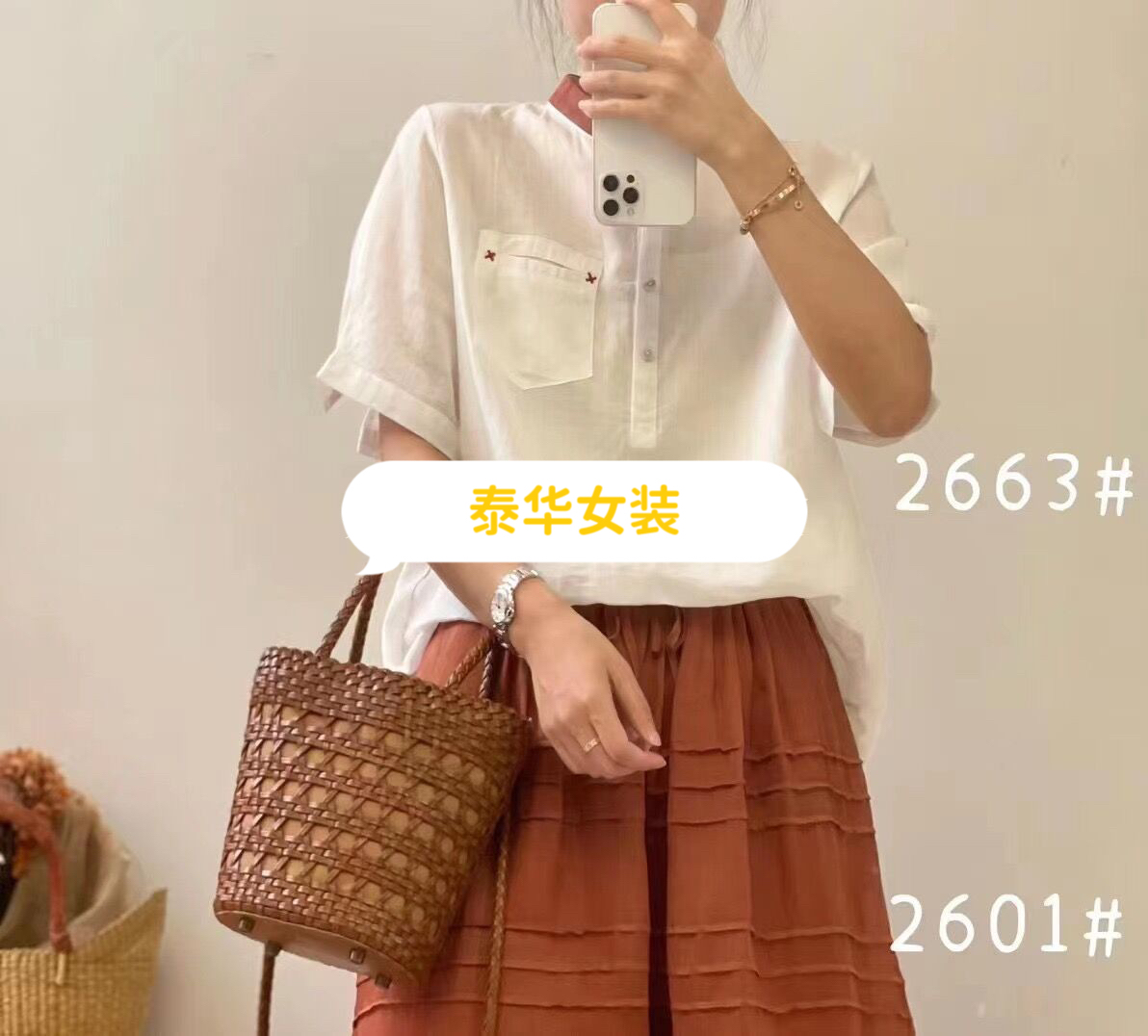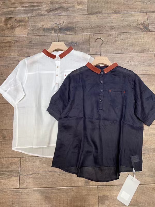 2663 # 白 均码 拼色翻领苎麻衬衫 半开扣宽松薄款短袖