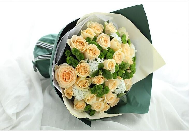夏日恋曲---香槟玫瑰33枝、绿色小雏菊8枝、白色石竹梅5枝、栀子叶3枝 白色雪梨纸1张、米白色平面纸1张、墨绿色条纹纸1.5张、白绿粗条纹罗文带1米(1143)