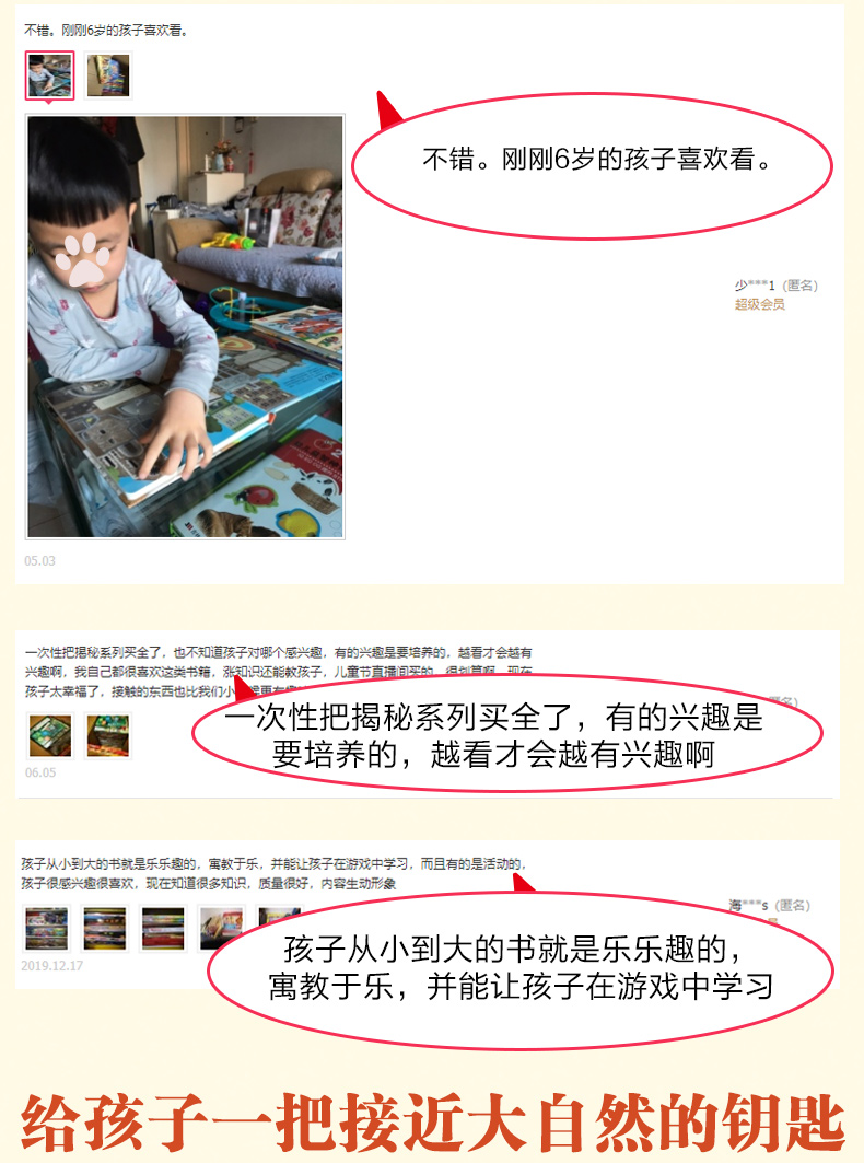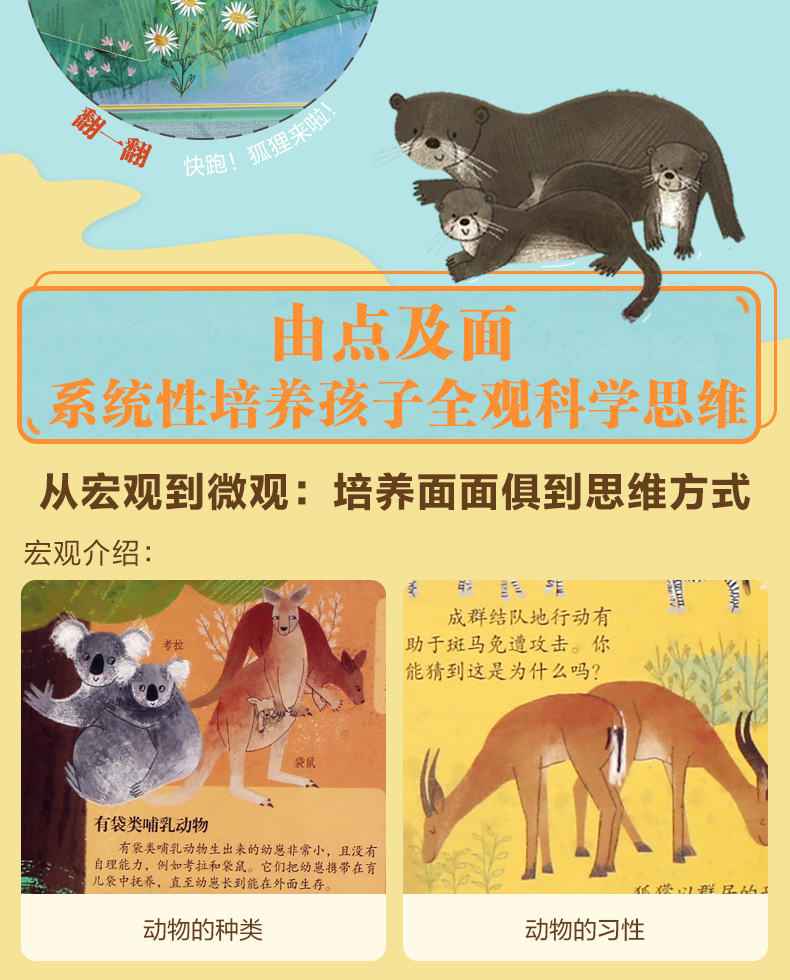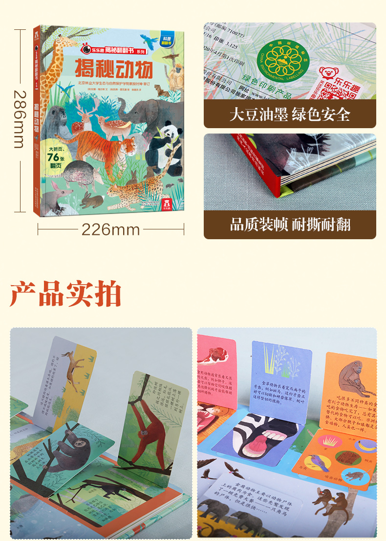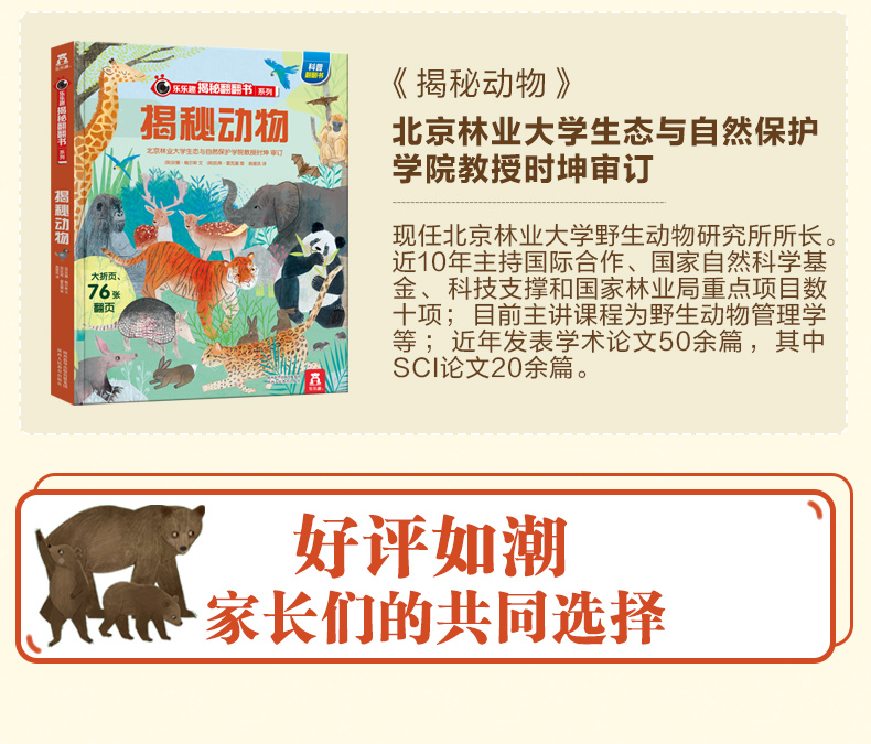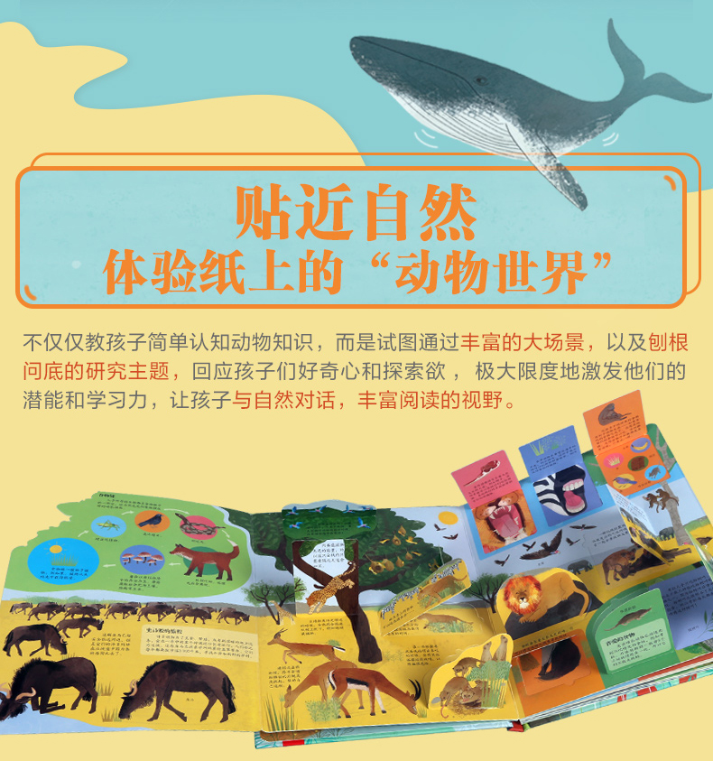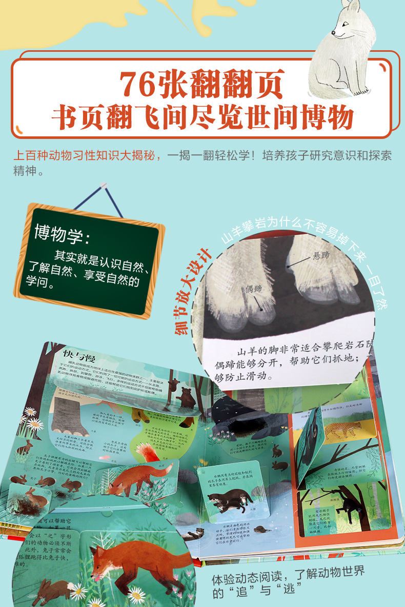 主题清晰,内容丰富,场景式呈现动物小百科; 生动有趣的插画,巧妙的翻页设计,让孩子手脑互动,轻松认知各种动物; 76张趣味翻页+2个大折页,互动阅读,让孩子感受动物世界的多姿多彩。 权威专家审订,确保知识点准确性。 大开本精装设计,绿色环保印刷,带给读者舒适安全的阅读体验。