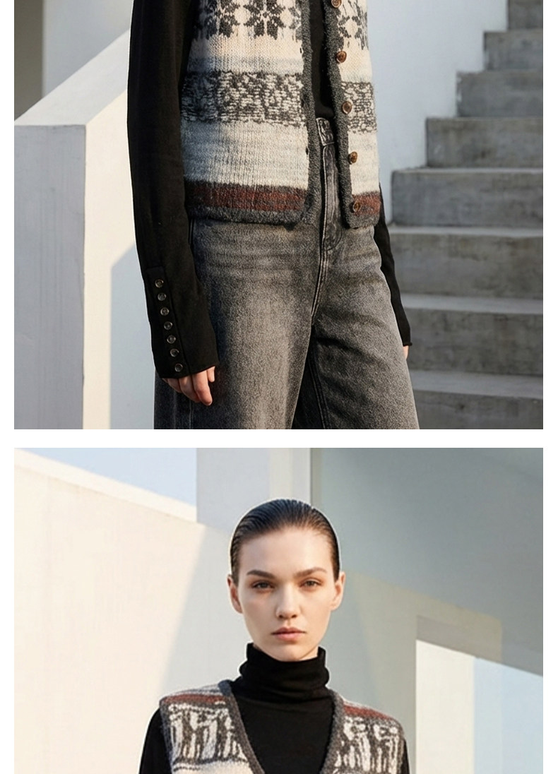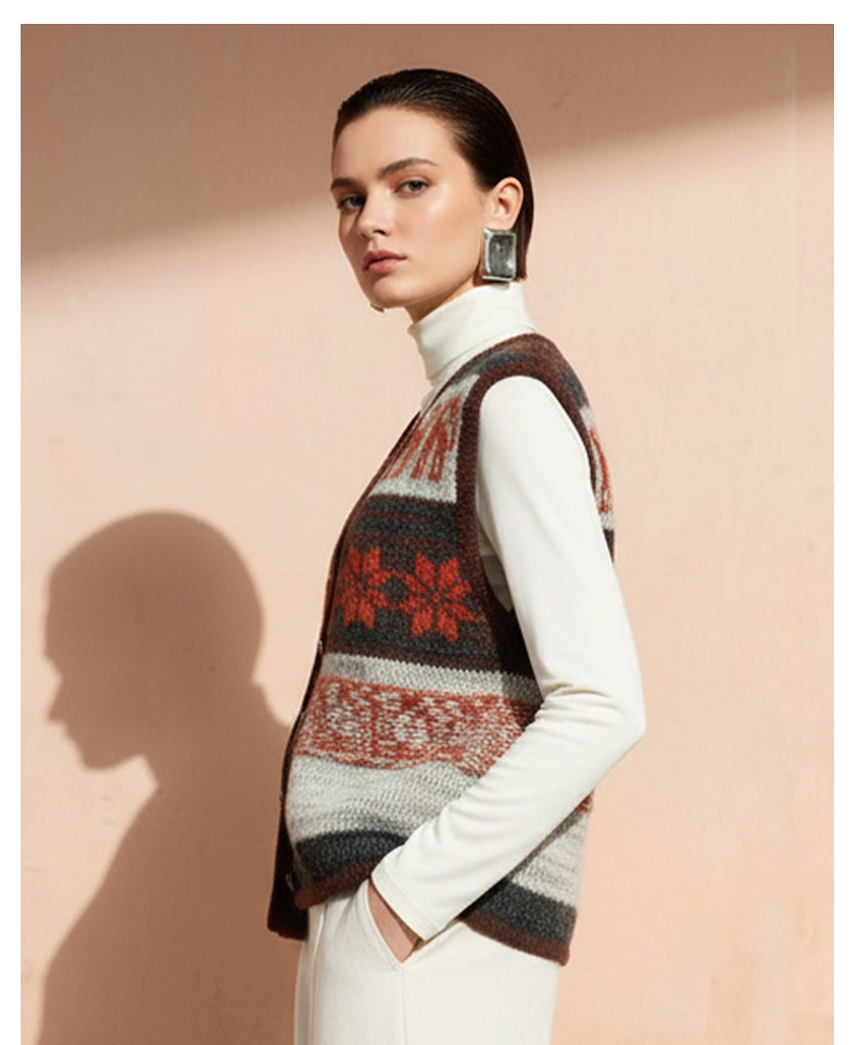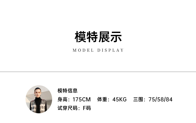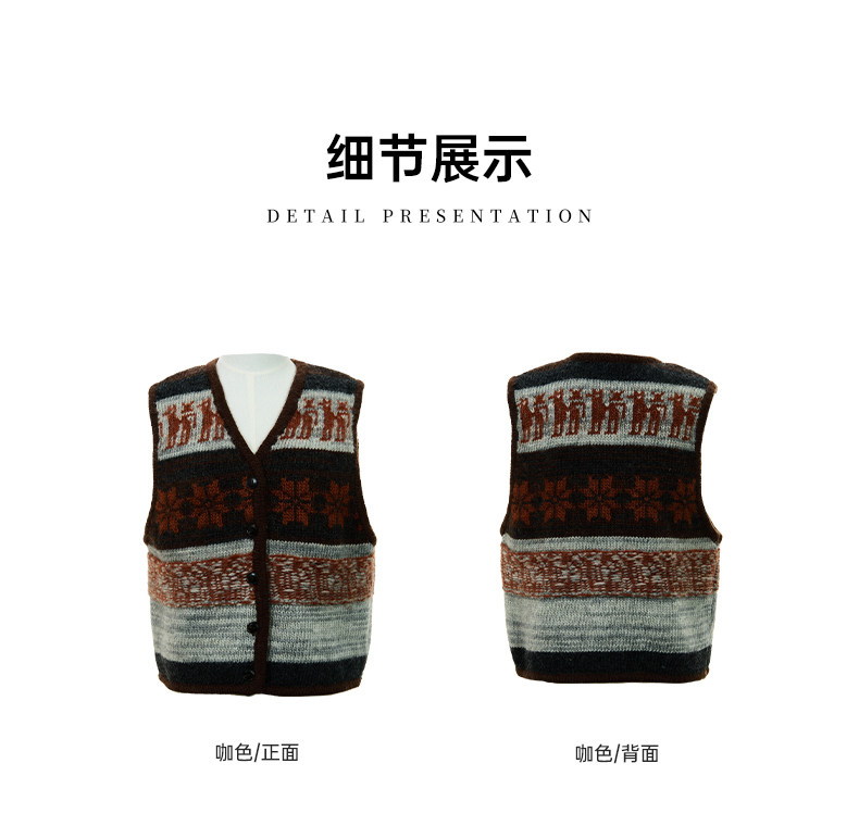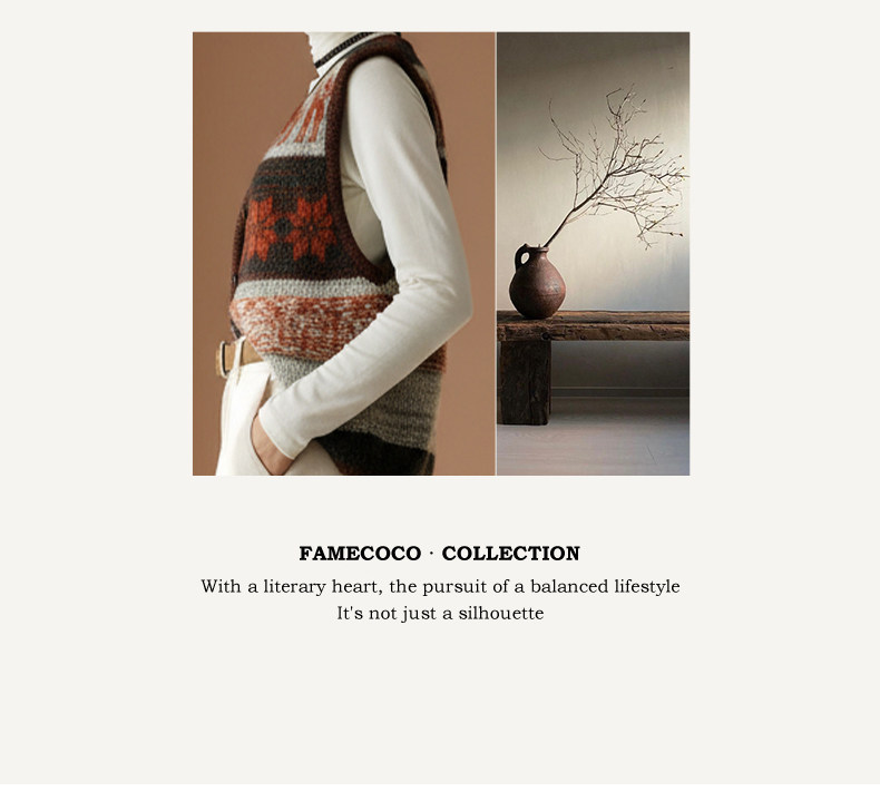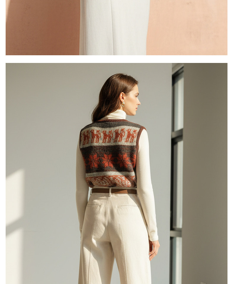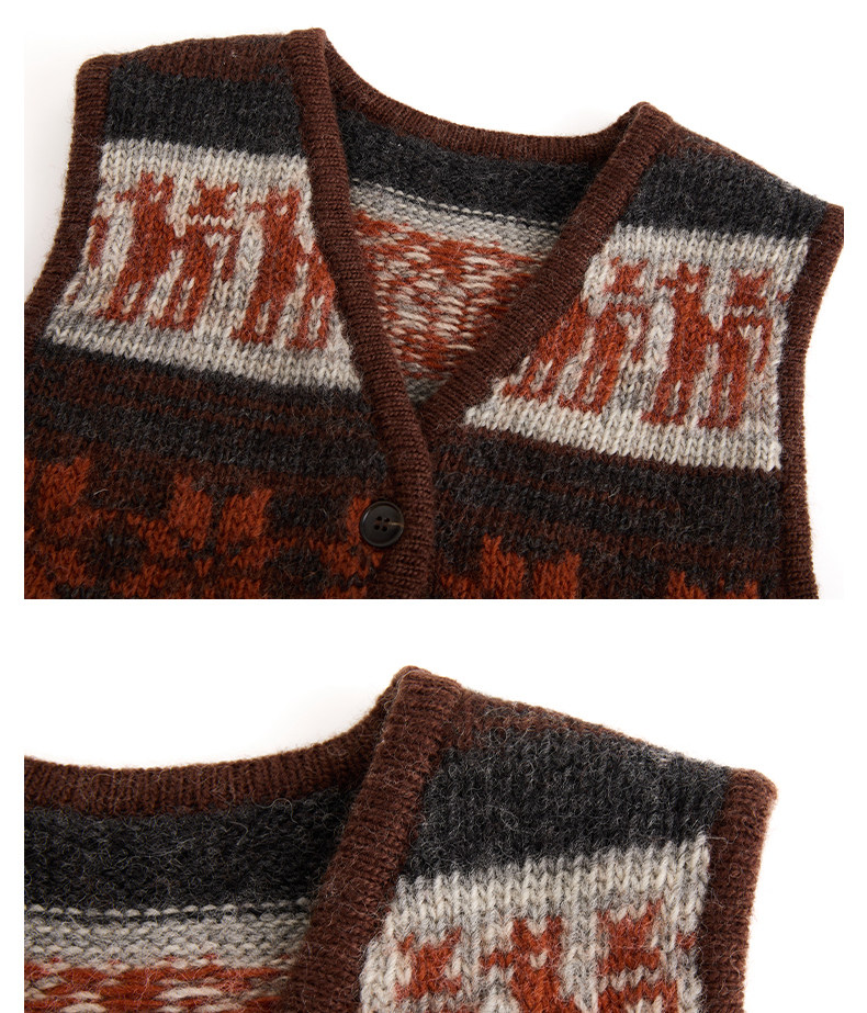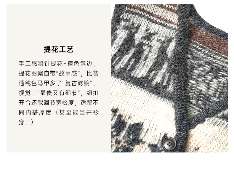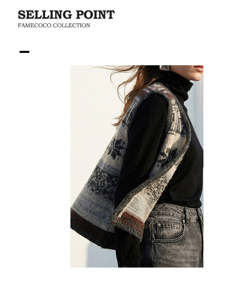 Famecoco范可儿纯羊毛复古文艺粗针提花V领叠穿马甲短款FAD8CA105