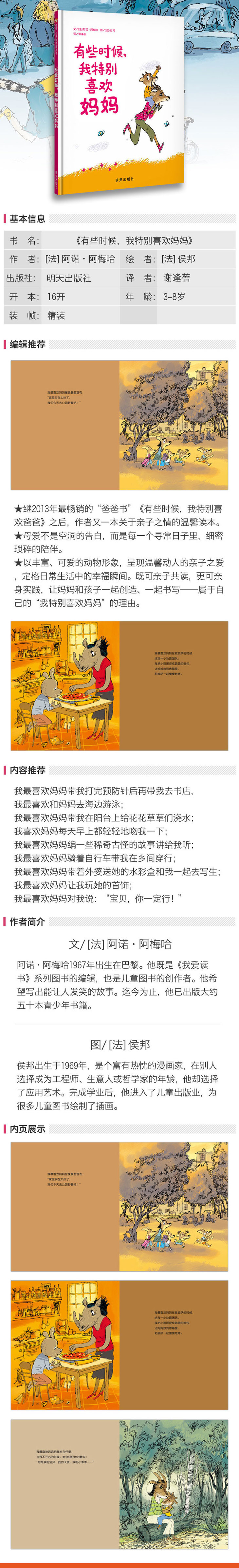 继《有些时候,我特别喜欢爸爸》之后,作者又推出了《有些时候,我特别喜欢妈妈》,继续讲述母子之间温馨、日常的生活片断,为孩子说出“我特别喜欢妈妈”的理由。