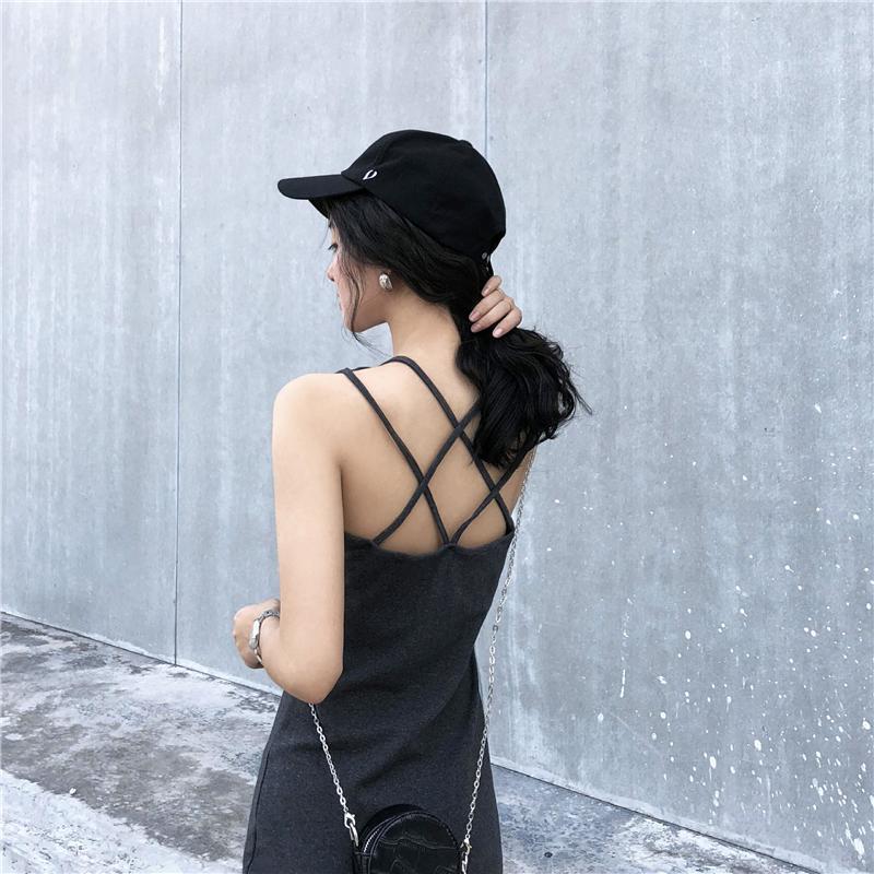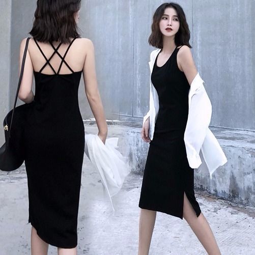 黛唯梵2022夏季新款露背吊带裙百搭连衣裙女夏季打底修身显瘦小黑裙中长款背带裙子潮