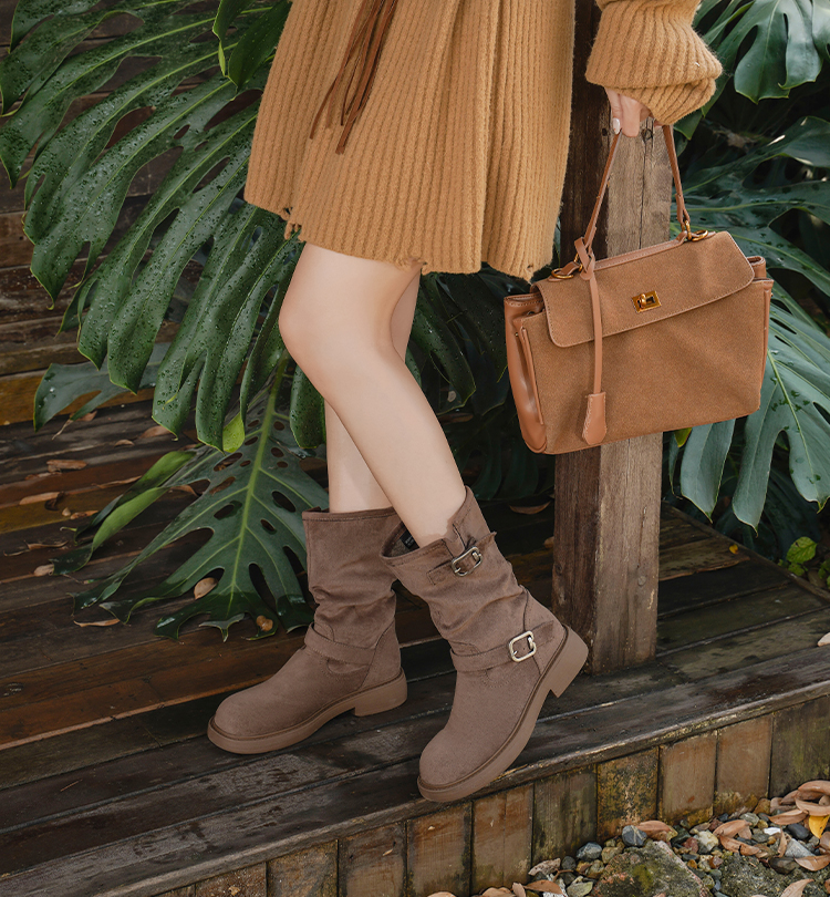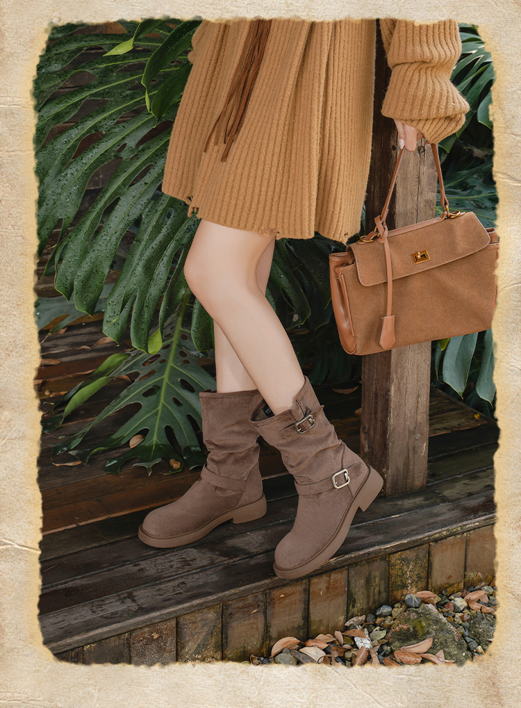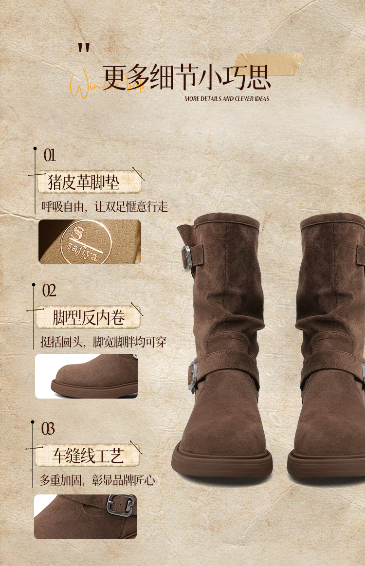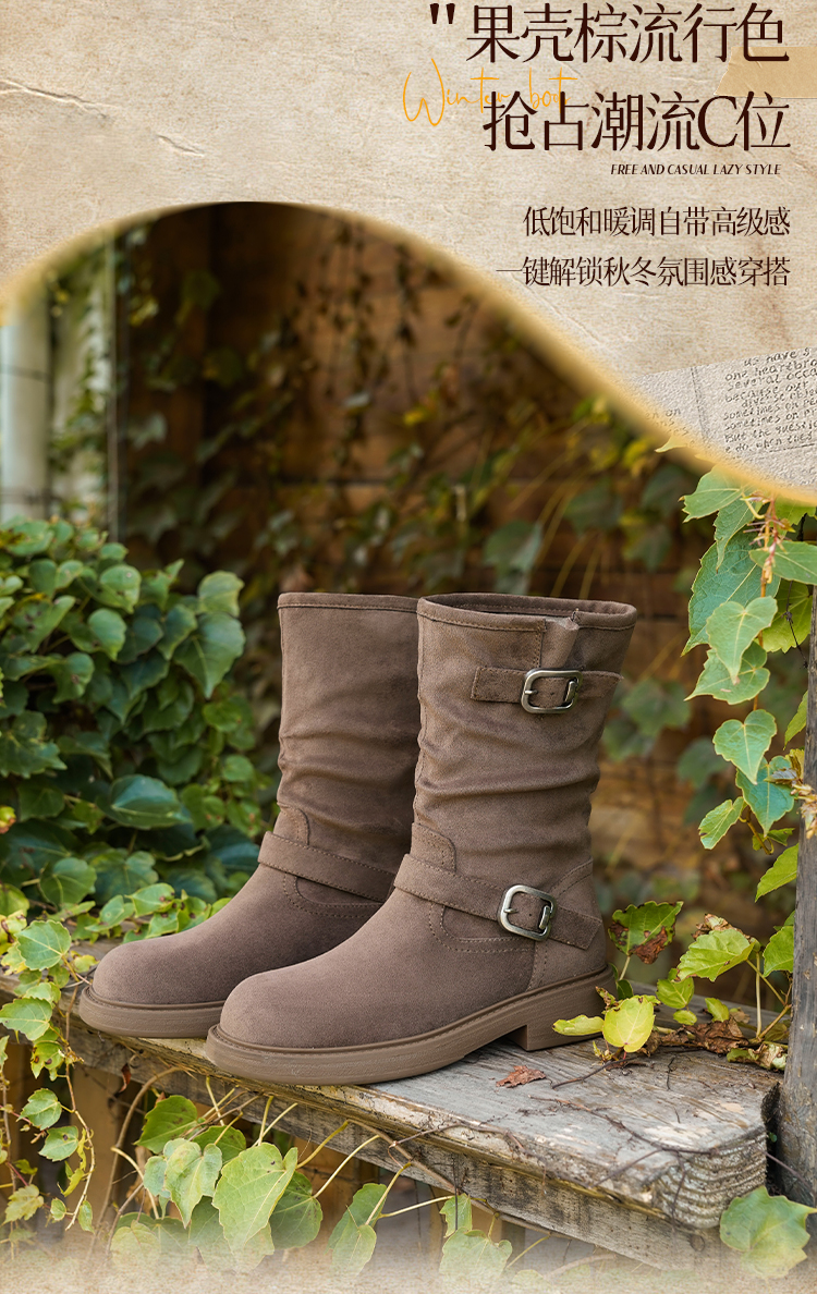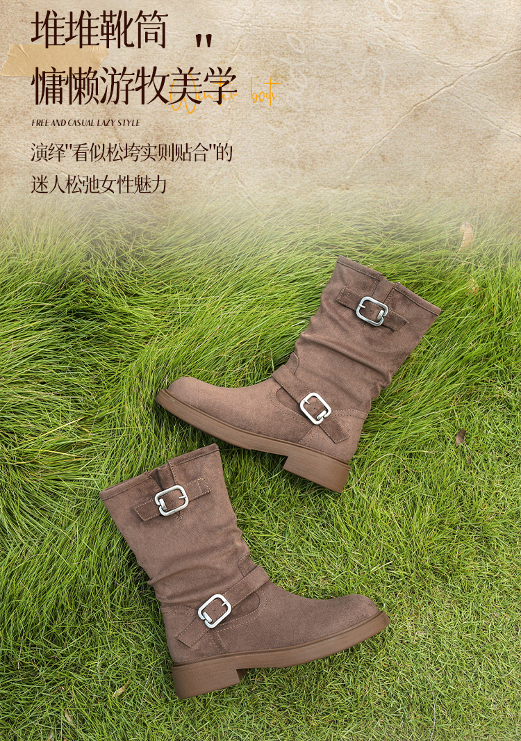 Safiya/索菲娅2025美拉德中筒绒面复古百搭休闲褶皱堆堆西部靴 SFD4116365