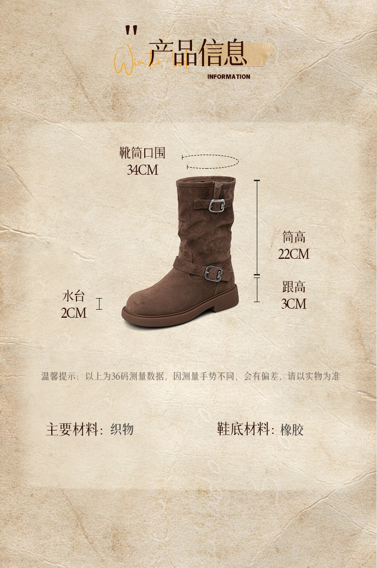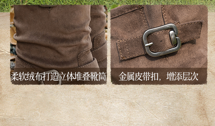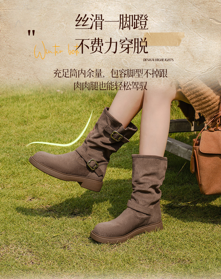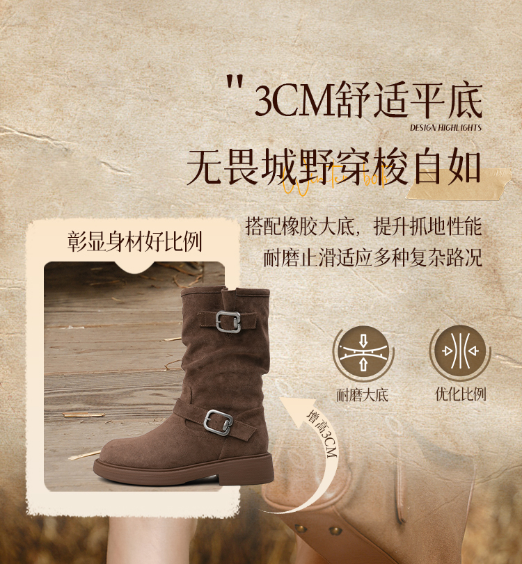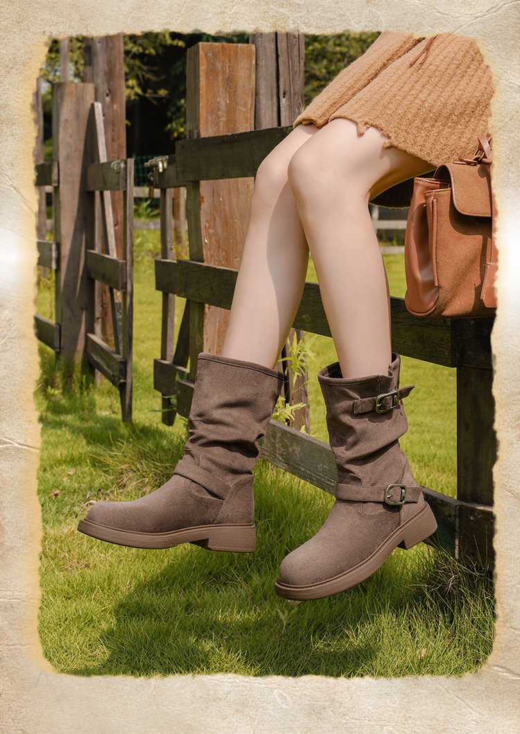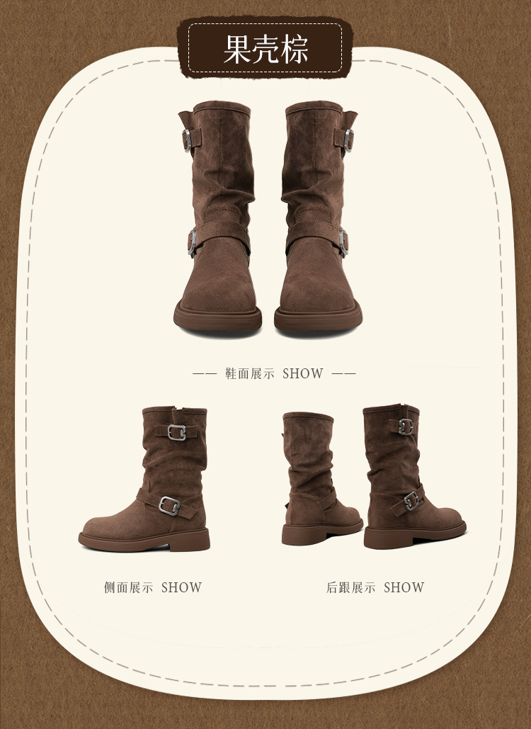 Safiya/索菲娅2025美拉德中筒绒面复古百搭休闲褶皱堆堆西部靴 SFD4116365