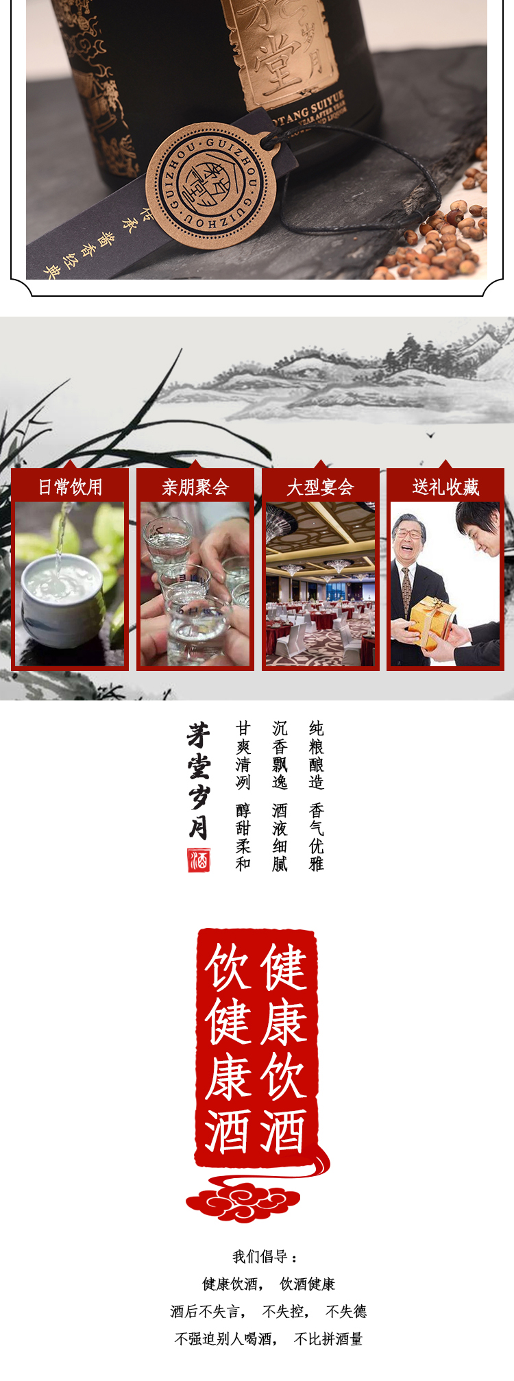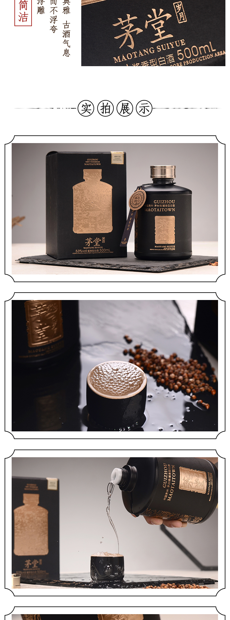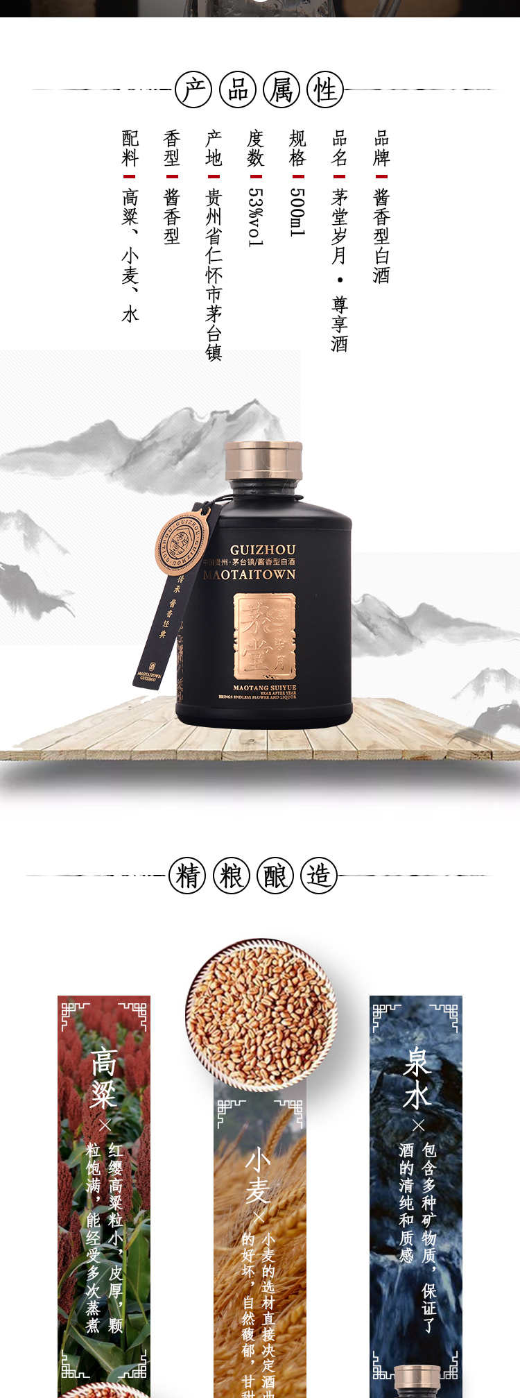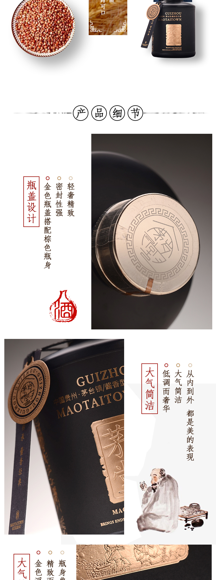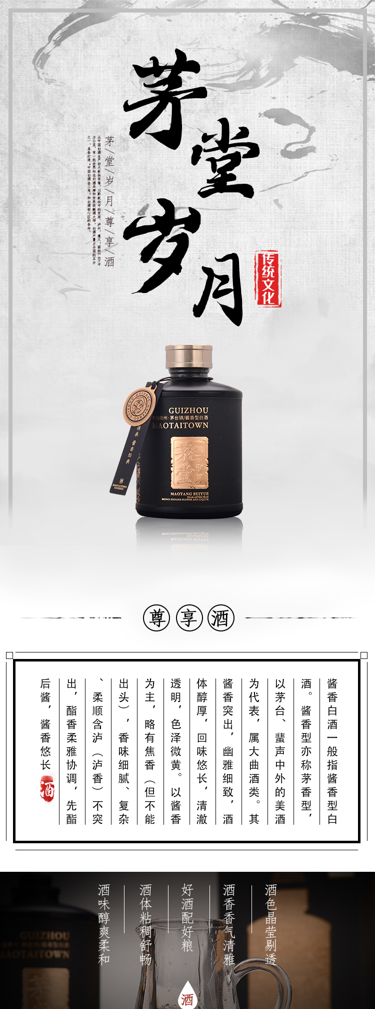 茅台镇纯粮酱香酒,采用坤沙酒酿造工艺,一年为一周期,经过两次投料,九次蒸煮,八次发酵,七次取酒,将七个轮次的酒按一定比例进行勾调,长期窖藏。入口酱香突出,幽雅细腻,绵柔醇厚,空杯留香,回味悠长。