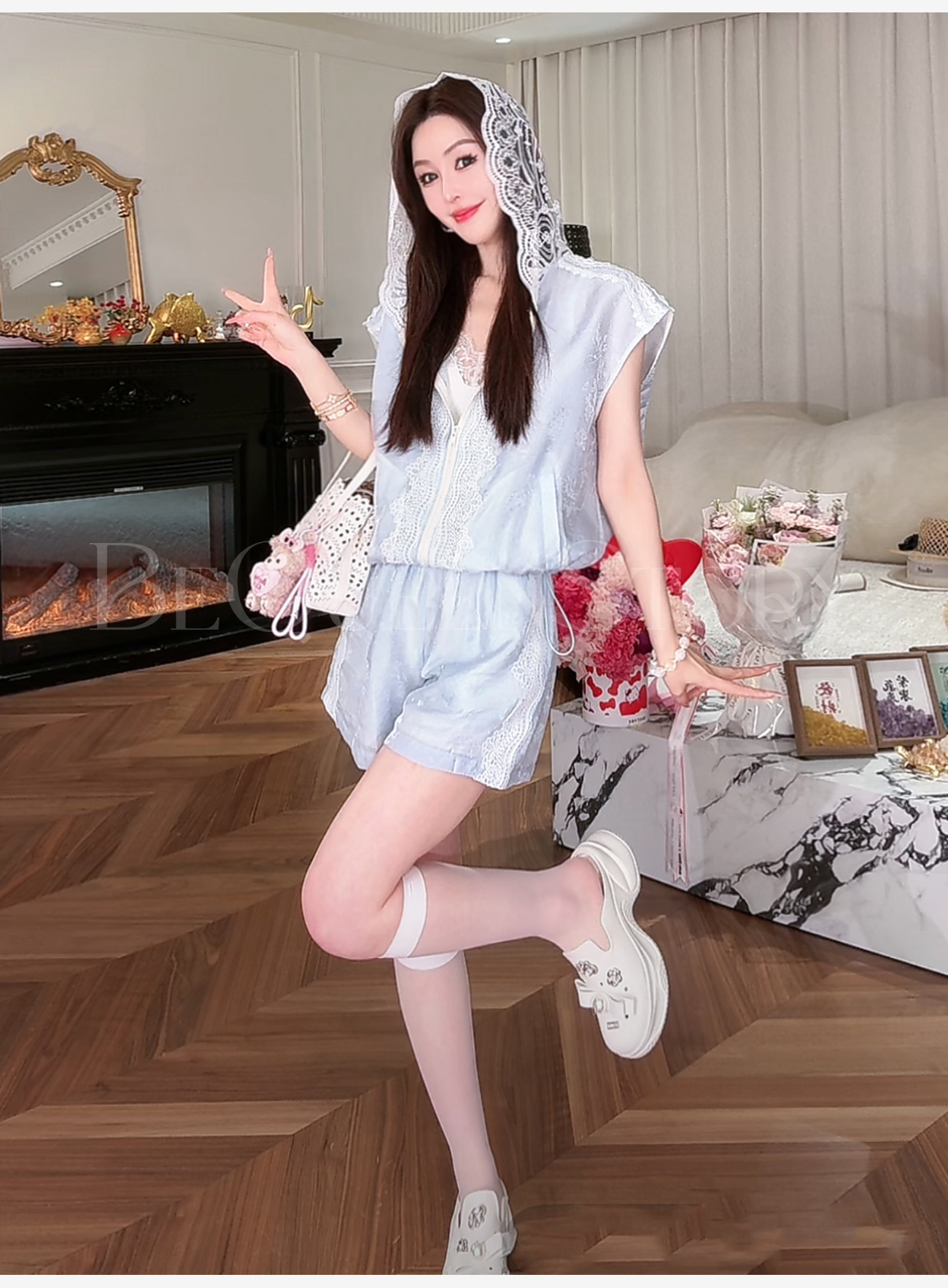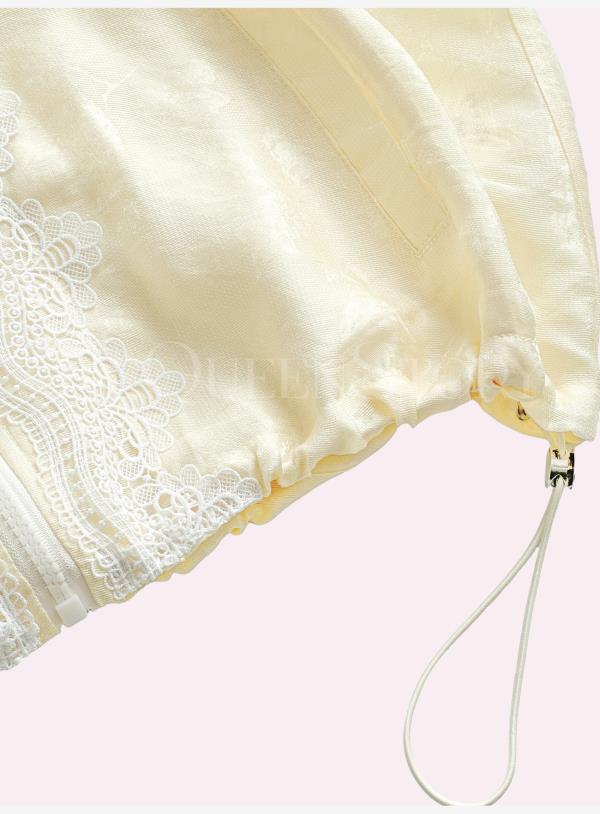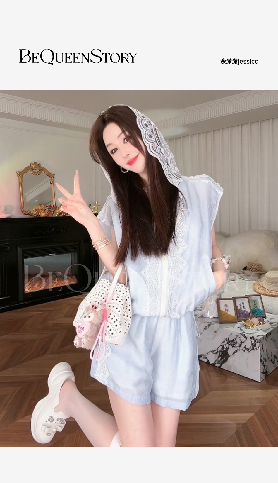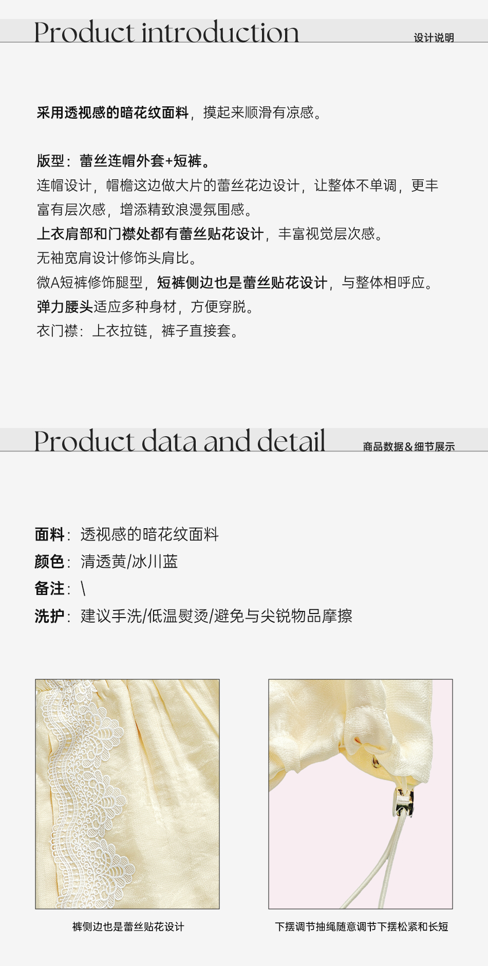 BeQueenStory【都市图鉴】透视感暗花纹蕾丝连帽外套&抽绳松紧短裤