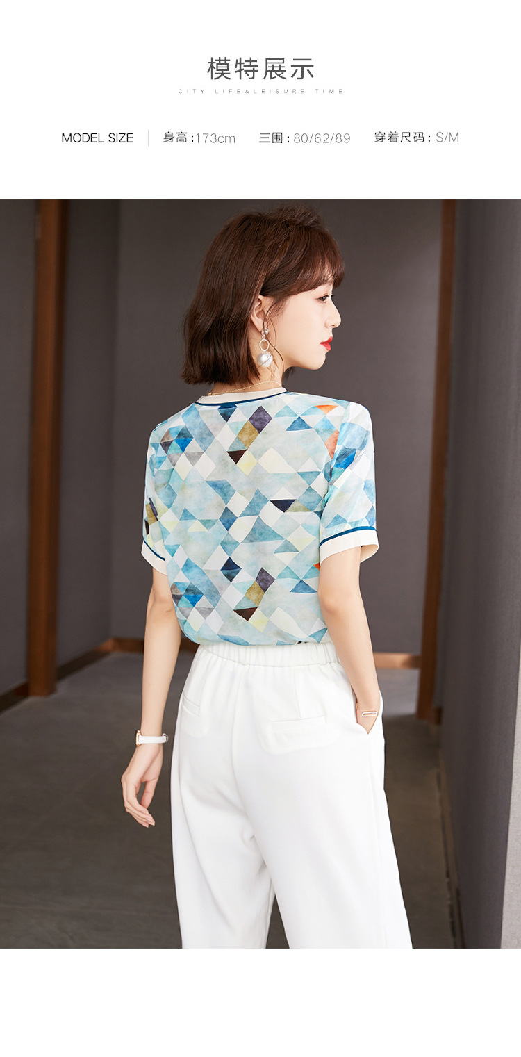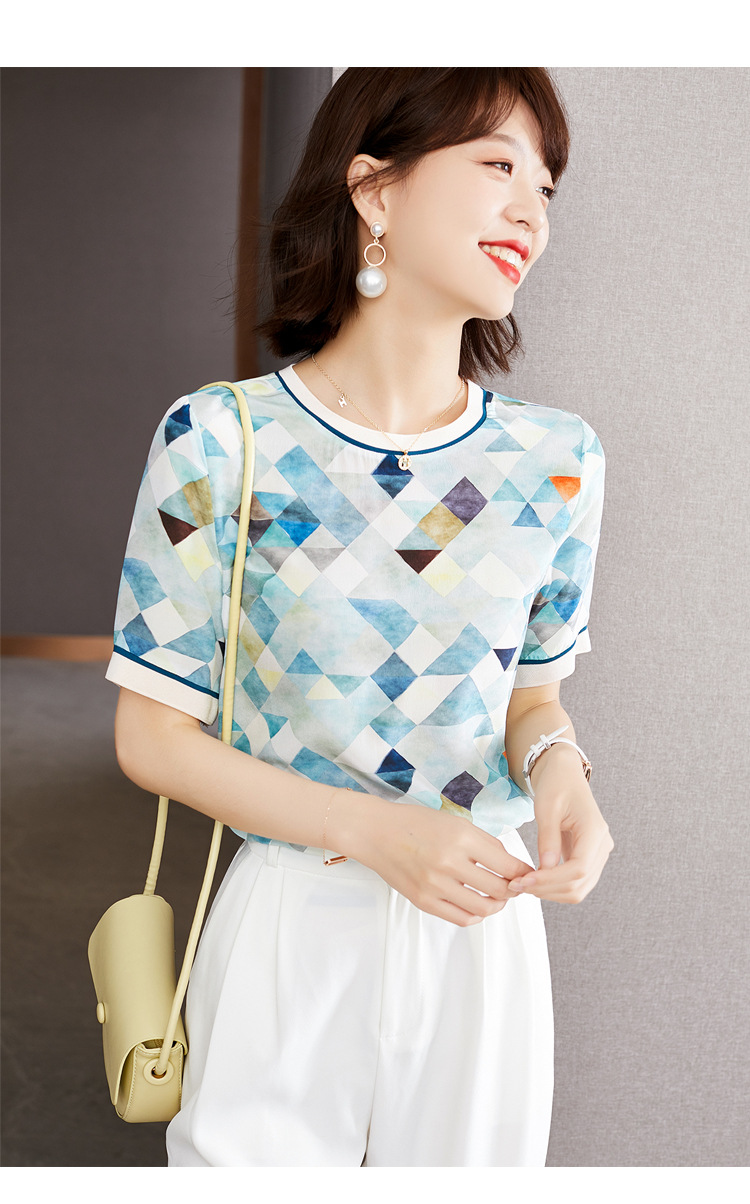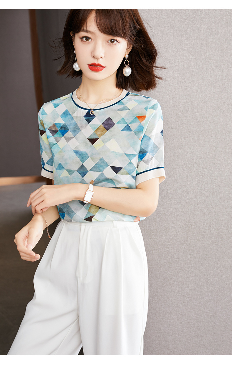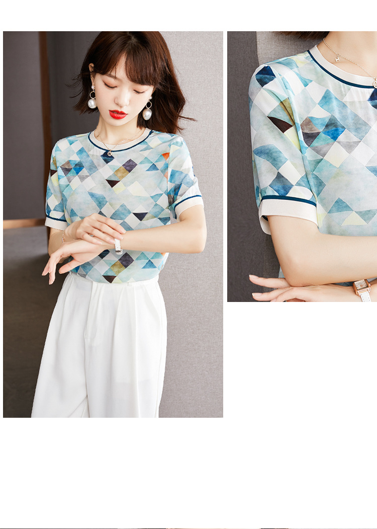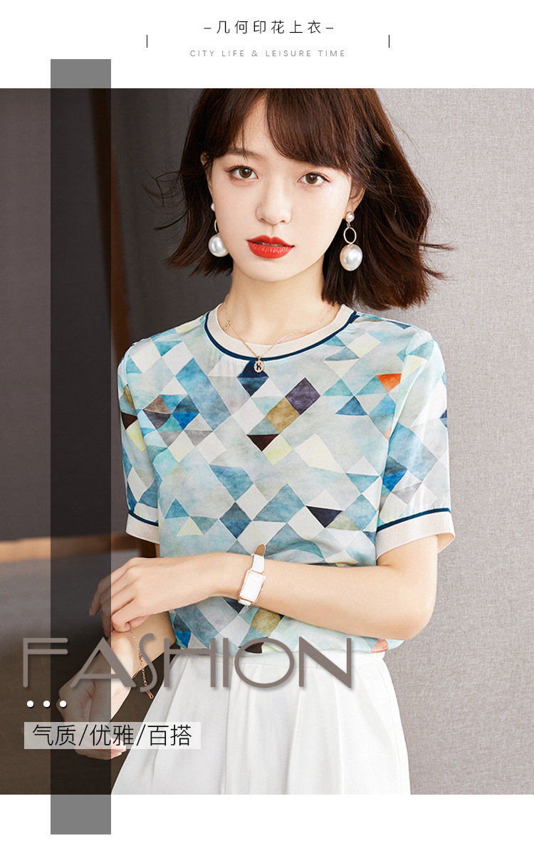 修身显瘦,设计感几何撞色印花通勤雪纺短袖T恤清凉小衫KQL-1775