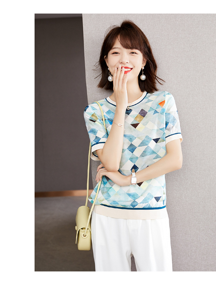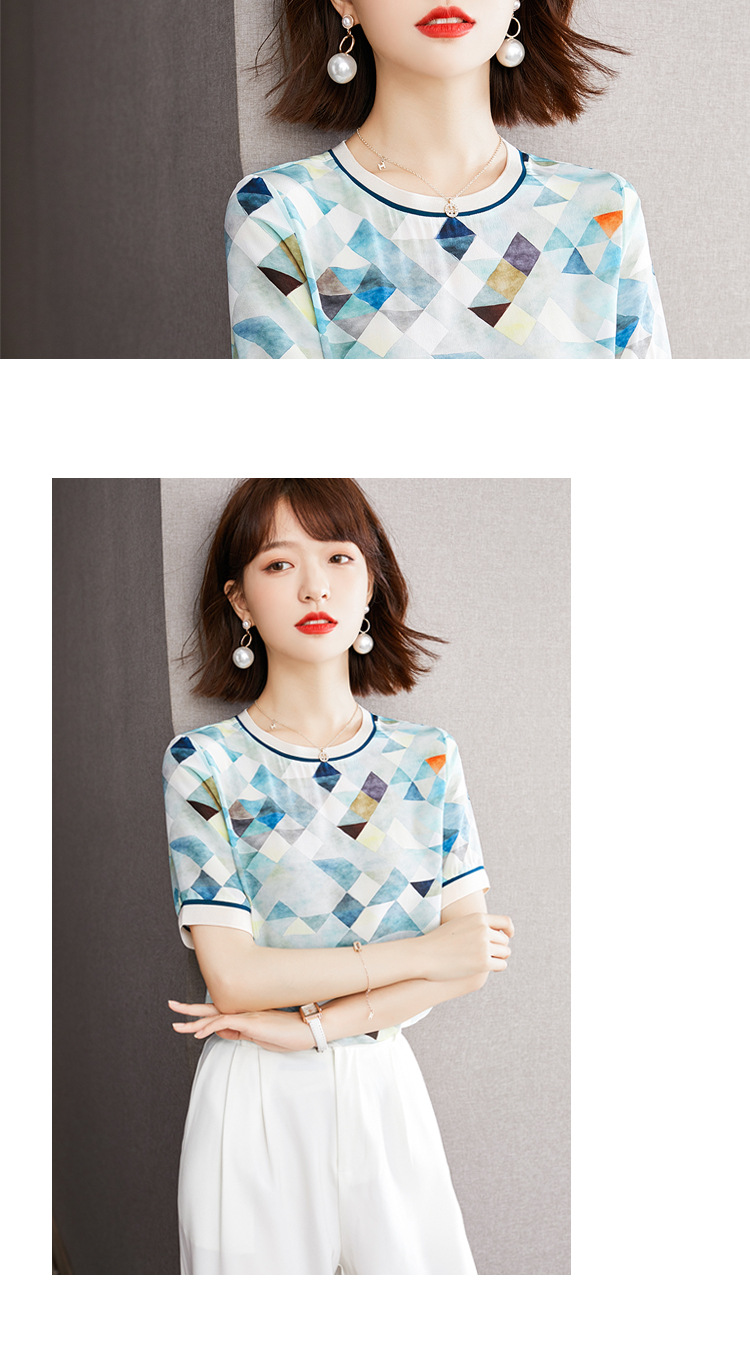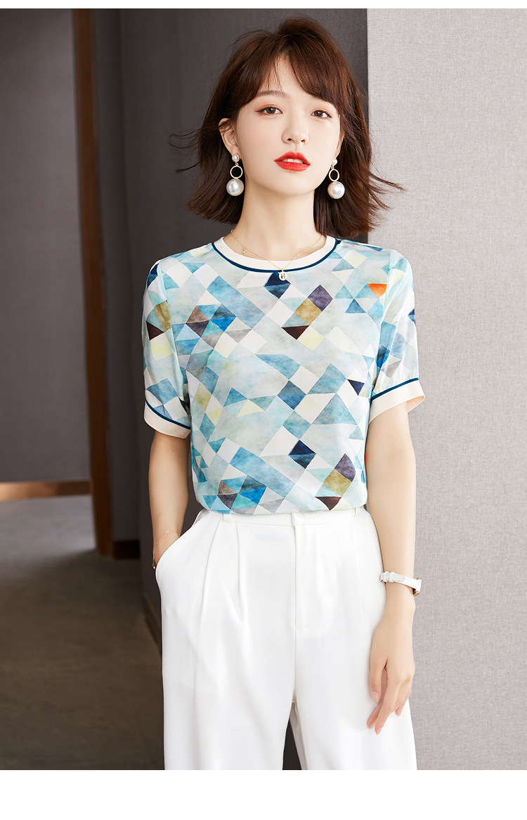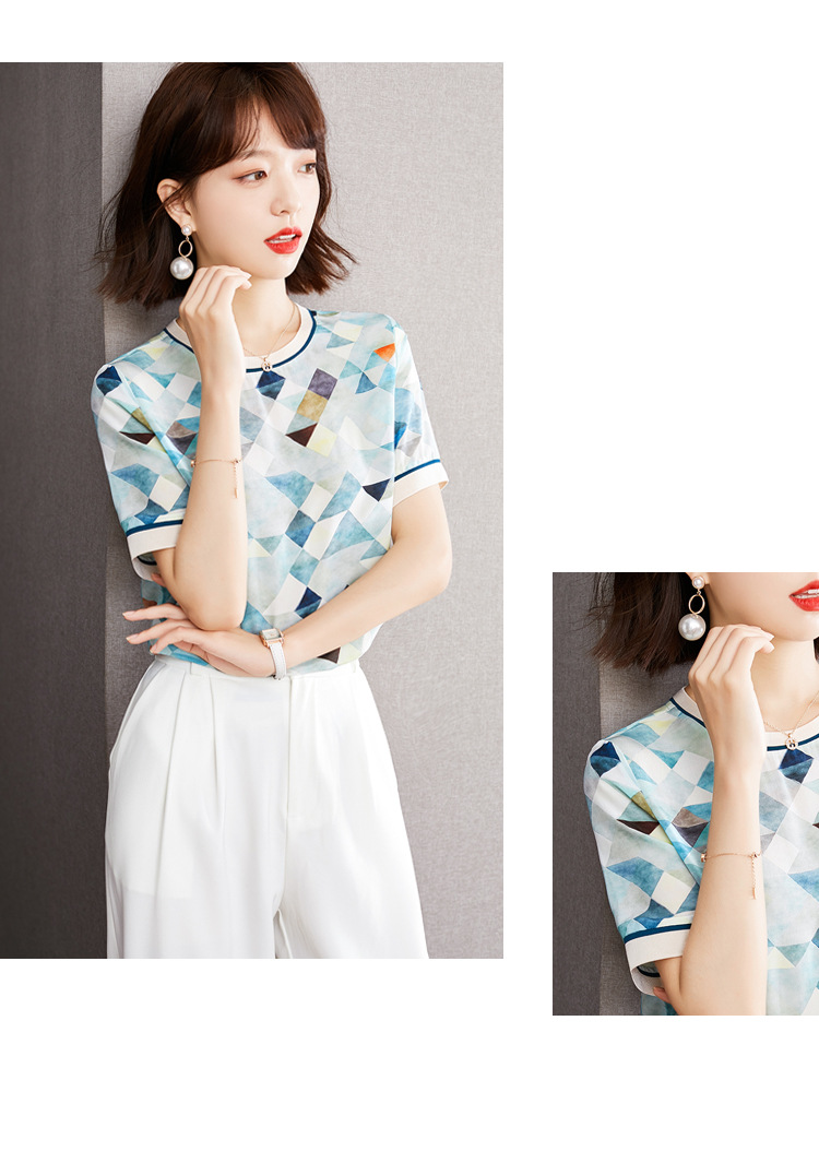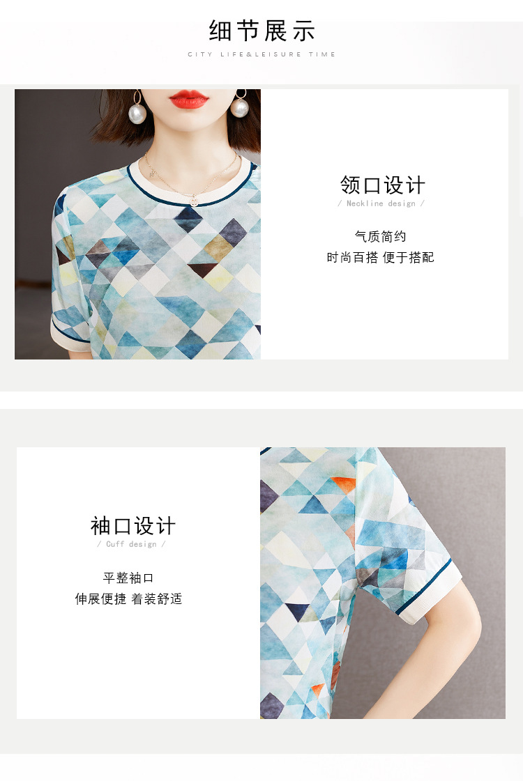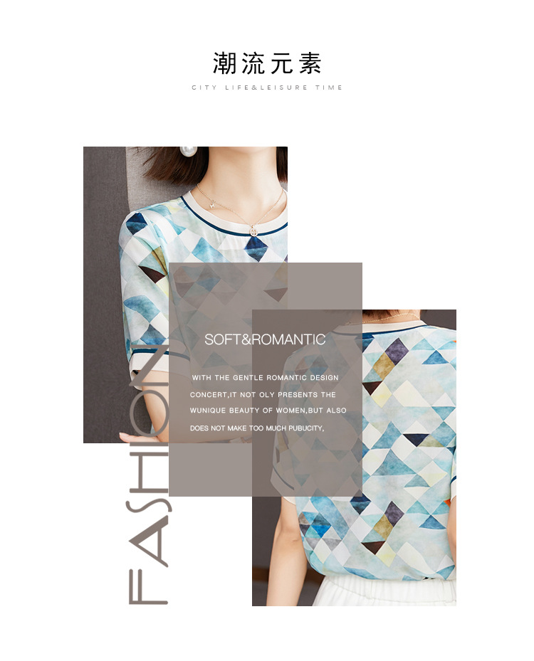 修身显瘦,设计感几何撞色印花通勤雪纺短袖T恤清凉小衫KQL-1775