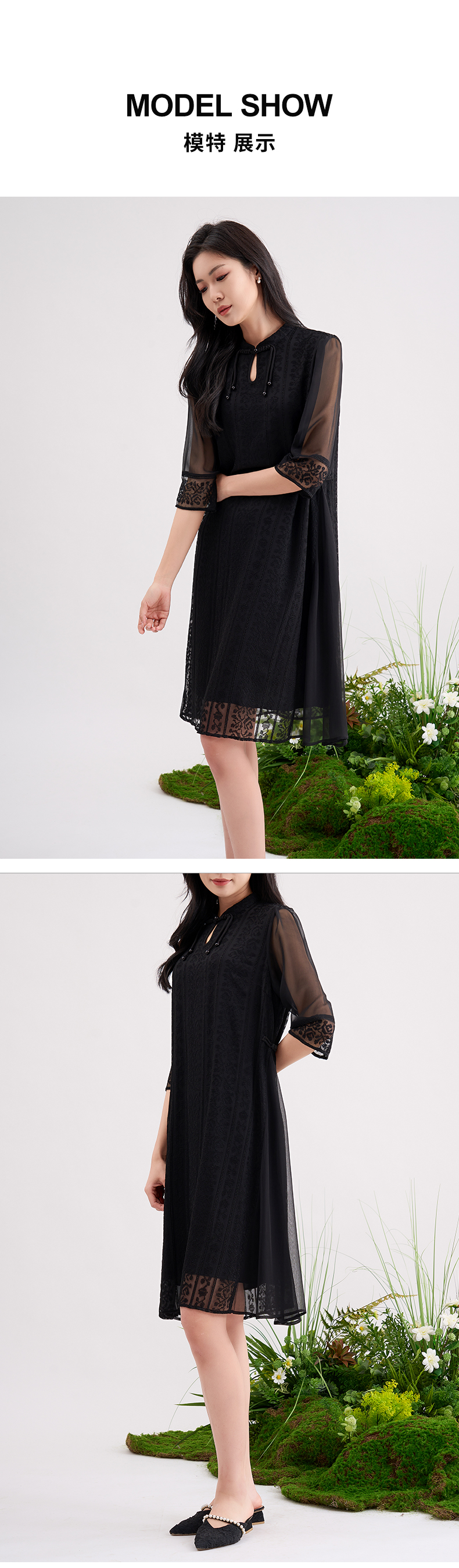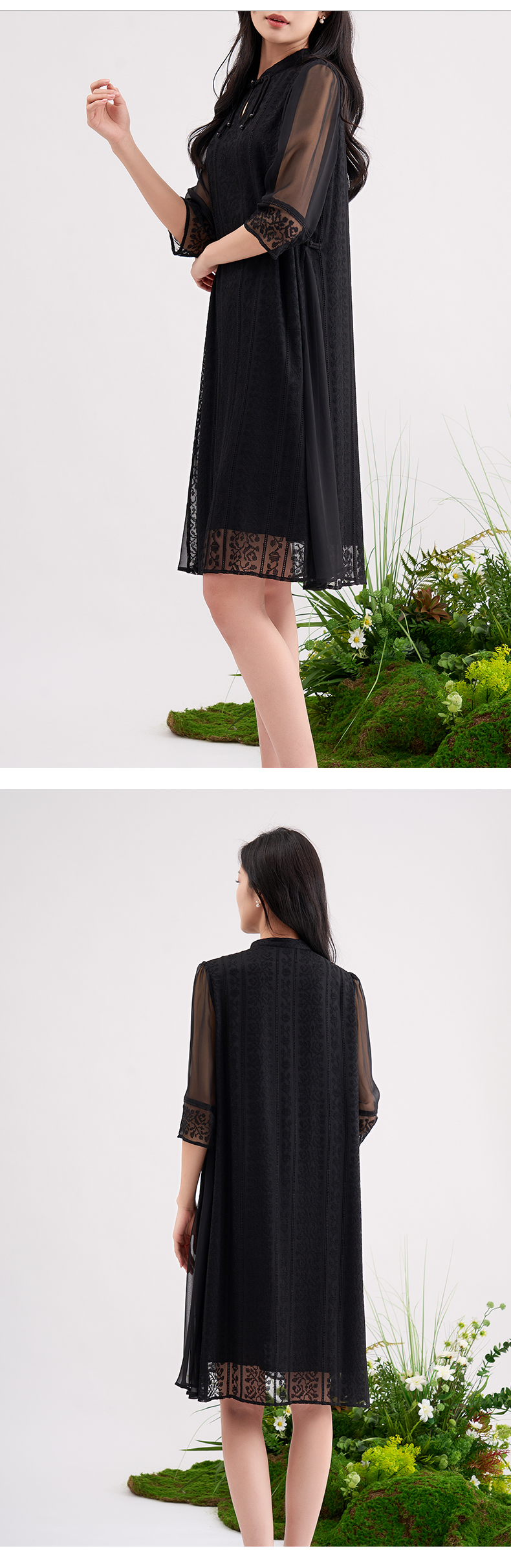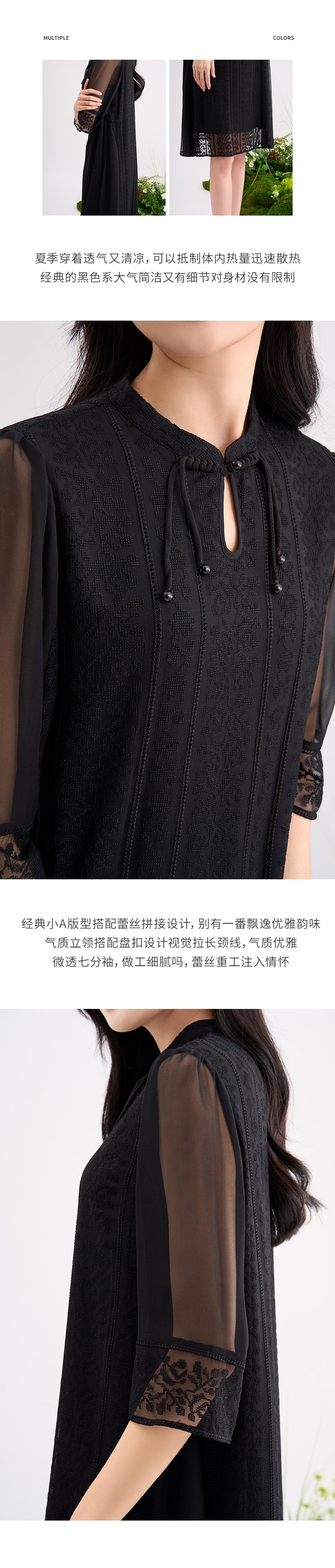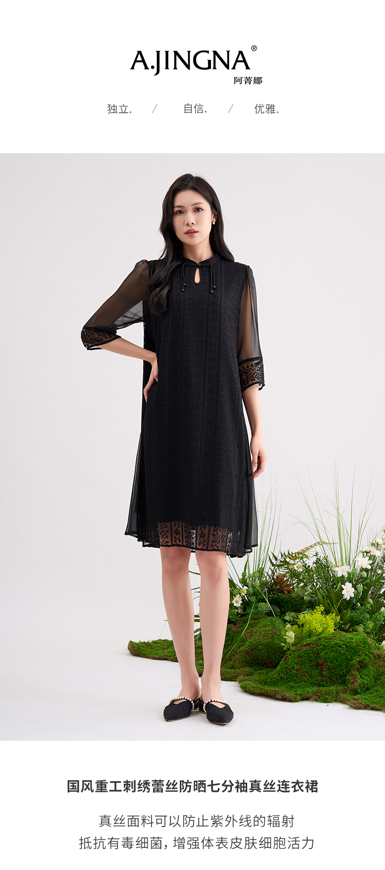 【国风刺绣】阿菁娜重工刺绣蕾丝防晒七分袖真丝连衣裙F29C212035