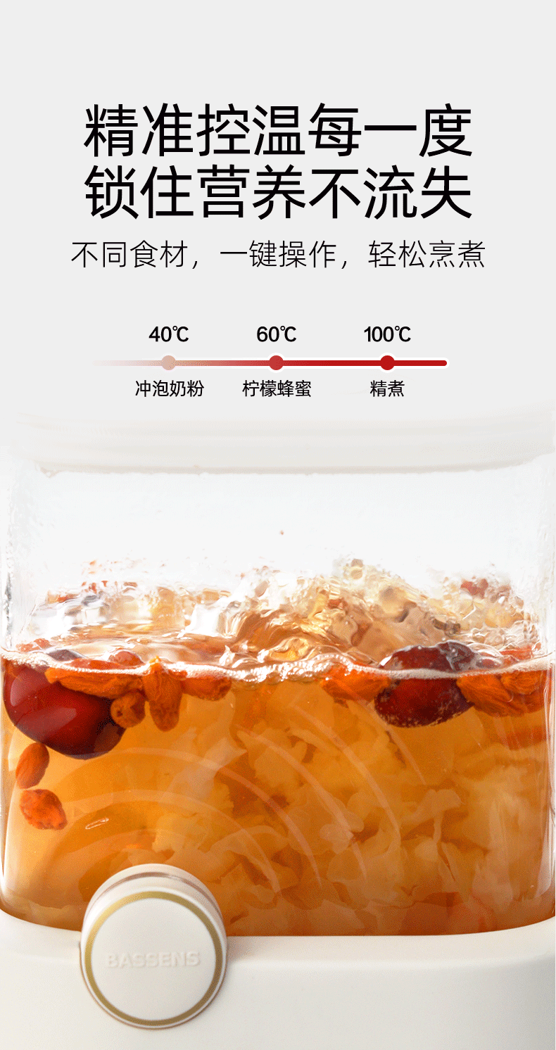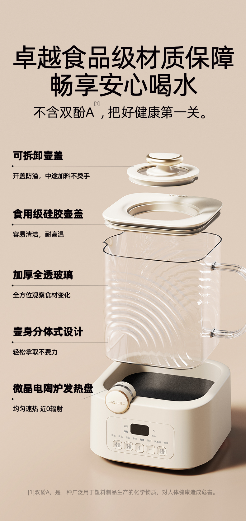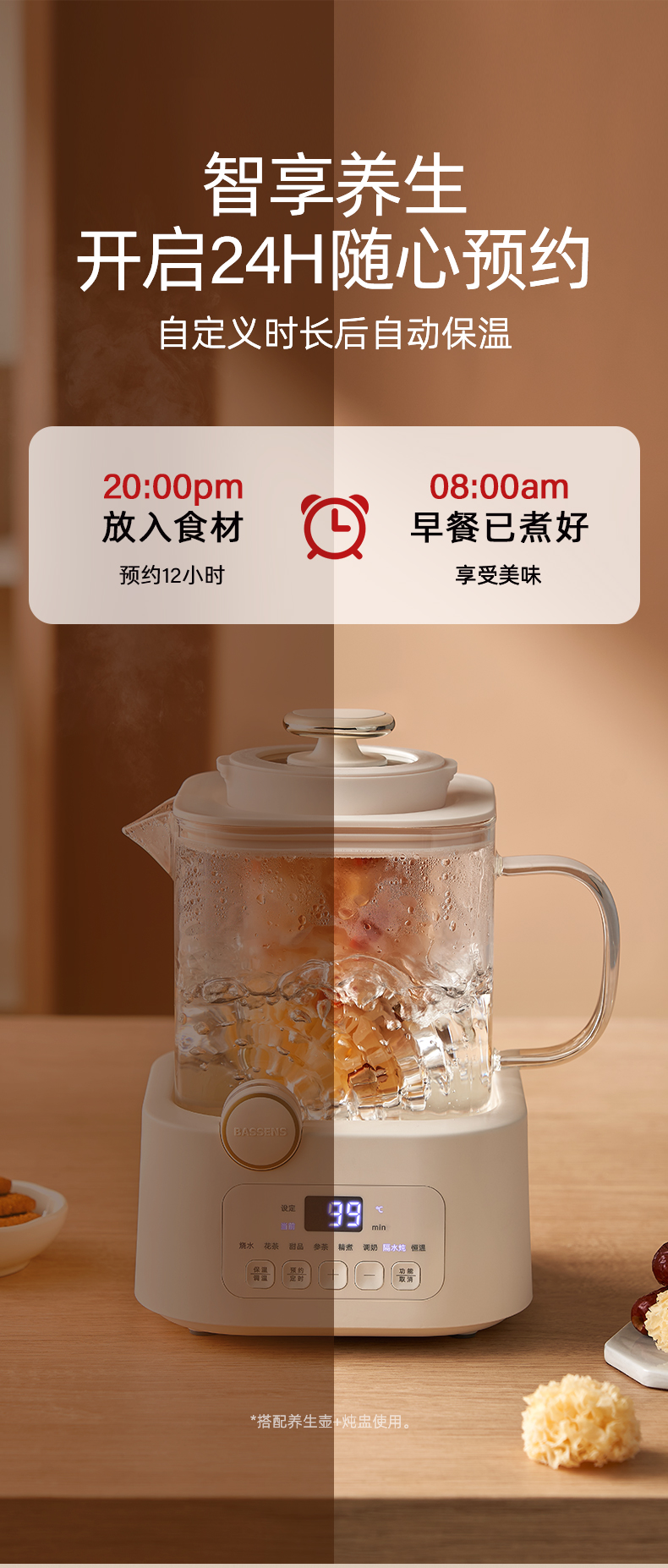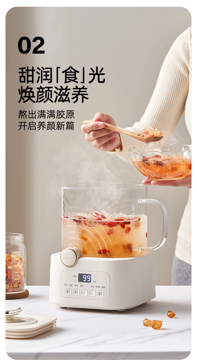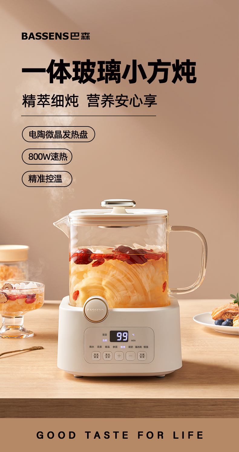 巴森小方炖养生壶1L全玻璃多功能多段炖煮24小时智能预约精准温控不干烧巴森小方炖养生壶