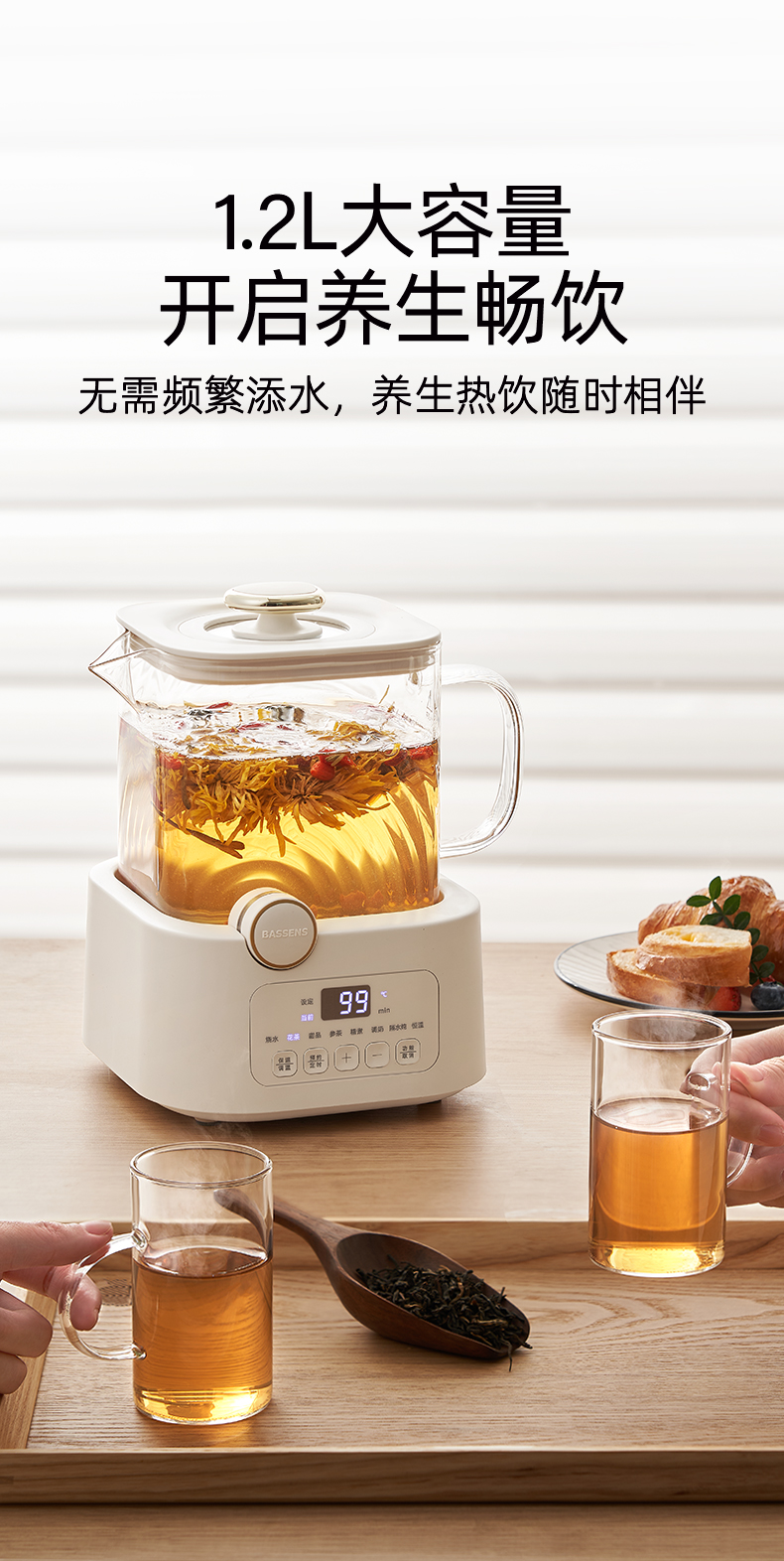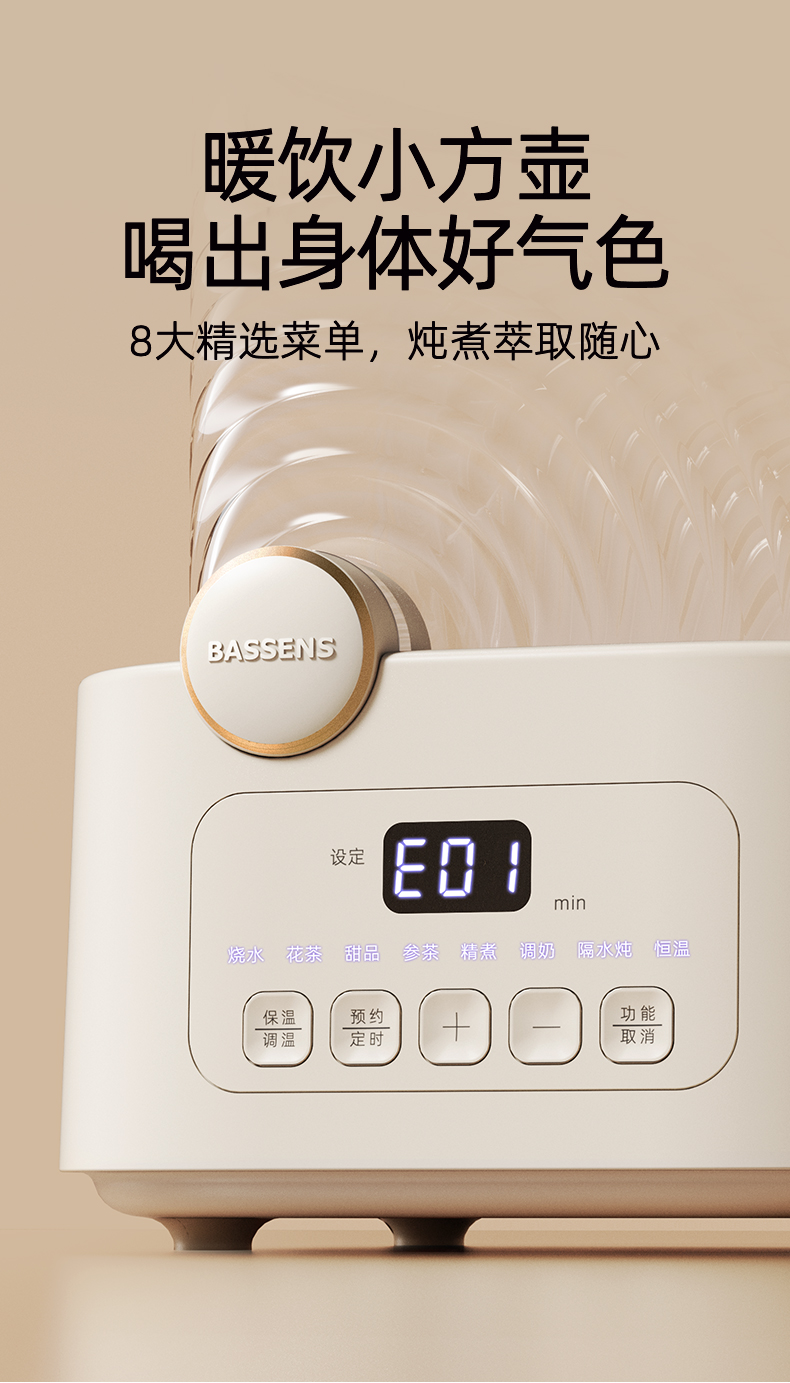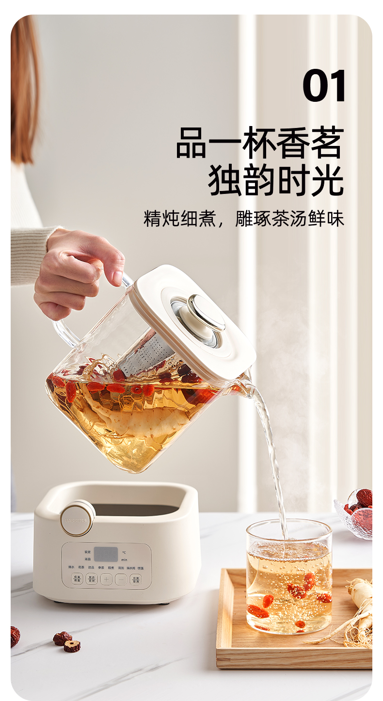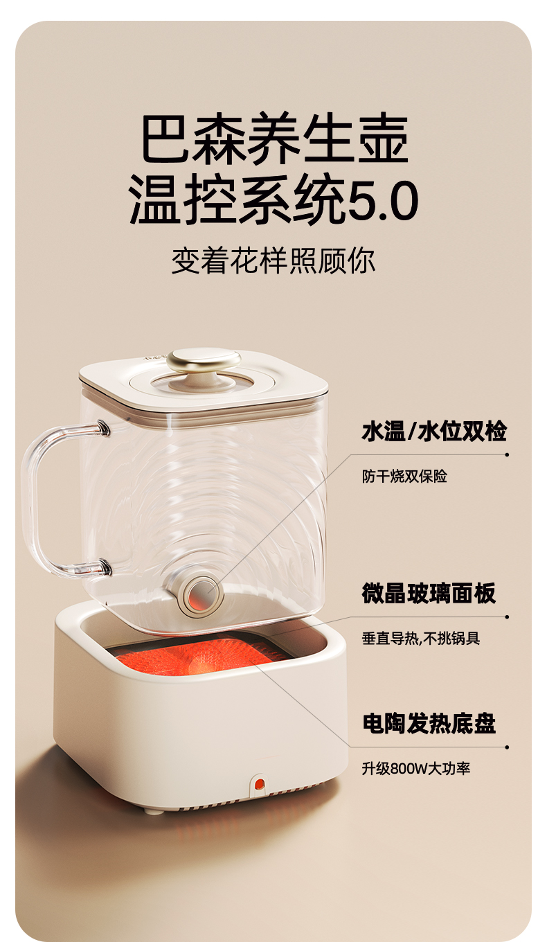 巴森小方炖养生壶1L全玻璃多功能多段炖煮24小时智能预约精准温控不干烧巴森小方炖养生壶