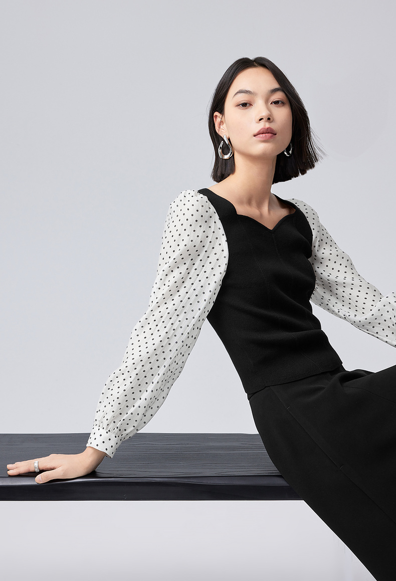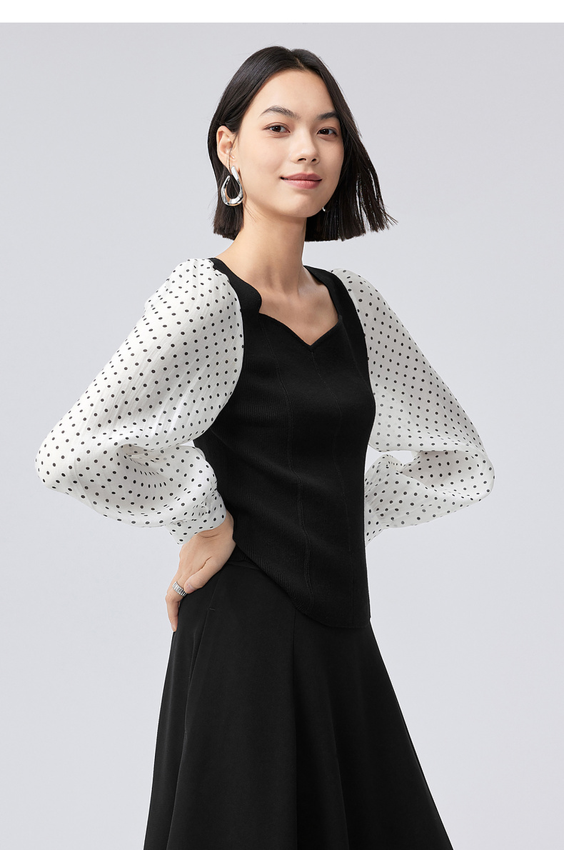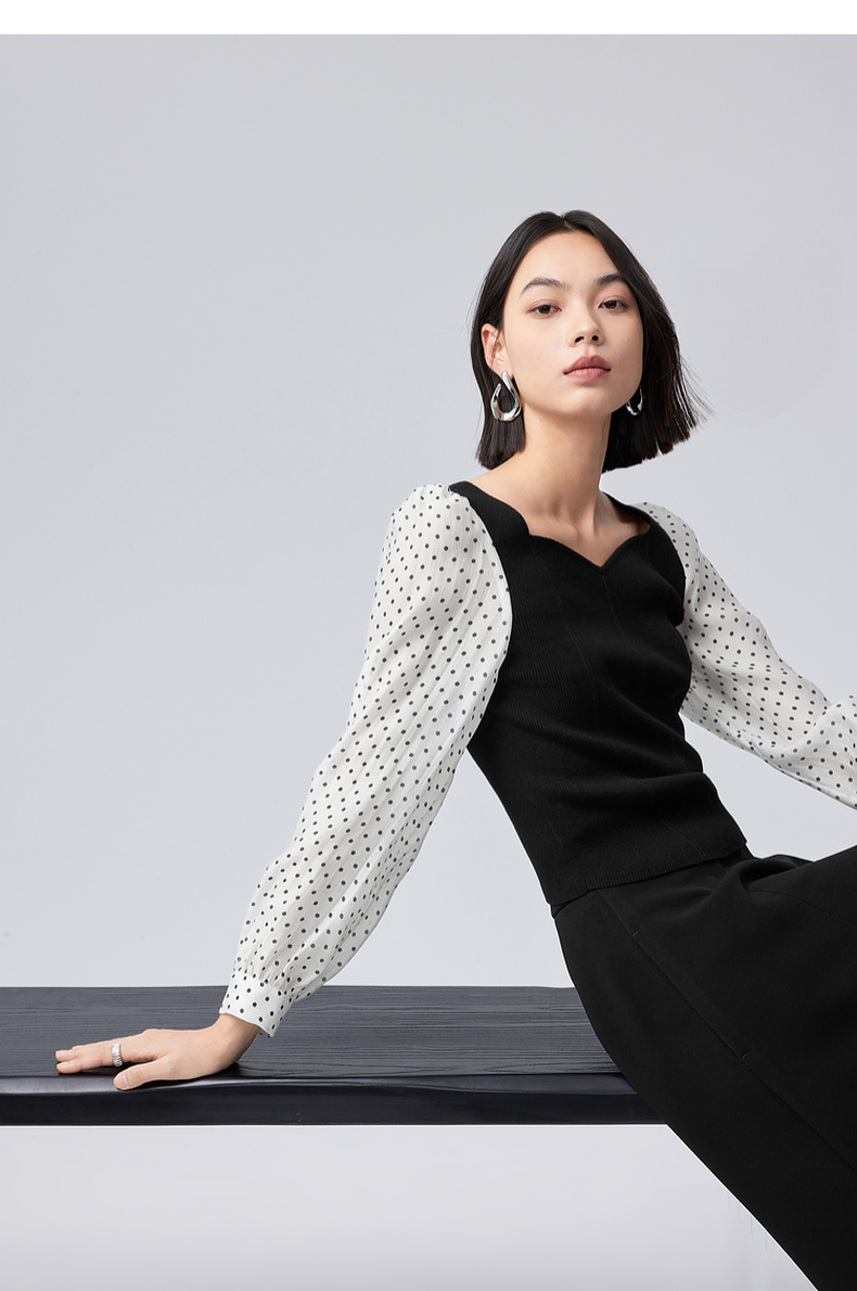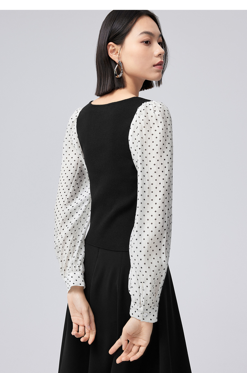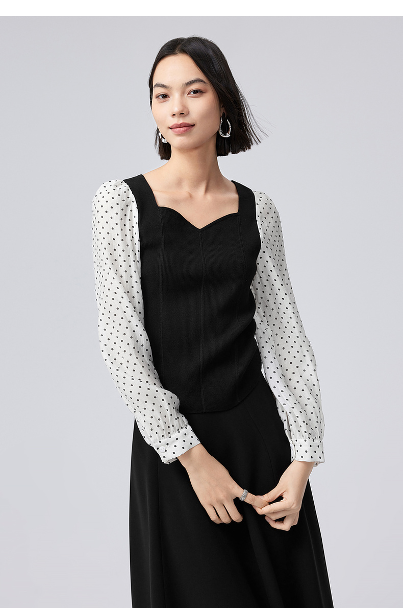 【严选】伊芙丽针梭拼波点法式复古坎线假两件针织衫2024秋装新款舒适上衣1F7933511