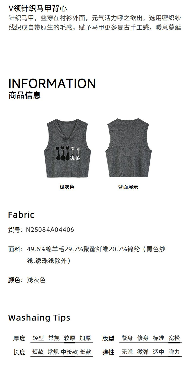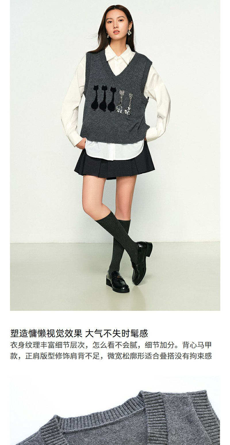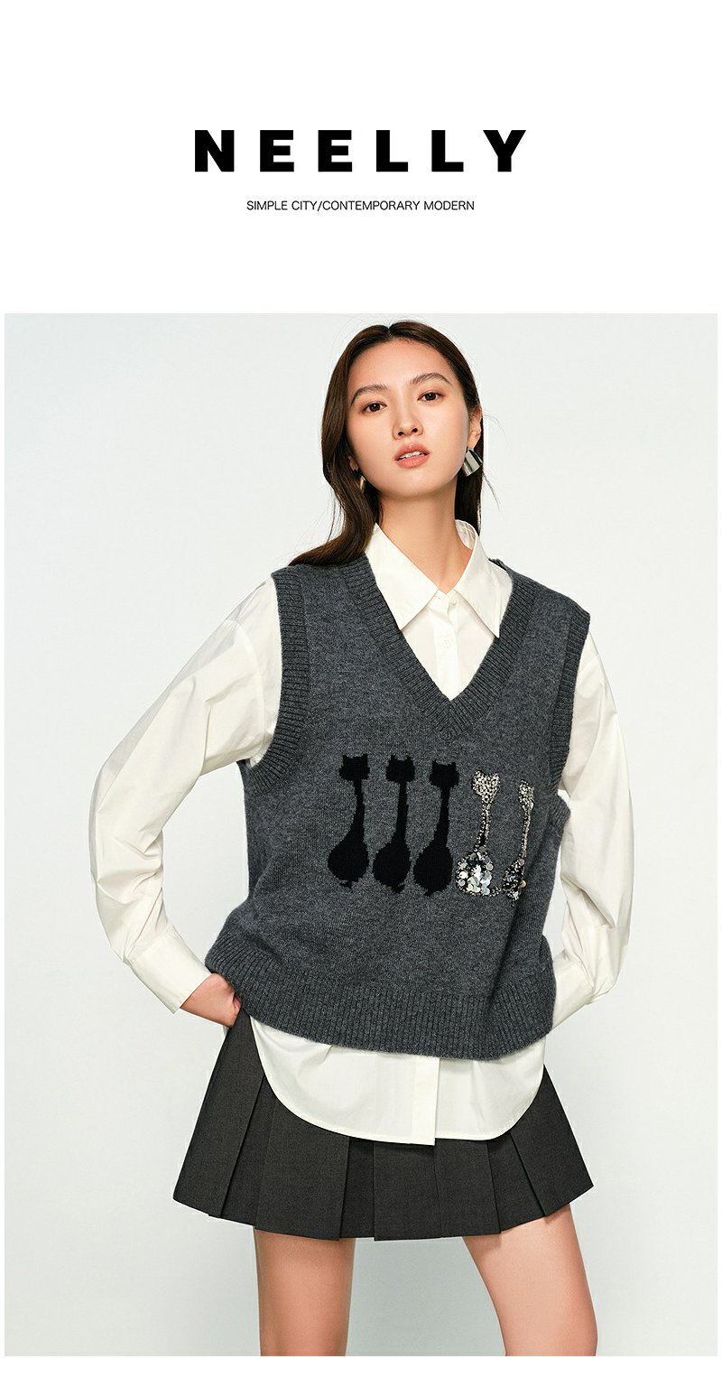 NEELLY纳俪商场同款秋季新款V领显瘦针织马甲背心女复古百搭毛衣N25084A04406