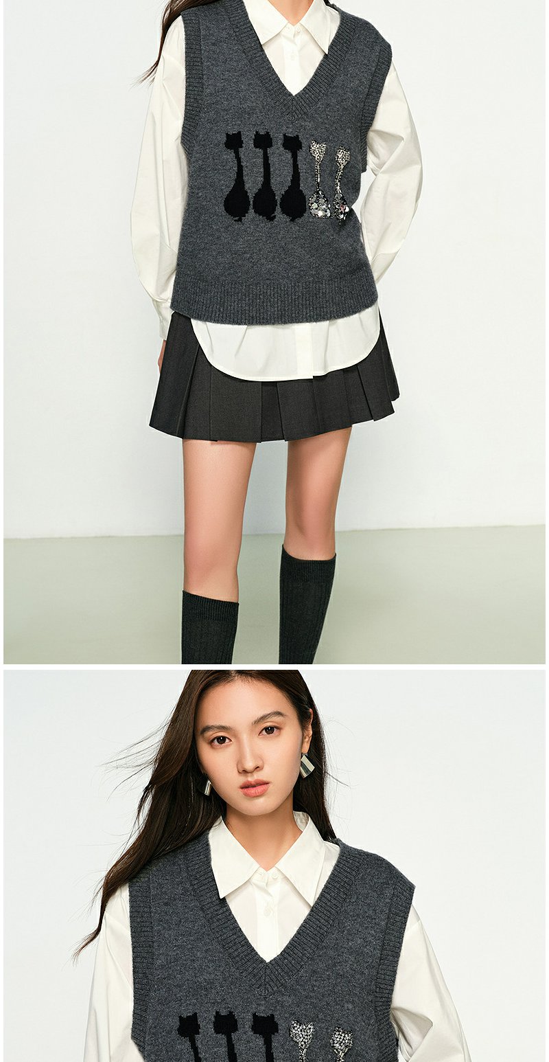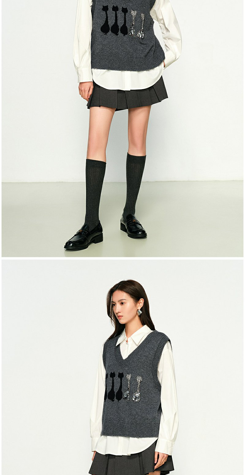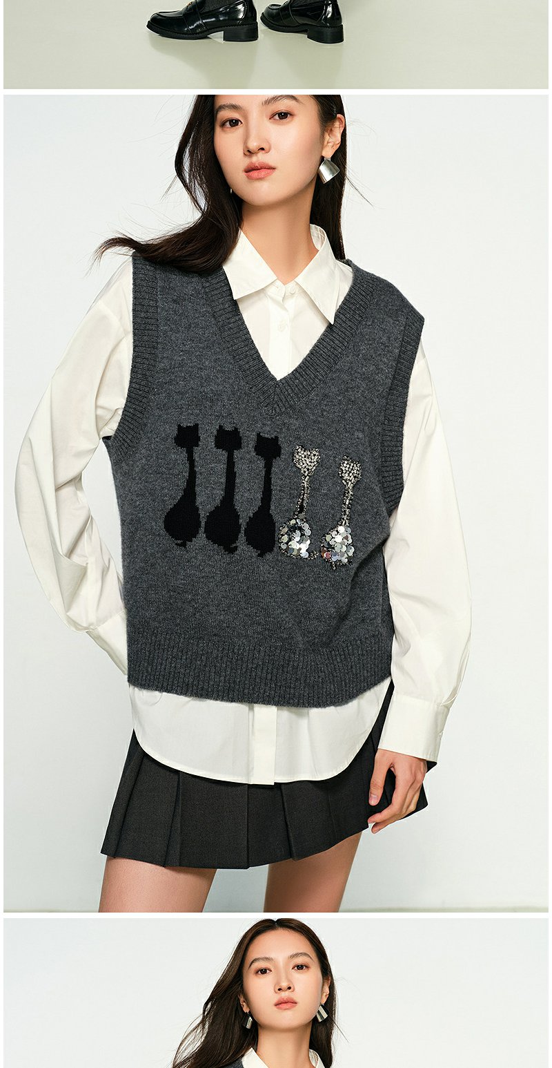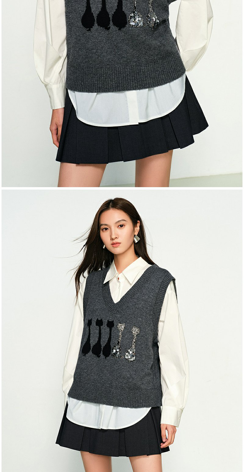 NEELLY纳俪商场同款秋季新款V领显瘦针织马甲背心女复古百搭毛衣N25084A04406