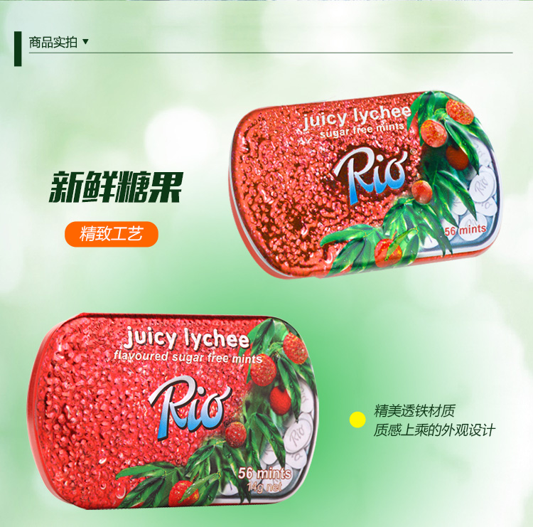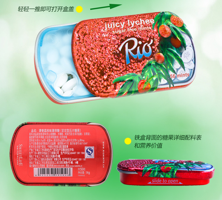 ![]() | Rio 瑞怡乐 清香荔枝 无糖果味薄荷糖压片糖果 【口味】荔枝味<br> 【净含量】14g(56粒)铁盒装<br> 【保质期】24个月<br> 【执行标准】SB/T 10347<br> 【生产许可证】QS440713011560<br> 【食用方法】含片<br> 【储存方法】请存放于阴凉、干燥处;开封后请注意防潮 |
