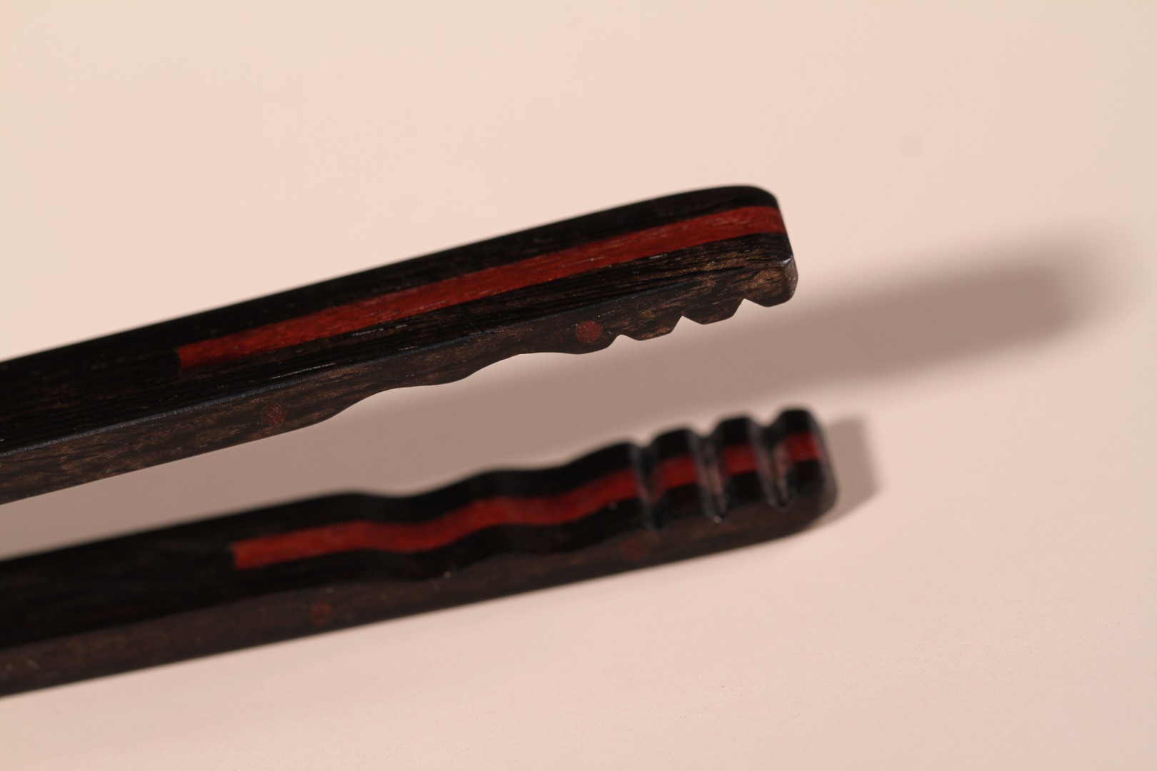 茶夹以紫光檀+赞比亚紫檀制作,紫光檀触感细腻,纹理自然,赞比亚紫檀分别穿插嵌入3个支撑点位,无缝平整,形成经典的双材搭配,款式简洁大方,波浪式齿纹设计,夹取牢固,使用方便。