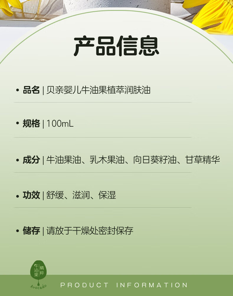 贝亲 婴儿牛油果植萃润肤油100ml