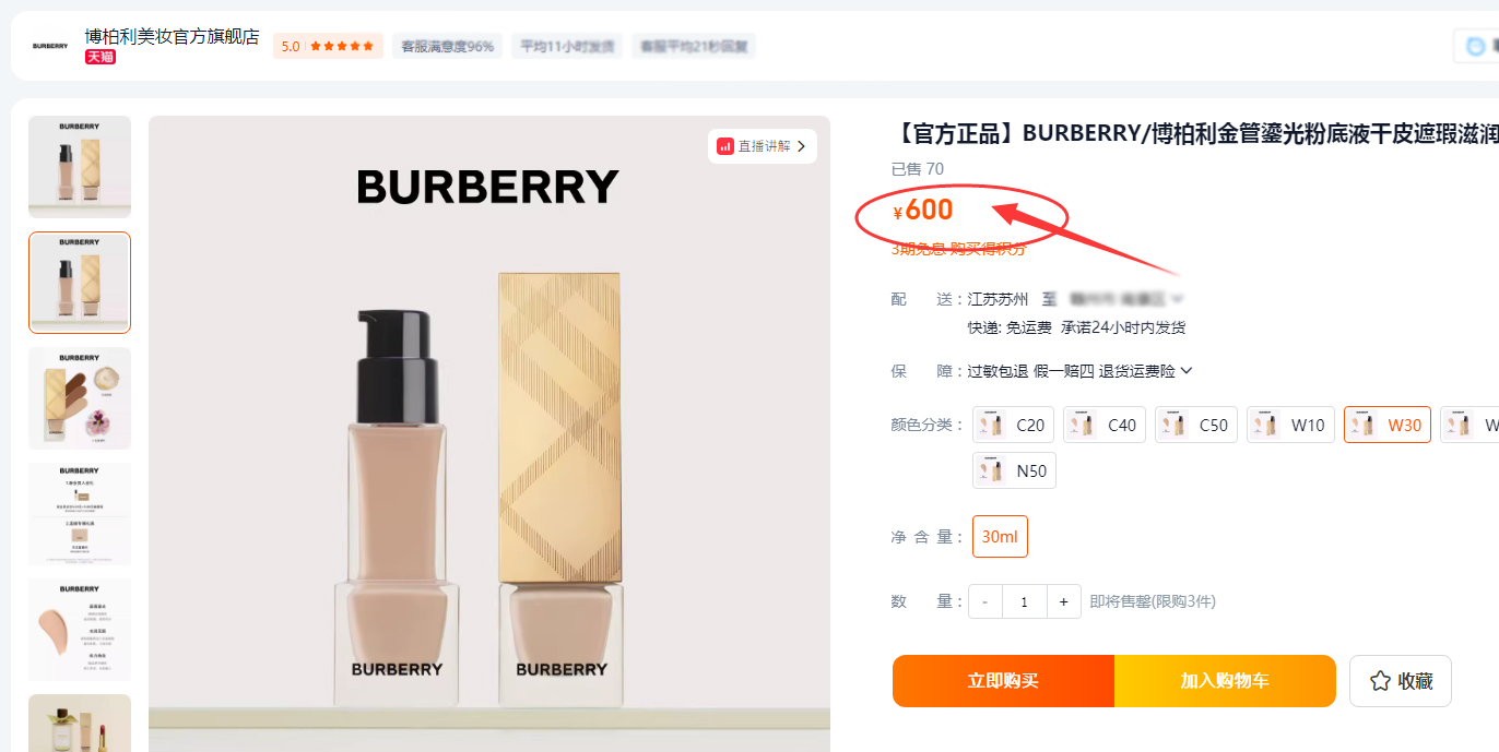 【9.22王炸割肉价】 BURBERRY博柏利巴宝莉鎏金焕彩恒颜粉底液30ml 白盒无盖W30 LIGHT WARM(国内三年效期限24年2-12月份随机发 国外五年到26年)