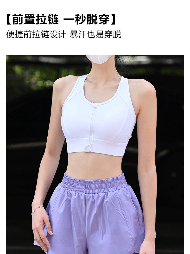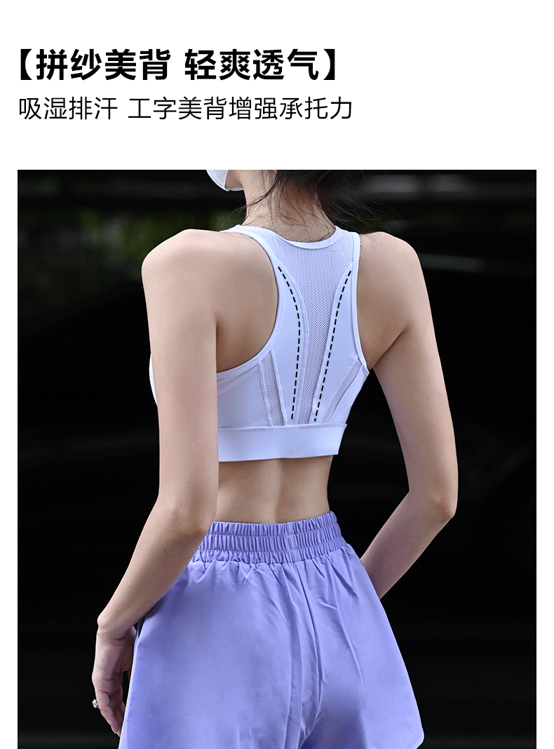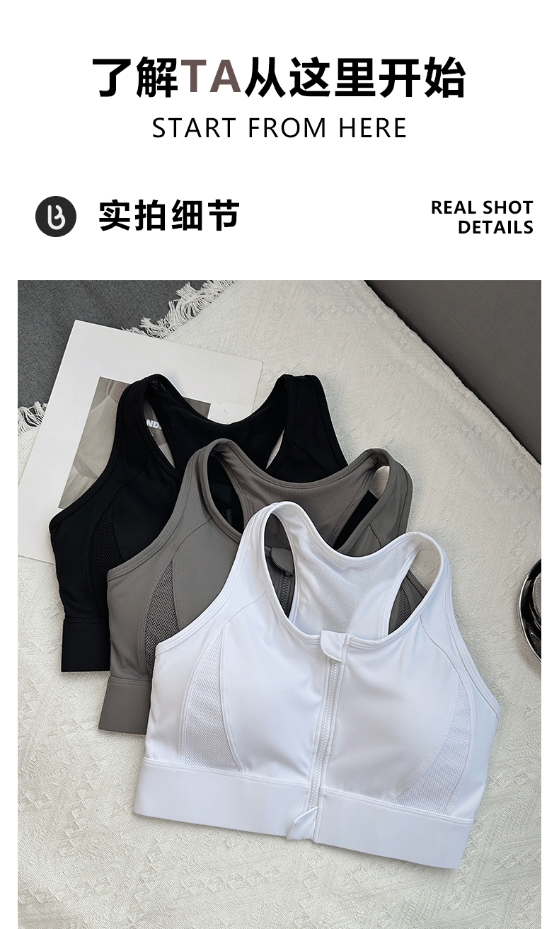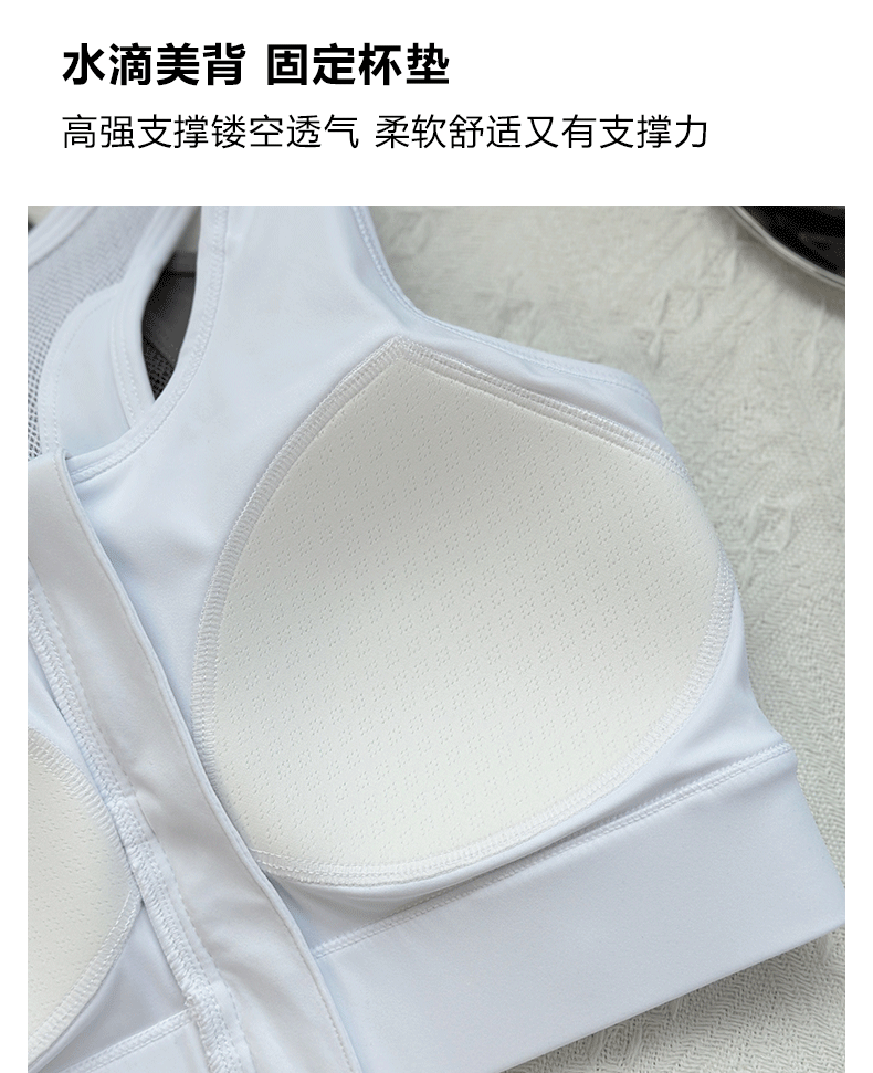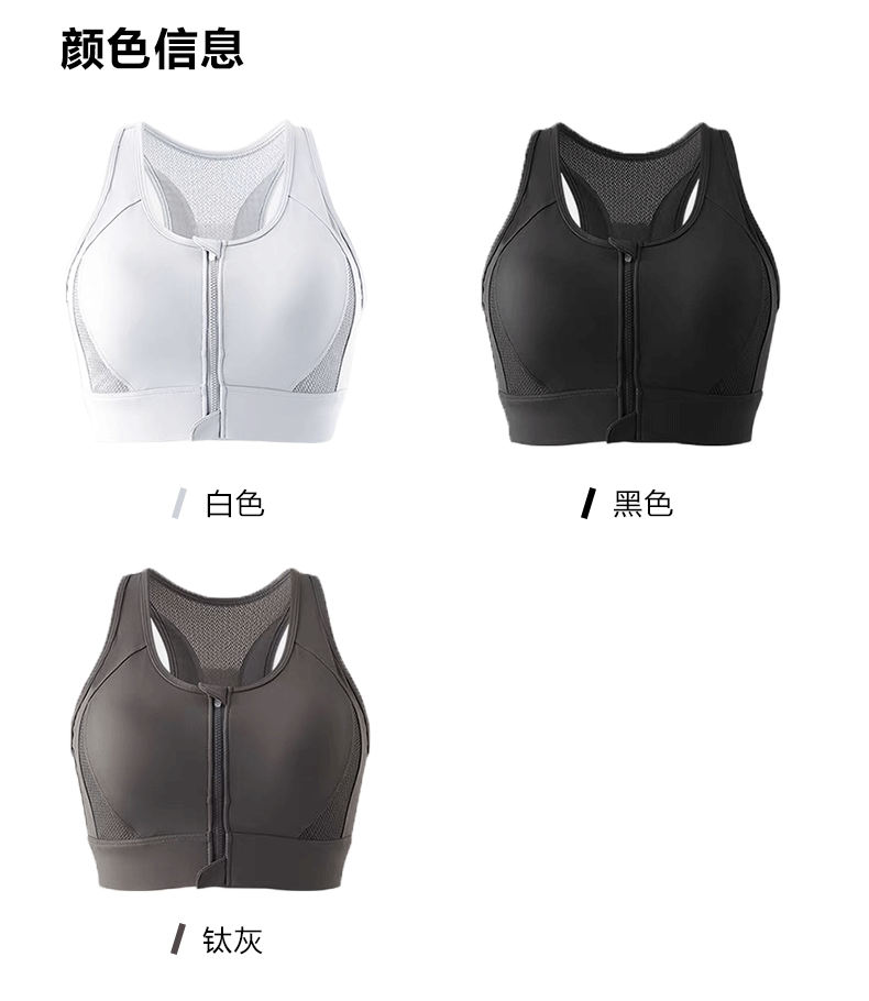 Beemen莱卡抗菌高强度一体杯运动内衣 前拉链防震文胸 工字背网纱透气收副乳 跑步健身瑜伽背心