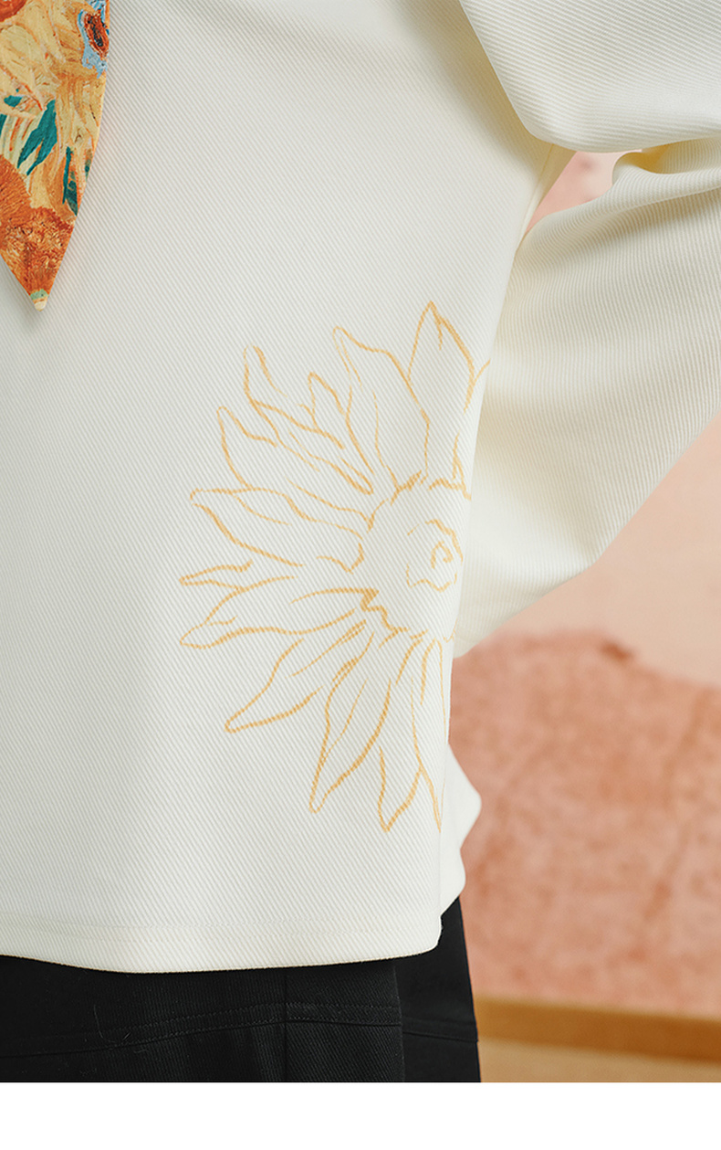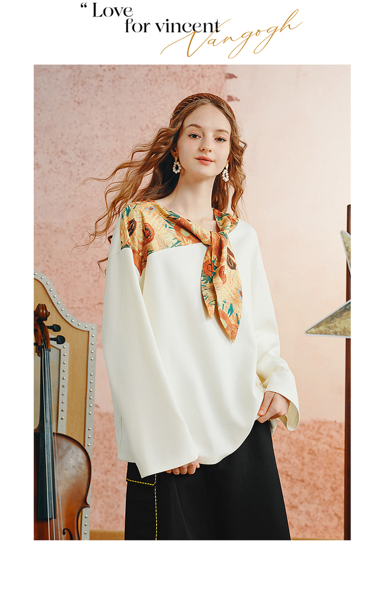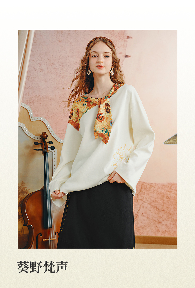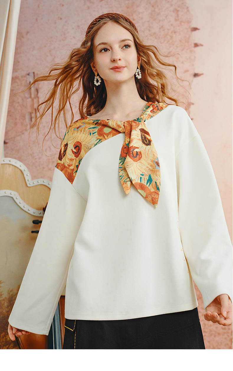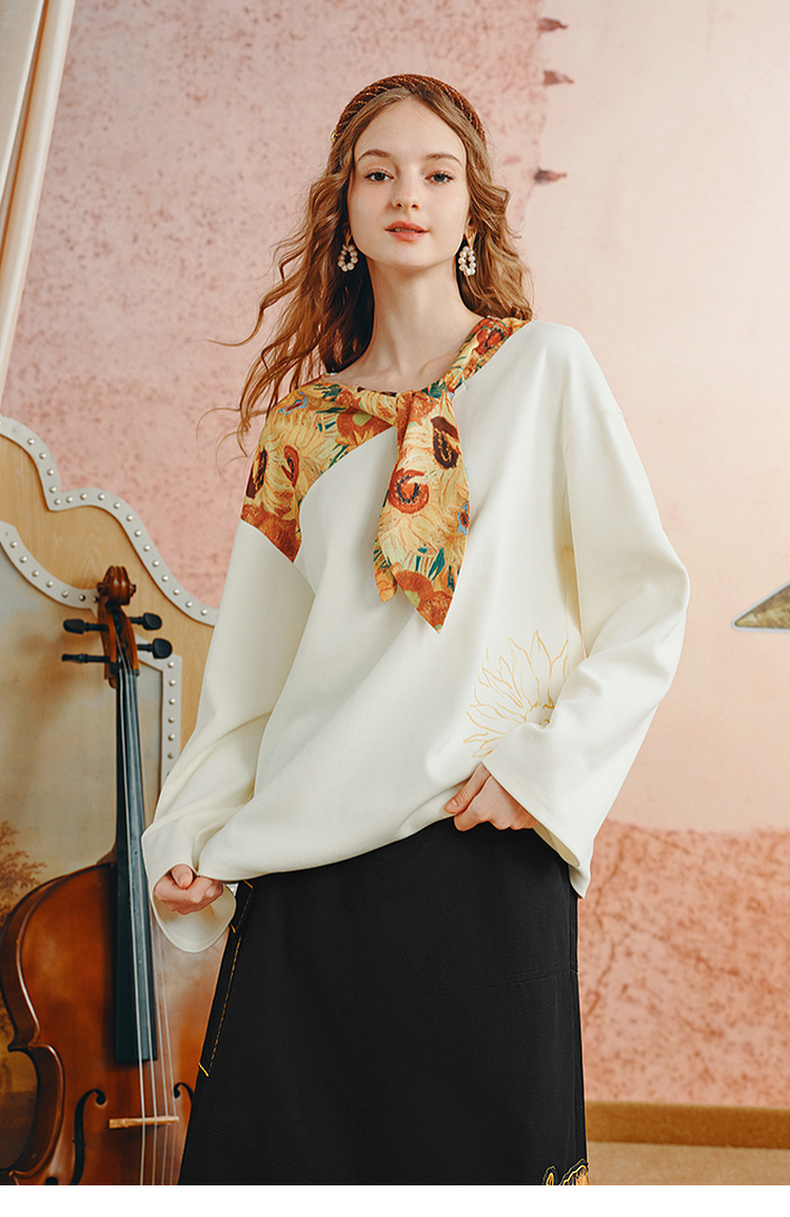两三事梵高文艺葵野梵声2025秋新款小清新印花绑带拼接长袖t恤女