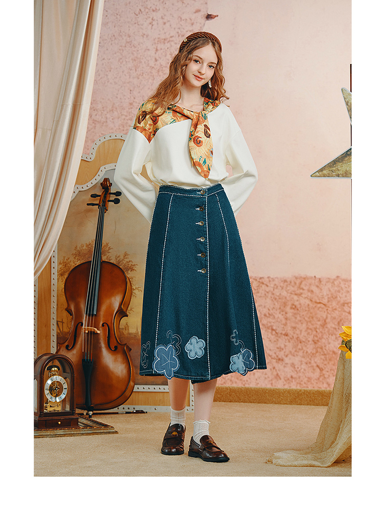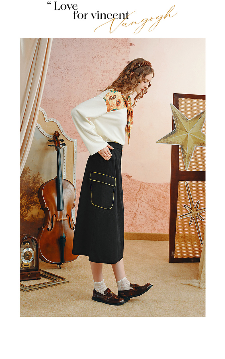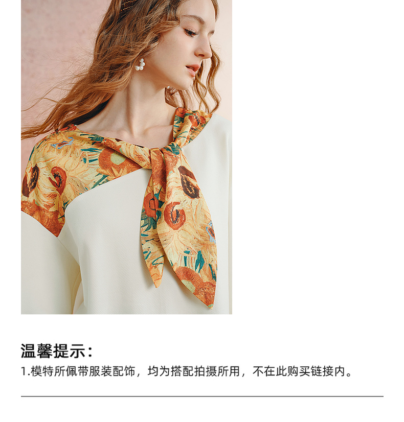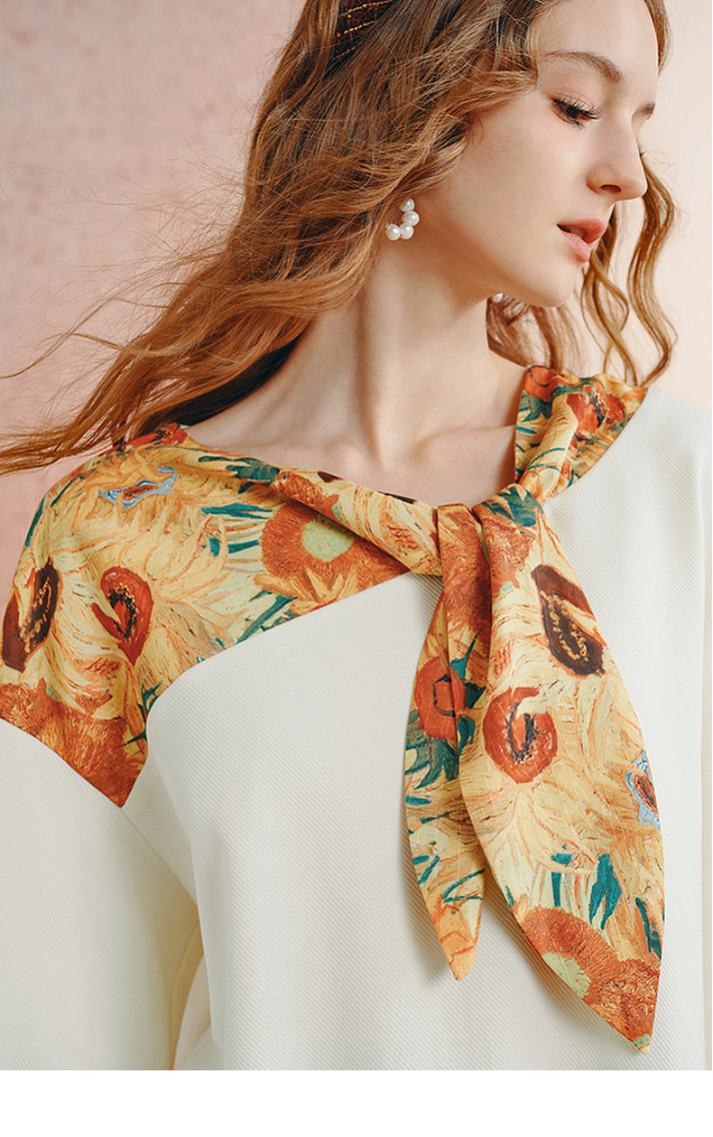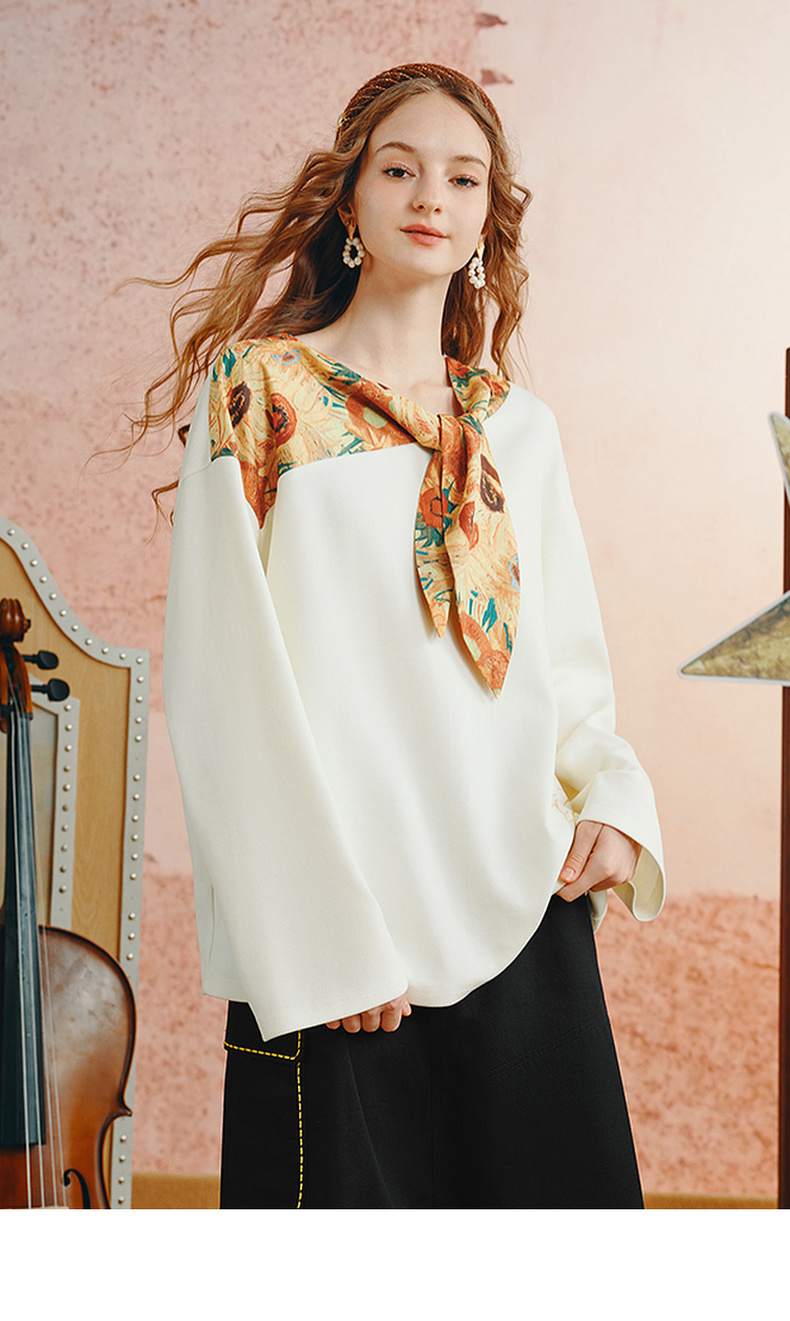 两三事梵高文艺葵野梵声2025秋新款小清新印花绑带拼接长袖t恤女