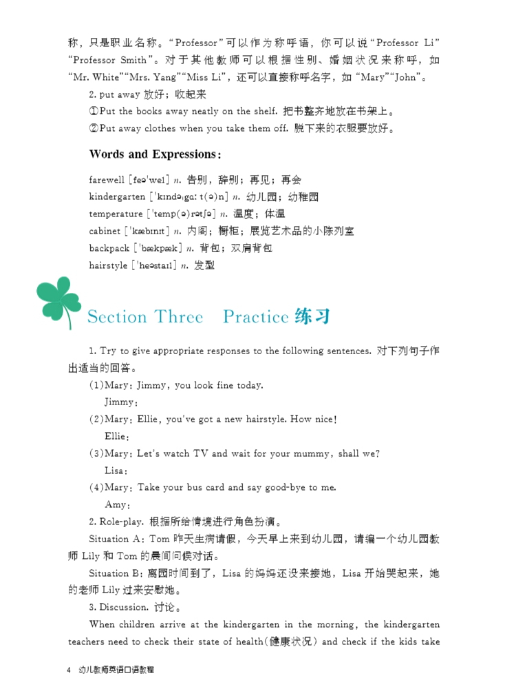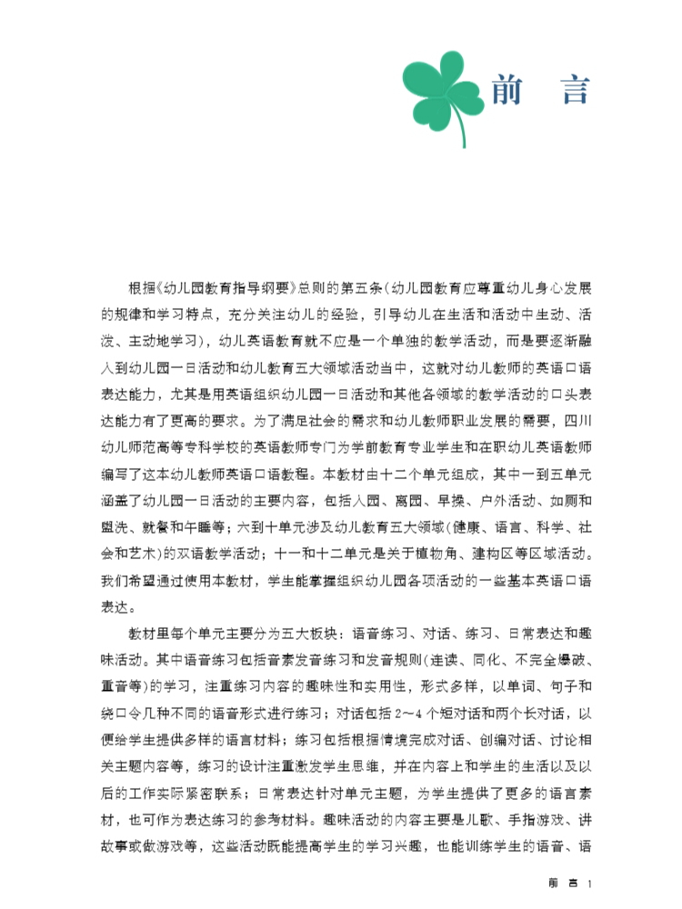 本书立足我国学前儿童英语教育发展的实际,全面体现《幼儿园教师专业标准(试行)》《3—6岁儿童学习与发展指南》的精神。以切实夯实学生的综合素质,增强学前儿童英语教师所应具备的职业能力为导向,提高从事学前英语教育的教师自身英语口语水平。本书既可以作为教材,也可以作为学前教育专业职后培训教材,对于需要提高自身口语的教师也有一定的参考作用。