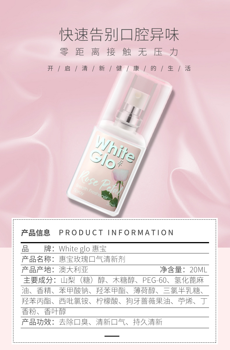 惠宝在澳洲当地卖的很火爆!是澳洲蕞负盛名的口腔护理品牌之一,迄今已有25年历史,同时获得ADA口腔认证!这款口腔喷雾官F活动价也要20+!20ml随身装,放在包包内部不占空间,随时随地清新口气,不可多得的大牛货,①定要珍惜!