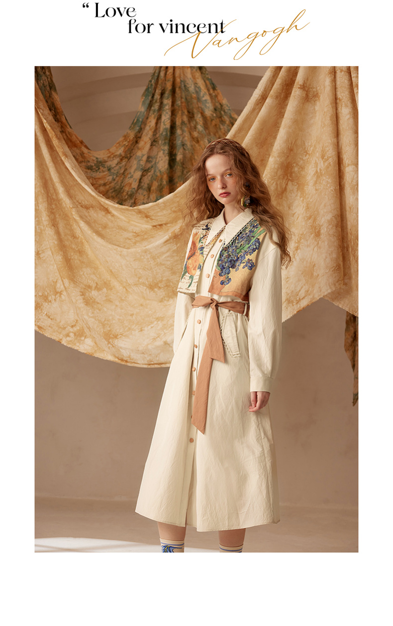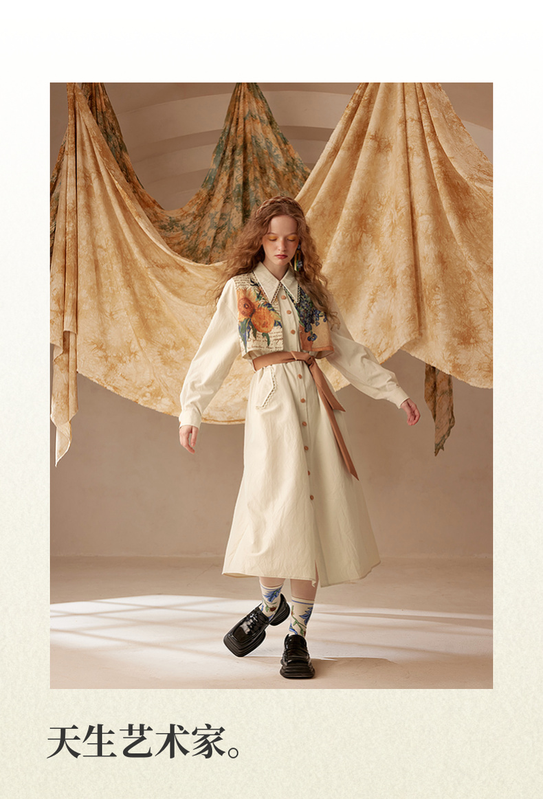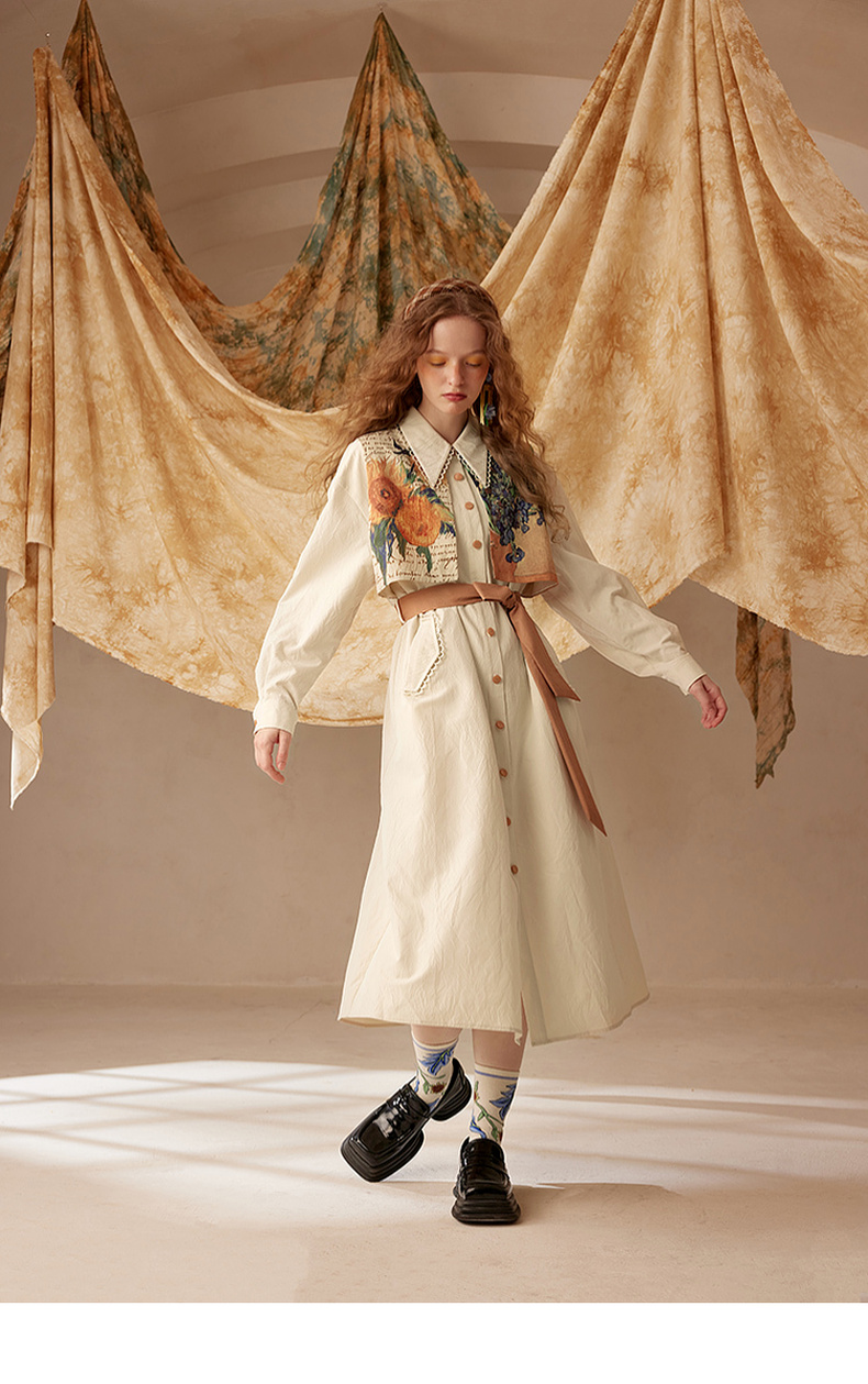 两三事梵高文艺天生艺术家印花拼接假两件绑带连衣裙