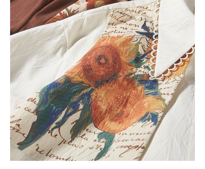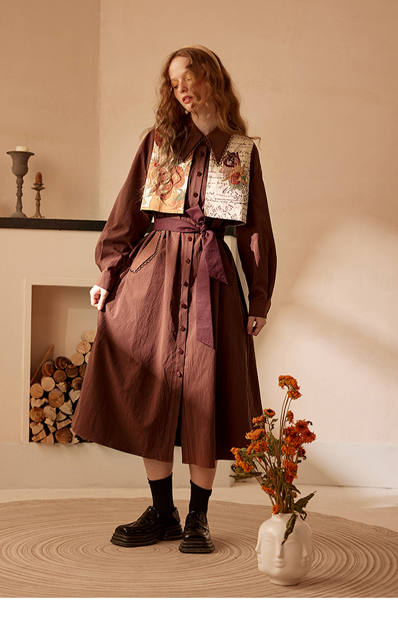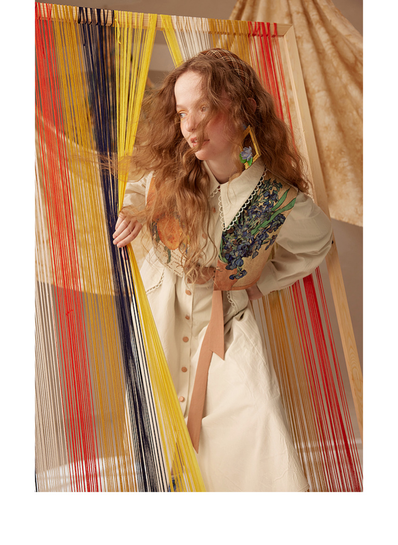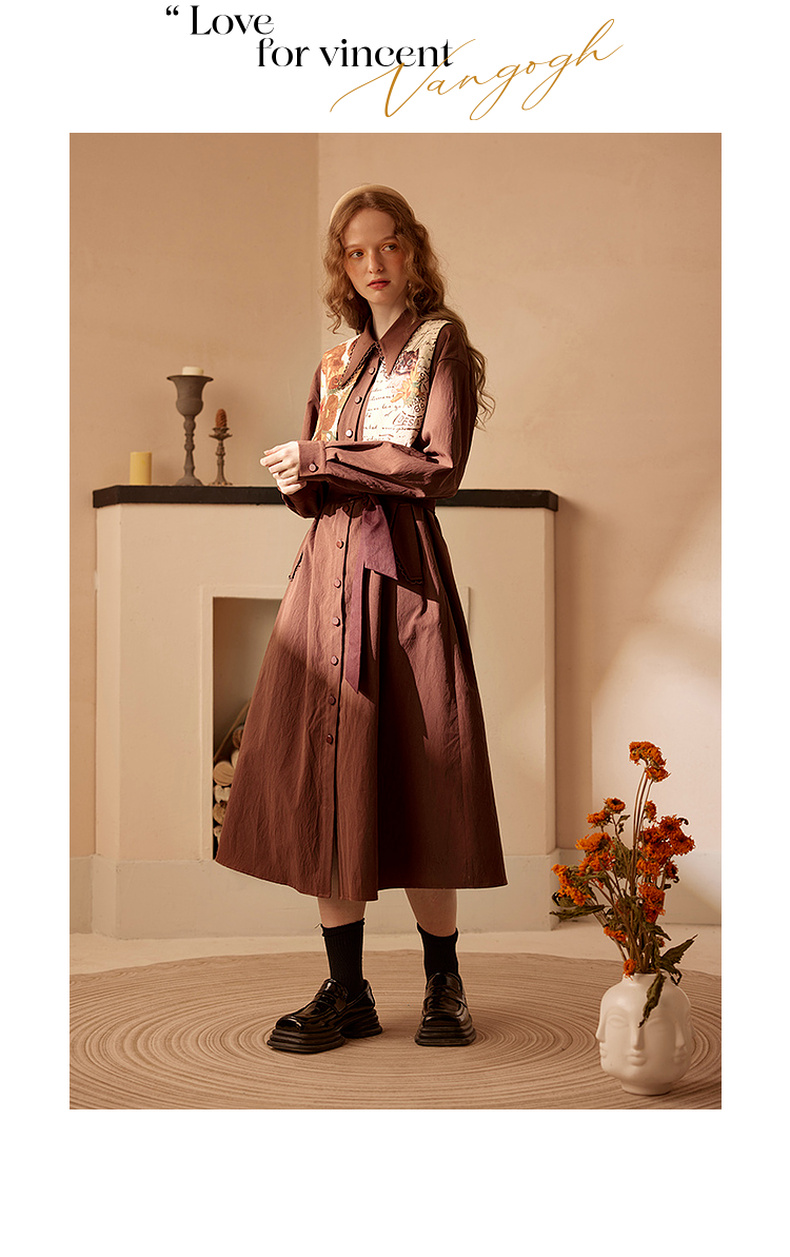 两三事梵高文艺天生艺术家印花拼接假两件绑带连衣裙