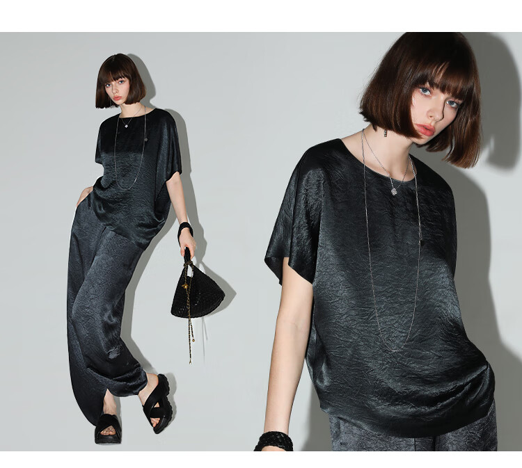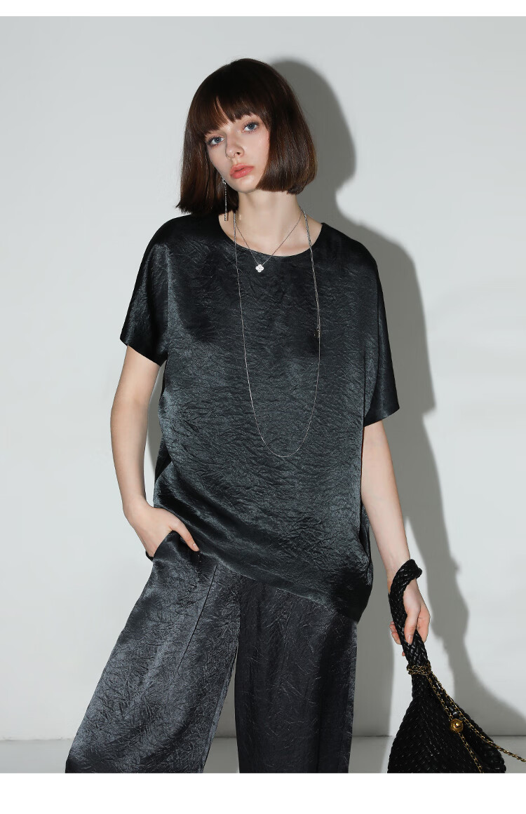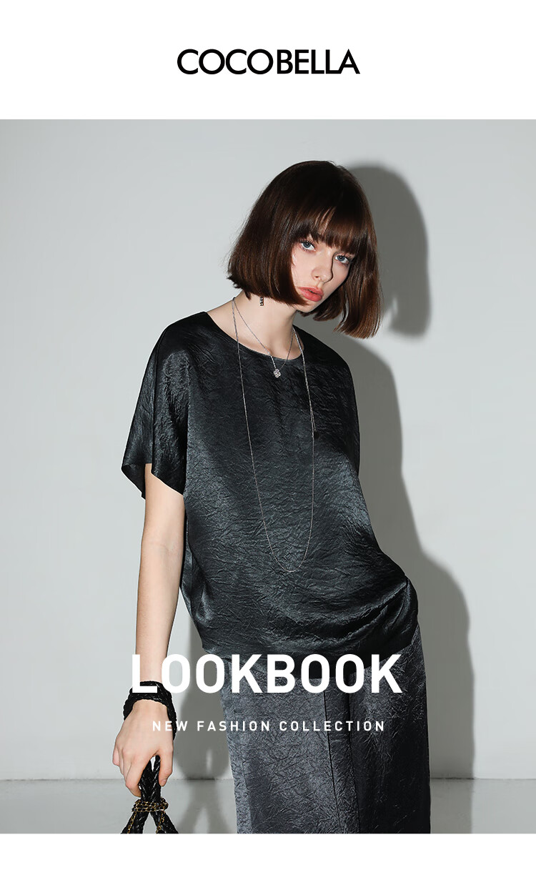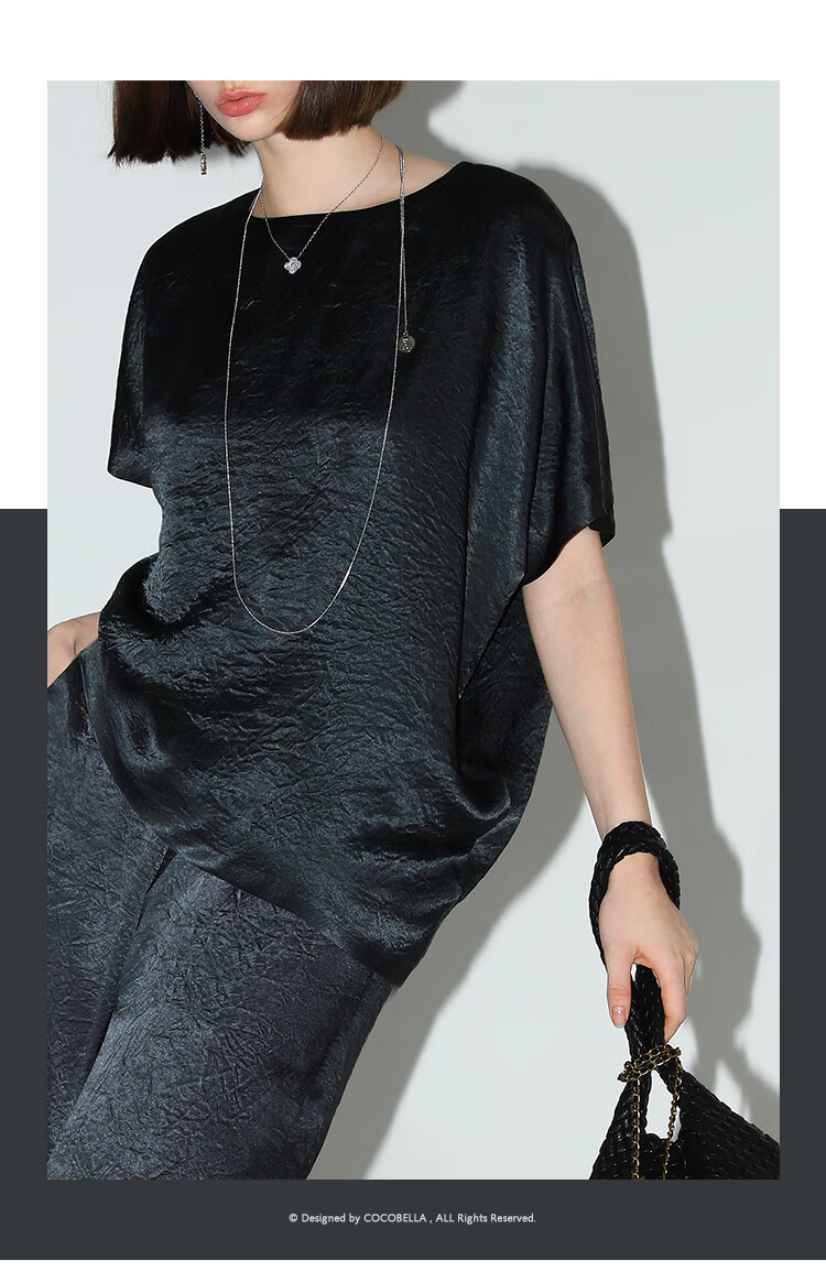 COCOBELLA[100%醋酸]奢感褶皱肌理垂坠凉感斜摆短袖T恤TS7055