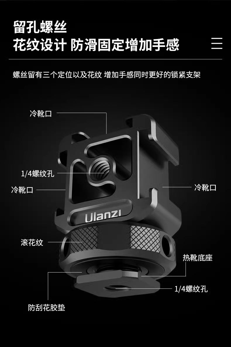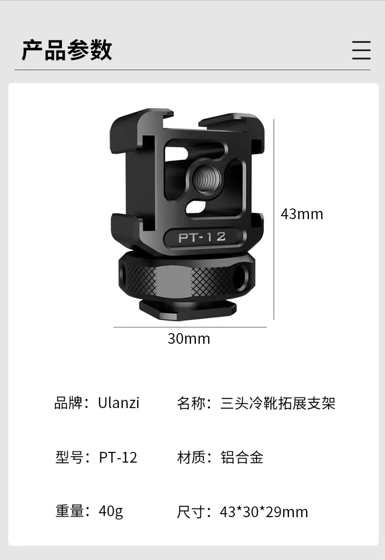 Ulanzi PT-12三头热靴拓展支架底座单反相机拍照vlog视频冷靴拓展补光灯麦克风监视器摄影机配件金属云台支架